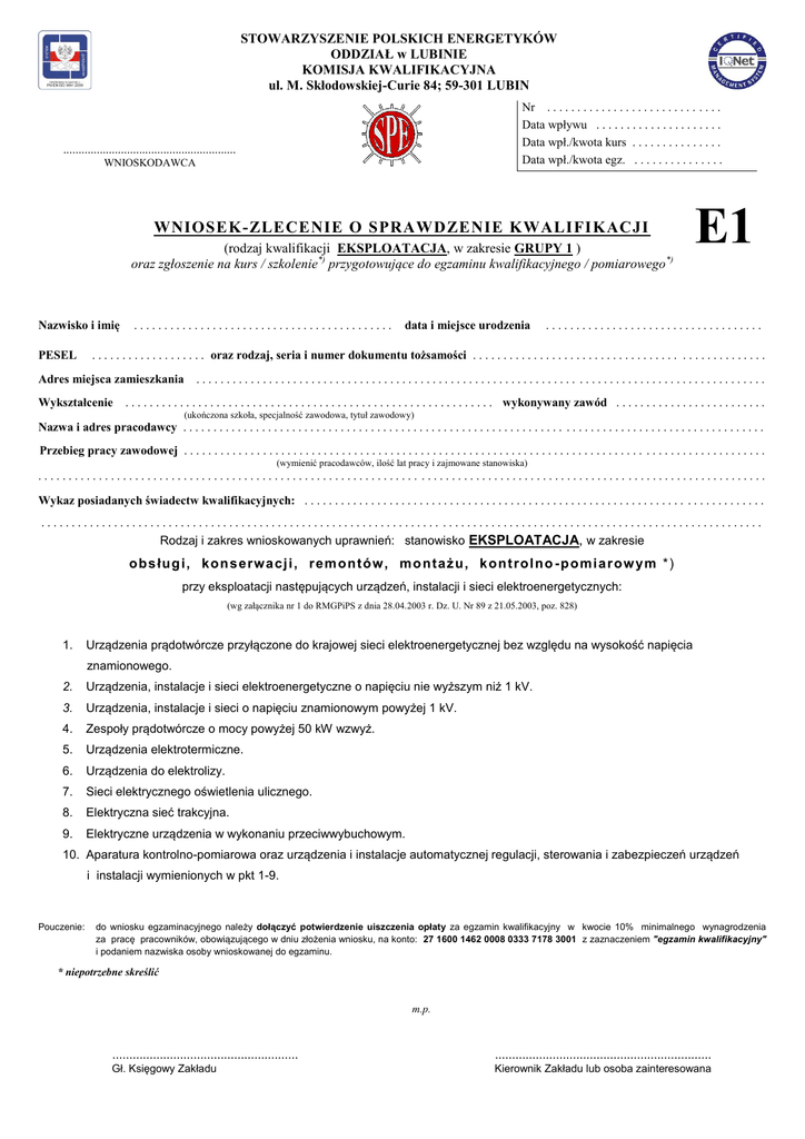 STOWARZYSZENIE POLSKICH ENERGETYKÓW ODDZIAŁ w LUBINIE KOMISJA KWALIFIKACYJNA ul. M. Skłodowskiej-Curie 84; 59-301 LUBIN Nr . . . . . . . . . . . . . . . . . . . . . . . . . . . . . Data wpływu . . . . . . . . . . . . . . . . . . . . . Data wpł./kwota kurs . . . . . . . . . . . . . . . Data wpł./kwota egz. . . . . . . . . . . . . . . . ......................................................... WNIOSKODAWCA WNIOSEK-ZLECENIE O SPRAWDZENIE KWALIFIKACJI (rodzaj kwalifikacji EKSPLOATACJA, w zakresie GRUPY 1 ) oraz zgłoszenie na kurs / szkolenie*) przygotowujące do egzaminu kwalifikacyjnego / pomiarowego *) Nazwisko i imię PESEL ........................................... data i miejsce urodzenia E1 .................................... . . . . . . . . . . . . . . . . . . . oraz rodzaj, seria i numer dokumentu tożsamości . . . . . . . . . . . . . . . . . . . . . . . . . . . . . . . . . . . . . . . . . . . . . . . . Adres miejsca zamieszkania Wykształcenie ............................................................... ............................... . . . . . . . . . . . . . . . . . . . . . . . . . . . . . . . . . . . . . . . . . . . . . . . . . . . . . . . . . . . . . wykonywany zawód . . . . . . . . . . . . . . . . . . . . . . . . . (ukończona szkoła, specjalność zawodowa, tytuł zawodowy) Nazwa i adres pracodawcy . . . . . . . . . . . . . . . . . . . . . . . . . . . . . . . . . . . . . . . . . . . . . . . . . . . . . . . . . . . . . . . . . . . . . . . . . . . . . . . . . . . . . . . . . . . . . . . . Przebieg pracy zawodowej . . . . . . . . . . . . . . . . . . . . . . . . . . . . . . . . . . . . . . . . . . . . . . . . . . . . . . . . . . . . . . . . . . . . . . . . . . . . . . . . . . . . . . . . . . . . . . . . (wymienić pracodawców, ilość lat pracy i zajmowane stanowiska) ............................................................... .................................. ....................... Wykaz posiadanych świadectw kwalifikacyjnych: . . . . . . . . . . . . . . . . . . . . . . . . . . . . . . . . . . . . . . . . . . . . . . . . . . . . . . . . . . . . . . . . . . . . . . . . . . . . .................................................................. ..................................................... Rodzaj i zakres wnioskowanych uprawnień: stanowisko EKSPLOATACJA, w zakresie obs ług i, kon s erw a cj i , r em ontów , mo ntaż u, k ont rol no - p omi a r ow ym *) przy eksploatacji następujących urządzeń, instalacji i sieci elektroenergetycznych: (wg załącznika nr 1 do RMGPiPS z dnia 28.04.2003 r. Dz. U. Nr 89 z 21.05.2003, poz. 828) 1. Urządzenia prądotwórcze przyłączone do krajowej sieci elektroenergetycznej bez względu na wysokość napięcia znamionowego. 2. Urządzenia, instalacje i sieci elektroenergetyczne o napięciu nie wyższym niż 1 kV. 3. Urządzenia, instalacje i sieci o napięciu znamionowym powyżej 1 kV. 4. Zespoły prądotwórcze o mocy powyżej 50 kW wzwyż. 5. Urządzenia elektrotermiczne. 6. Urządzenia do elektrolizy. 7. Sieci elektrycznego oświetlenia ulicznego. 8. Elektryczna sieć trakcyjna. 9. Elektryczne urządzenia w wykonaniu przeciwwybuchowym. 10. Aparatura kontrolno-pomiarowa oraz urządzenia i instalacje automatycznej regulacji, sterowania i zabezpieczeń urządzeń i instalacji wymienionych w pkt 1-9. Pouczenie: do wniosku egzaminacyjnego należy dołączyć potwierdzenie uiszczenia opłaty za egzamin kwalifikacyjny w kwocie 10% minimalnego wynagrodzenia za pracę pracowników, obowiązującego w dniu złożenia wniosku, na konto: 27 1600 1462 0008 0333 7178 3001 z zaznaczeniem "egzamin kwalifikacyjny" i podaniem nazwiska osoby wnioskowanej do egzaminu. * niepotrzebne skreślić m.p. ....................................................... ................................................................ Gł. Księgowy Zakładu Kierownik Zakładu lub osoba zainteresowana ....................................... dnia ....................... KOMISJA KWALIFIKACYJNA NR 654 przy STOWARZYSZENIU POLSKICH ENERGETYKÓW ODDZIAŁ w LUBINIE ul. M. Skłodowskiej-Curie 84; LUBIN PROTOKÓŁ EGZA MINU NR E1 - ............. / ....... na stwierdzenie kwalifikacji osoby zajmującej się eksploatacją urządzeń, instalacji i sieci na stanowisku EKSPLOATACJI, zgodnie z rozporządzeniem Ministra Gospodarki, Pracy i Polityki Społecznej z dnia 28.04.2003 r. (Dz. U. Nr 89, poz. 89) Nazwisko i imię . . . . . . . . . . . . . . . . . . . . . . . . . . . . . . . . . . . . . . . . . . . . . . . . . . . . . . . . . PESEL Tożsamość ustalono na podstawie . . . . . . . . . . . . . . . . . . . . . . . . . . . . . . . . . . . . . . . . . . . .......................... (seria, nr dokumentu) (podpis) Sprawdzono znajomość następującej tematyki: a) zasad budowy, działania oraz warunków technicznych obsługi urządzeń, instalacji i sieci, b) zasad eksploatacji oraz instrukcji eksploatacji urządzeń, instalacji i sieci, c) zasad i warunków wykonywania prac kontrolno-pomiarowych i montażowych, d) zasad i wymagań bezpieczeństwa pracy i ochrony przeciwpożarowej oraz umiejętności udzielania pierwszej pomocy, e) instrukcji postępowania w razie awarii, pożaru lub innego zagrożenia bezpieczeństwa obsługi urządzeń lub zagrożenia życia, zdrowia i środowiska, dla niżej określonych rodzajów urządzeń, instalacji i sieci elektroenergetycznych: GRUPA 1. Sieci, urządzenia i instalacje elektroenergetyczne wytwarzające, przesyłające i zużywające energię elektryczną: 1. urządzenia prądotwórcze przyłączone do krajowej sieci elektroenergetycznej bez względu na napięcie znamionowe w zakresie: o mocy do ............... MV A 2. urządzenia, instalacje i sieci elektroenergetyczne o napięciu nie wyższym niż 1 kV. 3. sieci, urządzenia i instalacje o napięciu znamionowym powyżej 1 kV. 4. zespoły prądotwórcze o mocy powyżej 50 kW wzwyż. 5. urządzenia elektrotermiczne. 6. urządzenia do elektrolizy. 7. sieci elektrycznego ośw