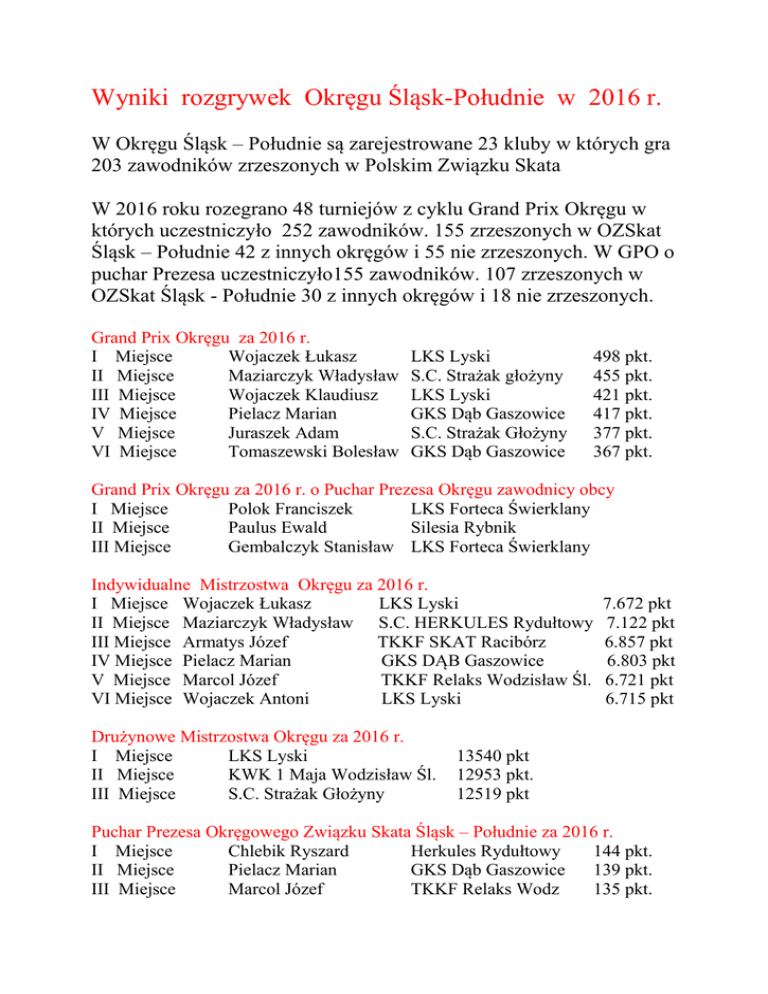 Wyniki rozgrywek Okręgu Śląsk-Południe w 2016 r. W Okręgu Śląsk – Południe są zarejestrowane 23 kluby w których gra 203 zawodników zrzeszonych w Polskim Związku Skata W 2016 roku rozegrano 48 turniejów z cyklu Grand Prix Okręgu w których uczestniczyło 252 zawodników. 155 zrzeszonych w OZSkat Śląsk – Południe 42 z innych okręgów i 55 nie zrzeszonych. W GPO o puchar Prezesa uczestniczyło155 zawodników. 107 zrzeszonych w OZSkat Śląsk - Południe 30 z innych okręgów i 18 nie zrzeszonych. Grand Prix Okręgu za 2016 r. I Miejsce Wojaczek Łukasz II Miejsce Maziarczyk Władysław III Miejsce Wojaczek Klaudiusz IV Miejsce Pielacz Marian V Miejsce Juraszek Adam VI Miejsce Tomaszewski Bolesław LKS Lyski S.C. Strażak głożyny LKS Lyski GKS Dąb Gaszowice S.C. Strażak Głożyny GKS Dąb Gaszowice 498 pkt. 455 pkt. 421 pkt. 417 pkt. 377 pkt. 367 pkt. Grand Prix Okręgu za 2016 r. o Puchar Prezesa Okręgu zawodnicy obcy I Miejsce Polok Franciszek LKS Forteca Świerklany II Miejsce Paulus Ewald Silesia Rybnik III Miejsce Gembalczyk Stanisław LKS Forteca Świerklany Indywidualne Mistrzostwa Okręgu za 2016 r. I Miejsce Wojaczek Łukasz LKS Lyski II Miejsce Maziarczyk Władysław S.C. HERKULES Rydułtowy III Miejsce Armatys Józef TKKF SKAT Racibórz IV Miejsce Pielacz Marian GKS DĄB Gaszowice V Miejsce Marcol Józef TKKF Relaks Wodzisław Śl. VI Miejsce Wojaczek Antoni LKS Lyski Drużynowe Mistrzostwa Okręgu za 2016 r. I Miejsce LKS Lyski II Miejsce KWK 1 Maja Wodzisław Śl. III Miejsce S.C. Strażak Głożyny 7.672 pkt 7.122 pkt 6.857 pkt 6.803 pkt 6.721 pkt 6.715 pkt 13540 pkt 12953 pkt. 12519 pkt Puchar Prezesa Okręgowego Związku Skata Śląsk – Południe za 2016 r. I Miejsce Chlebik Ryszard Herkules Rydułtowy 144 pkt. II Miejsce Pielacz Marian GKS Dąb Gaszowice 139 pkt. III Miejsce Marcol Józef TKKF Relaks Wodz 135 pkt. IV Miejsce V Miejsce VI Miejsce Maziarczyk Władysław S.C. Strażak Głożyny Wojaczek Klaudiusz LKS Lyski Armatys Józef TKKF Racibórz 129 pkt. 126 pkt 105 pkt Grand Prix Okręgu za 2016 r. zawodnicy obcy I Miejsce Polok Franciszek LKS Forteca Świerklany II Miejsce Gajda Bolesław LKS Forteca Świerklany III Miejsce Paulus Ewald Silesia Rybnik Najlepsi zawodnicy ligi okręgowej za 2016 r. I Miejsce Neuman Tadeusz KS Polonia Niewiadom II Miejsce Mainka Henryk Emeryt Kobyla III Miejsce Wala Eugeniusz LKS Górki Śl. 13540 pkt. 12575 pkt. 12355 pkt. Wyróżnienie Prezesa Okręgowego Związku Skata Śląsk - Południe. Przynicki Rajnard LKS Górki Śląskie Gajda Monika FORTECA Świerklany Szulik Grzegorz LKS Górki Śląskie Awans do II ligi w 2016 roku. S.C. Herkules Rydułtowy Spadek z III ligi w 2016 roku KWK 1 maja Wodzisław Śl. Gorki Połomia II KS Naprzód Czyżowice Awans do III ligi w 2016 roku KS Czarni Krzyżkowice KS Przyszłość Rogów KS Czarni Gorzyce Wyróżnienie za całokształt pracy na rzecz okręgu Cegiełka Józef II V-ce mistrz GPP za 2015 rok w kategorii Senior Maziarczyk Władysław I miejsce GPP za 2015 rok kategoria junior Wojaczek Łukasz Mistrz Polski za 2015 rok w kategorii junior Wojaczek Łukasz Zakwalifikowani do IMP kategoria ogólna Juraszek Adam dzika karta Mistrz GPO Armatys Józef dzika karta III Indywidualny Mistrz Okręgu Wojaczek Grzegorz dzika karta członek Zarządu Dzika karta Maziarczyk Władysław ogólna Dutkiewicz Edward ogólna Niewrzoł Arkadiusz ogólna Pielacz Marian ogólna Balcar Krystian ogólna Tomaszewski Bolesław ogólna Wojaczek Łukasz ogólna Wojaczek Klaudiusz ogólna Biernat Wiesław ogólna Pielacz Wojciech ogólna Daniluk Kazimierz ogólna Zakwalifikowani do IMP kategoria senior Maziarczyk Władysław Senior Dutkiewicz Edward Senior Balcar Krystian Senior Daniluk Kazimierz Senior Cegiełka Józef Senior Stroiński Włodzimierz Senior Przynicki Rajnard Senior Latocha Eugeniusz Senior Menzyk Erwin dzika karta