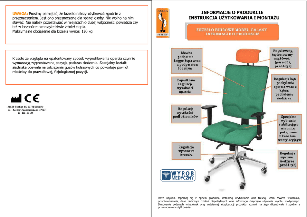 UWAGA: Prosimy pamiętać, że krzesło należy użytkować zgodnie z przeznaczeniem. Jest ono przeznaczone dla jednej osoby. Nie wolno na nim stawać. Nie należy pozostawiać w miejscach o dużej wilgotności powietrza czy też w bezpośrednim sąsiedztwie źródeł ciepła. Maksymalne obciążenie dla krzesła wynosi 130 kg. INFORMACJE O PRODUKCIE INSTRUKCJA UŻYTKOWANIA I MONTAŻU Krzesło ze względu na opatentowany sposób wyprofilowania oparcia czynnie wymuszają wyprostowaną pozycję podczas siedzenia. Specjalny kształt siedziska pozwala na odciążenie guzów kulszowych co powoduje powrót miednicy do prawidłowej, fizjologicznej pozycji. Przed użyciem zapoznaj się z opisem produktu, instrukcją użytkowania oraz treścią, która zawiera wskazania, przeciwwskazania, dane dotyczące działań niepożądanych oraz informacje dotyczące używania wyrobu medycznego. Stosowanie podanych wskazówek przy codziennej eksploatacji produktu pozwoli na jego długotrwałe i zgodne z przeznaczeniem użytkowania Wytwórca: Gabinet Terapii Manualnej i Bioenergoterapii KULIK-SYSTEM®, PL 31-514 Kraków, ul. Beliny-Prażmowskiego 17/13; Biuro Handlowe KULIK-SYSTEM®, ul. Kasprowicza 32, tel./fax 124112223, tel. 124112232, www.kuliksystem.com e-mail: [email protected]. Zalecenia: Zaleca się stosowanie produktu w celu prawidłowego ułożenia kręgosłupa na całej długości, jak również zmniejszenia ryzyka powstawania nowych schorzeń kręgosłupa oraz łagodzenia już istniejących. Zaleca się w szczególności: prostata, hemoroidy, lumbago, zespoły bólowokorzeniowe (rwa kulszowa, nerwoból międzyżebrowy i zapalenie nerwów międzyżebrowych, rwa barkowa), zespoły bólowe naczyniowo-ruchowe (np. migreny), zniekształcenia kręgosłupa (plecy okrągłe), powiększona kifoza, kręgozmyk, zniekształcenia szyi, zniekształcenia klatki piersiowej (klatka piersiowa lejkowata, klatka piersiowa kurza), w niektórych chorobach zwyrodnieniowych stawów kręgosłupa. Profilaktycznie zalecana osobom chcącym uniknąć dolegliwości bólowych i zmian zwyrodnieniowych kręgosłupa. Przeciwwskazania: Uczulenie na którykolwiek ze składników produktu, skolioza patologiczna, skolioza strukturalna trzeciego stopnia, powiększona lordoza. Przy zniesionej kifozie należy używać tylko siedziska. Osobom mającym inne schorzenia kręgosłupa lub w razie pojawienia się jakichkolwiek wątpliwości zaleca się konsultacje u lekarza specjalisty lub chiropraktyka. Przeciwwskazania dla kobiet w ciąży: Zaleca się. Zalecany czas stosowania: Bez ograniczeń. Sposób czyszczenia i suszenia: Czyścić ręcznie środkami chemicznymi powszechnego użytku; temperatura płynów nie wyższa niż 30°C; suszyć w temperaturze pokojowej. Odporność na zmienne warunki środowiska: Chronić przed bezpośrednim wpływem warunków zewnętrznych (zamoczenie, wystawianie na słońce, długotrwały wpływ mrozu). Wyrób medyczny. Deklaracja zgodności: WM/RWM/410/07000789[MS]-Krzesło profilaktyczno-rehabilitacyjne, asortyment według załącznika Telefon w sprawie reklamacji: +48 12 411 22 23, +48 604 466 900 1. Zamocować oparcie do siedziska, odchylając plastikową osłonę oparcia. Nie ma możliwości ponownego ściągnięcia oparcia. 2. Kółka wcisnąć w otwory podstawy (5 szt.) 3. Wciśnij amortyzator w otwór podstawy 4. Nałóż siedzisko z oparciem, wraz z mechanizmem fotela na amortyzator, lekko dociskając.