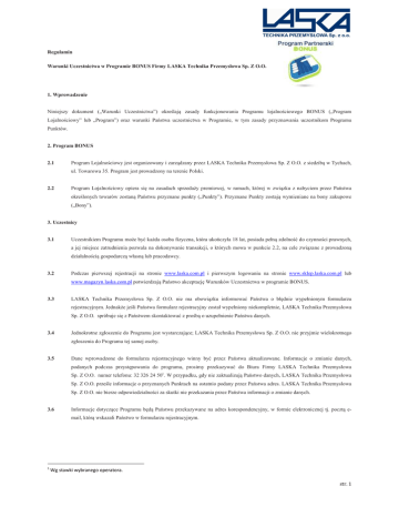 Regulamin Warunki Uczestnictwa w Programie BONUS Firmy LASKA Technika Przemysłowa Sp. Z O.O. 1. Wprowadzenie Niniejszy dokument („Warunki Uczestnictwa”) określają zasady funkcjonowania Programu lojalnościowego BONUS („Program Lojalnościowy” lub „Program”) oraz warunki Państwa uczestnictwa w Programie, w tym zasady przyznawania uczestnikom Programu Punktów. 2. Program BONUS 2.1 Program Lojalnościowy jest organizowany i zarządzany przez LASKA Technika Przemysłowa Sp. Z O.O. z siedzibą w Tychach, ul. Towarowa 35. Program jest prowadzony na terenie Polski. 2.2 Program Lojalnościowy opiera się na zasadach sprzedaży premiowej, w ramach, której w związku z nabyciem przez Państwa określonych towarów zostaną Państwu przyznane punkty („Punkty”). Przyznane Punkty zostają wymieniane na bony zakupowe („Bony”). 3. Uczestnicy 3.1 Uczestnikiem Programu może być każda osoba fizyczna, która ukończyła 18 lat, posiada pełną zdolność do czynności prawnych, a jej miejsce zatrudnienia pozwala na dokonywanie transakcji, o których mowa w punkcie 2.2, na cele związane z prowadzoną działalnością gospodarczą własną lub pracodawcy. 3.2 Podczas pierwszej rejestracji na stronie www.laska.com.pl i pierwszym logowaniu na stronie www.sklep.laska.com.pl lub www.magazyn.laska.com.pl potwierdzają Państwo akceptację Warunków Uczestnictwa w programie BONUS. 3.3 LASKA Technika Przemysłowa Sp. Z O.O. nie ma obowiązku informować Państwa o błędnie wypełnionym formularzu rejestracyjnym. Jednakże jeśli Państwa formularz rejestracyjny został wypełniony niekompletnie, LASKA Technika Przemysłowa Sp. Z O.O. spróbuje się z Państwem skontaktować z prośbą o uzupełnienie Państwa danych. 3.4 Jednokrotne zgłoszenie do Programu jest wystarczające; LASKA Technika Przemysłowa Sp. Z O.O. nie przyjmie wielokrotnego zgłoszenia do Programu tej samej osoby. 3.5 Dane wprowadzone do formularza rejestracyjnego winny być przez Państwa aktualizowane. Informacje o zmianie danych, podanych podczas przystępowania do programu, prosimy przekazywać do Biura Firmy LASKA Technika Przemysłowa Sp. Z O.O. numer telefonu: 32 326 24 501. W przypadku, gdy nie zaktualizują Państwo danych, LASKA Technika Przemysłowa Sp. Z O.O. prześle informacje o przyznanych Punktach na ostatnio podany przez Państwa adres. LASKA Technika Przemysłowa Sp. Z O.O. nie bierze odpowiedzialności za skutki nie przekazania przez Państwa informacji o zmianie danych. 3.6 Informacje dotyczące Programu będą Państwu przekazywane na adres korespondencyjny, w formie elektronicznej tj. pocztą email, którą wskazali Państwo w formularzu rejestracyjnym. 1 Wg stawki wybranego operatora. str. 1 4. Przyznawanie Punktów 4.1 W związku z nabywaniem określonych towarów, zostaną Państwu przyznane Punkty. Informacja o ilości przyznawanych Punktów jest dostępna przy użyciu własnego Loginu i Hasła na stronie internetowej Programu. 4.2 Punkty są dodawane do indywidualnego konta Uczestnika Programu maksymalnie w ciągu 3 dni roboczych, po zarejestrowaniu faktu zapłacenia za towar. 4.3 Punkty nie podlegają wymianie na pieniądze. 4.4 LASKA 4.5 LASKA Technika Przemysłowa Sp. Z O.O. ma prawo do zmniejszenia ilości przyznanych punktów w momencie zwrotu Technika Przemysłowa Sp. Z O.O. określa za jakie towary będą przyznawane Punkty. zakupionego towaru. Liczba pomniejszonych punktów jest zgodna z liczba punktów za zwrócony towar. 4.6 Aby uzyskać Punkty powinni Państwo zamówić towary będące na magazynie Firmy LASKA Technika Przemysłowa Sp. Z O.O. na stronie www.sklep.laska.com.pl lub www.magazyn.laska.com.pl i dokonać płatności za towar. Firma LASKA Technika Przemysłowa Sp. Z O.O. zastrzega sobie możliwość dokonywania identyfikacji uczestników Programu po zakończeniu procesu realizacji zapłaty. 4.7 Jeżeli zrezygnują Państwo z nabycia towarów lub usług, za które zostały Państwu przyznane Punkty, np. gdy odstąpią Państwo od zakupu towaru lub uchylą się od skutków prawnych związanych z dokonaniem płatności, Firma LASKA Technika Przemysłowa Sp. Z O.O. zastrzega sobie prawo do cofnięcia przyznanych Państwu Punktów. To samo dotyczy przypadków nadużyć lub błędnego zaksięgowania transakcji. 5. Stan Konta BONUS 5.1 Przyznane Państwu Punkty są zapisywane na Państwa indywidualnym elektronicznym koncie prowadzonym i zarządzanym przez Firmę LASKA Technika Przemysłowa Sp. Z O.O. („Konto”). Aktualny stan Konta mogą Państwo sprawdzić na stronie internetowej Programu. 5.2 Zastrzeżenia dotyczące nieprawidłowości lub niekompletności stanu Konta muszą zostać przekazane w formie pisemnej do Firmy LASKA Technika Przemysłowa Sp. Z O.O. najpóźniej w ciągu 30 dni po stwierdzeniu niezgodności. Do zastrzeżeń należy dołączyć odpowiednie kopie Faktur otrzymane od Firmy LASKA Technika Przemysłowa Sp. Z O.O. w związku z nabyciem towarów, za które przyznane zostały Punkty. Państwa zastrzeżenia zostaną rozpatrzone przez Firmę LASKA Technika Przemysłowa Sp. Z O.O. w terminie do 30 dni. Brak zastrzeżeń uznaje się za potwierdzenie stanu Konta. 6. Wymiana Punktów na Bony 6.1 Wymiana Punktów na Bony możliwa jest gdy stan Konta wynosi, co najmniej 2000 (dwa tysiące) Punktów. Maksymalna liczba Punktów która jest wymieniana na bony i jest wolna od podatku wynika z art. 21 ust. 1 pkt. 68 ustawy „o podatku dochodowym od osób fizycznych” i wg stanu prawnego z czerwca 2009 odpowiada 76000 Punktom. Maksymalna liczba Punktów która może być jednorazowo wymieniona na bony odpowiada 76000 Punktom. Punkty są wymieniane na bony wyłącznie na prośbę Uczestnika Programu. 6.2 W przypadku zmiany prawa Firma LASKA Technika Przemysłowa Sp. Z O.O. zastrzega możliwość zmiany liczby punktów, która jest jednorazowo wymieniana na bony i jest wolna od podatku. Powyższe nie wymaga powiadomienia Uczestnika i nie stanowi zmiany niniejszych War