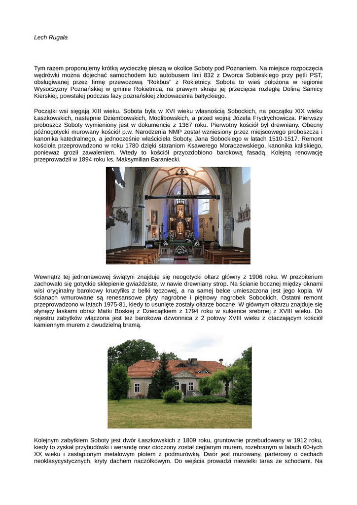 Lech Rugała Tym razem proponujemy krótką wycieczkę pieszą w okolice Soboty pod Poznaniem. Na miejsce rozpoczęcia wędrówki można dojechać samochodem lub autobusem linii 832 z Dworca Sobieskiego przy pętli PST, obsługiwanej przez firmę przewozową "Rokbus" z Rokietnicy. Sobota to wieś położona w regionie Wysoczyzny Poznańskiej w gminie Rokietnica, na prawym skraju jej przecięcia rozległą Doliną Samicy Kierskiej, powstałej podczas fazy poznańskiej zlodowacenia bałtyckiego. Początki wsi sięgają XIII wieku. Sobota była w XVI wieku własnością Sobockich, na początku XIX wieku Łaszkowskich, następnie Dziembowskich, Modlibowskich, a przed wojną Józefa Frydrychowicza. Pierwszy proboszcz Soboty wymieniony jest w dokumencie z 1367 roku. Pierwotny kościół był drewniany. Obecny późnogotycki murowany kościół p.w. Narodzenia NMP został wzniesiony przez miejscowego proboszcza i kanonika katedralnego, a jednocześnie właściciela Soboty, Jana Sobockiego w latach 1510-1517. Remont kościoła przeprowadzono w roku 1780 dzięki staraniom Ksawerego Moraczewskiego, kanonika kaliskiego, ponieważ groził zawaleniem. Wtedy to kościół przyozdobiono barokową fasadą. Kolejną renowację przeprowadził w 1894 roku ks. Maksymilian Baraniecki. Wewnątrz tej jednonawowej świątyni znajduje się neogotycki ołtarz główny z 1906 roku. W prezbiterium zachowało się gotyckie sklepienie gwiaździste, w nawie drewniany strop. Na ścianie bocznej między oknami wisi oryginalny barokowy krucyfiks z belki tęczowej, a na samej belce umieszczona jest jego kopia. W ścianach wmurowane są renesansowe płyty nagrobne i piętrowy nagrobek Sobockich. Ostatni remont przeprowadzono w latach 1975-81, kiedy to usunięte zostały ołtarze boczne. W głównym ołtarzu znajduje się słynący łaskami obraz Matki Boskiej z Dzieciątkiem z 1794 roku w sukience srebrnej z XVIII wieku. Do rejestru zabytków włączona jest też barokowa dzwonnica z 2 połowy XVIII wieku z otaczającym kościół kamiennym murem z dwudzielną bramą. Kolejnym zabytkiem Soboty jest dwór Łaszkowskich z 1809 roku, gruntownie przebudowany w 1912 roku, kiedy to zyskał przybudówki i werandę oraz otoczony został ceglanym murem, rozebranym w latach 60-tych XX wieku i zastąpionym metalowym płotem z podmurówką. Dwór jest murowany, parterowy o cechach neoklasycystycznych, kryty dachem naczółkowym. Do wejścia prowadzi niewielki taras ze schodami. Na trójkątnym zwieńczeniu wystawki nad wejściem umieszczone są herby dawnych właścicieli: Dryja i Pomian. Dwór okala mały, zadbany park o powierzchni 1,5 ha, założony na początku XIX wieku. Na uwagę zasługują również zabudowania folwarczne z kamienia polnego i cegły. Obok folwarku, na skrzyżowaniu drogi ze Złotkowa do Golęczewa stoi stary piaskowcowy pomnik św. Wawrzyńca z XVIII wieku, ostatnio odrestaurowany. W dalszą wędrówkę udajemy się schodząc w dół wzdłuż krętej szosy, nadającej Sobocie charakteru "górskiej wsi". W miejscu, gdzie wieś się kończy dochodzimy do skrzyżowania z szeroką drogą gruntową. Tu skręcamy w prawo i oglądając widoki na łąki, pola i krawędź doliny, dochodzimy do brzegu lasu, gdzie znajduje się urokliwie położony cmentarz parafialny z Soboty. Idąc dalej wzdłuż lasu wkraczamy w Obszar Chronionego Krajobrazu Dolina Samicy Kierskiej. Po lewej mijamy leśniczówkę i miejsce odpoczynku z wiatą. Po przejściu lasem około kilometra dochodzimy do mostu na Samicy. Nie przekraczając rzeki skręcamy w prawo pod kątem ostrym i wędrujemy drogą przez las w kierunku wschodnim. Tu można zboczyć około 100 m w lewo i dojść ścieżką do malowniczego uroczyska. Po przejściu około 2 km wychodzimy na szosę prowadzącą z Zielątkowa i łagodnie pod górę, mijając po lewej zarośnięty dawny cmentarz ewangelicki i po prawej nowoczesną remizę strażacką, dochodzimy do centrum wsi Golęczewo. Golęczewo to niewielka wieś położona na północnym skraju gminy Suchy Las. Piewsza zachowana wzmianka o tej wsi pochodzi z 1313 roku, z czasów Władysława Łokietka. Golęczewo było własnością szlachecką, należącą do parafii w Sobocie. W dokumencie z 1412 roku wymieniany jest właściciel wsi, Andrzej Golęczewski. W wiekach XIV-XVIII właściciele Golęczewa często się zmieniali, toczyli długotrwałe spory, zapisywali w spadku jako wiano, przekazywali jako dłużnicy, czy też sprzedawali. W tych czasach wieś przeżywała różne wzloty i upadki. Po zniesieniu poddaństwa w XIX wieku wieś zaczęła pustoszeć. Obowiązkiem gospodarzy w tej wsi było m.in. utrzymanie drogi wiejskiej łącznie z zadrzewieniem, oraz płacenie rocznego czynszu na rzecz parafii w Sobocie. W rękach polskich właścicieli dobra golęczewskie pozostawały do 1901 roku. W 1901 roku pruska Komisja Kolonizacyjna odkupiła wieś od polskiego właściciela Zygmunta Błociszewskiego za kwotę 530 tysięcy marek. Po uporządkowaniu zaniedbanego majątku, Golęczewo wybrano jako miejsce lokalizacji „wzorcowej wsi niemieckiej” w celu osadzenia tam niemieckich kolonistów i zlecono opracowanie planu wybudowania takiej wsi królewskiemu radcy budowlanemu, Paulowi Fischerowi z Poznania. Osiedlać się tu mieli tylko Niemcy - nie katolicy i nie z pobliskich miejscowości. W latach 1901-1906 we wsi powstało kilkadziesiąt doskonale funkcjonujących gospodarstw. Powstały także budynki administracji, warsztaty rzemieślnicze, szkoła, karczma i kaplica oraz cmentarz. Przeprowadzono meliorację, uruchomiono kanalizację burzową i przeciwpowodziową, zwodociągowano wszystkie gospodarstwa, utwardzono drogi i ulice oraz ułożono chodniki. Wzdłuż dzisiejszej ulicy Dworcowej wybudowano szereg budynków reprezentujących różne style z odległych landów niemieckich. Większość z nich ustawiono niemieckim zwyczajem szczytami do ulicy. Sprowadzonych do wsi kolonistów osiedlono w gotowych - oddanych "pod klucz
