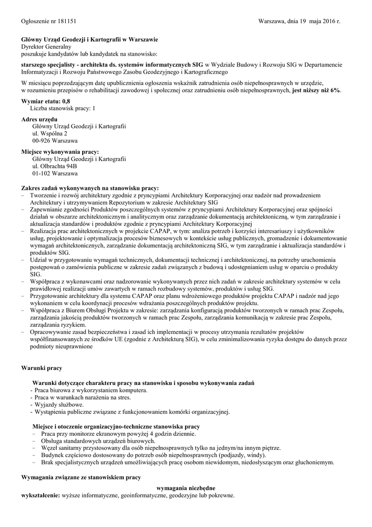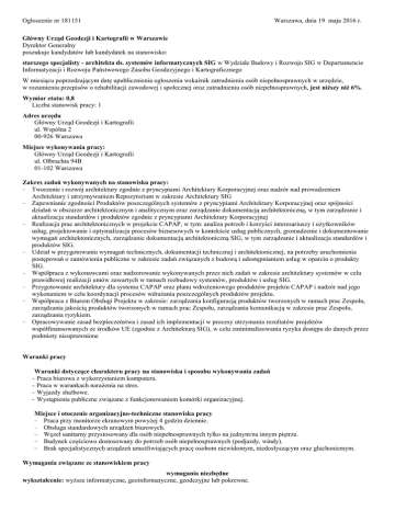 Ogłoszenie nr 181151 Warszawa, dnia 19 maja 2016 r. Główny Urząd Geodezji i Kartografii w Warszawie Dyrektor Generalny poszukuje kandydatów lub kandydatek na stanowisko: starszego specjalisty - architekta ds. systemów informatycznych SIG w Wydziale Budowy i Rozwoju SIG w Departamencie Informatyzacji i Rozwoju Państwowego Zasobu Geodezyjnego i Kartograficznego W miesiącu poprzedzającym datę upublicznienia ogłoszenia wskaźnik zatrudnienia osób niepełnosprawnych w urzędzie, w rozumieniu przepisów o rehabilitacji zawodowej i społecznej oraz zatrudnieniu osób niepełnosprawnych, jest niższy niż 6%. Wymiar etatu: 0,8 Liczba stanowisk pracy: 1 Adres urzędu Główny Urząd Geodezji i Kartografii ul. Wspólna 2 00-926 Warszawa Miejsce wykonywania pracy: Główny Urząd Geodezji i Kartografii ul. Olbrachta 94B 01-102 Warszawa Zakres zadań wykonywanych na stanowisku pracy: Tworzenie i rozwój architektury zgodnie z pryncypiami Architektury Korporacyjnej oraz nadzór nad prowadzeniem Architektury i utrzymywaniem Repozytorium w zakresie Architektury SIG − Zapewnianie zgodności Produktów poszczególnych systemów z pryncypiami Architektury Korporacyjnej oraz spójności działań w obszarze architektonicznym i analitycznym oraz zarządzanie dokumentacją architektoniczną, w tym zarządzanie i aktualizacja standardów i produktów zgodnie z pryncypiami Architektury Korporacyjnej − Realizacja prac architektonicznych w projekcie CAPAP, w tym: analiza potrzeb i korzyści interesariuszy i użytkowników usług, projektowanie i optymalizacja procesów biznesowych w kontekście usług publicznych, gromadzenie i dokumentowanie wymagań architektonicznych, zarządzanie dokumentacją architektoniczną SIG, w tym zarządzanie i aktualizacja standardów i produktów SIG. − Udział w przygotowaniu wymagań technicznych, dokumentacji technicznej i architektonicznej, na potrzeby uruchomienia postępowań o zamówienia publiczne w zakresie zadań związanych z budową i udostępnianiem usług w oparciu o produkty SIG. − Współpraca z wykonawcami oraz nadzorowanie wykonywanych przez nich zadań w zakresie architektury systemów w celu prawidłowej realizacji umów zawartych w ramach rozbudowy systemów, produktów i usług SIG. − Przygotowanie architektury dla systemu CAPAP oraz planu wdrożeniowego produktów projektu CAPAP i nadzór nad jego wykonaniem w celu koordynacji procesów wdrażania poszczególnych produktów projektu. − Współpraca z Biurem Obsługi Projektu w zakresie: zarządzania konfiguracją produktów tworzonych w ramach prac Zespołu, zarządzania jakością produktów tworzonych w ramach prac Zespołu, zarządzania komunikacją w zakresie prac Zespołu, zarządzania ryzykiem. − Opracowywanie zasad bezpieczeństwa i zasad ich implementacji w procesy utrzymania rezultatów projektów współfinansowanych ze środków UE (zgodnie z Architekturą SIG), w celu zminimalizowania ryzyka dostępu do danych przez podmioty nieuprawnione − Warunki pracy Warunki dotyczące charakteru pracy na stanowisku i sposobu wykonywania zadań - Praca biurowa z wykorzystaniem komputera. - Praca w warunkach narażenia na stres. - Wyjazdy służbowe. - Wystąpienia publiczne związane z funkcjonowaniem komórki organizacyjnej. Miejsce i otoczenie organizacyjno-techniczne stanowiska pracy Praca przy monitorze ekranowym powyżej 4 godzin dziennie. Obsługa standardowych urządzeń biurowych. Węzeł sanitarny przystosowany dla osób niepełnosprawnych tylko na jednym/na innym piętrze. Budynek częściowo dostosowany do potrzeb osób niepełnosprawnych (podjazdy, windy). Brak specjalistycznych urządzeń umożliwiających pracę osobom niewidomym, niedosłyszącym oraz głuchoniemym. − − − − − Wymagania związane ze stanowiskiem pracy wymagania niezbędne wykształcenie: wyższe informatyczne, geoinformatyczne, geodezyjne lub pokrewne. doświadczenie zawodowe/staż pracy: 2 lata doświadczenia zawodowego w utrzymania systemu informatycznego udostępniającego dane przestrzenne pozostałe wymagania niezbędne: − Przeszkolenie w zakresie narzędzi ETL − Znajomość języka angielskiego na poziomie komunikatywnym − Znajomość notacji UML. − Wiedza z zakresu zarządzania wymaganiami oraz zarządzania zmianą. − Znajomość przepisów ustawy o infrastrukturze informacji przestrzennej. − Znajomość przepisów ustawy Prawo geodezyjne i kartograficzne oraz przepisów wykonawczych. − Umiejętność dobrej organizacji pracy własnej oraz współpracy w zespole. − Samodzielność, odpowiedzialność − Doświadczenie w pracy z oprogramowaniem GIS ESRI desktop i server − Znajomość standardów OGC − Znajomość usług i danych publikowanych przez System Geoportal Wymagania dodatkowe: − Komunikatywność. − Systematyczność, dokładność. − Asertywność. − Umiejętność posługiwania się narzędziem Enterprise Architect (narzędzie stosowane przez Główny Urząd Geodezji i Kartografii do zarządzania wymaganiami i architekturą systemów informatycznych). − Umiejętność opracowywania modelu danych wraz z modelem przepływu danych pomiędzy systemami informatycznymi. Wymagane dokumenty i oświadczenia: − życiorys i list motywacyjny, − oświadczenie kandydata o wyrażeniu zgody na przetwarzanie danych osobowych do celów rekrutacji, − oświadczenia kandydata o korzystaniu z pełni praw publicznych − oświadczenie kandydata o nieskazaniu prawomocnym wyrokiem za umyślne przestępstwo lub umyślne przestępstwo skarbowe, − kopie dokumentów potwierdzających wykształcenie, − kopie dokumentów potwierdzających wymagane doświadczenie zawodowe/staż pracy, − kopia dokumentu potwierdzającego posiadanie polskiego obywatelstwa lub oświadczenie o posiadaniu obywatelstwa polskiego. Kopie innych dokumentów i oświadczenia: − kopia dokumentu potwierdzającego niepełnosprawność – w przypadku kandydatów i kandydatek, którzy zamierza