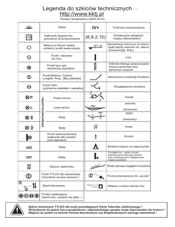 Legenda do szkiców technicznych 1.6 http://www.kktj.pl Tomasz Snopkiewicz (2000-2013) 18 Otwór IV+ Trudności wspinaczkowe Całkowita długość liny potrzebna do poręczowania (6,8,2,15) Orientacyjne odległości między stanowiskami Miejsce w którym należy umieścić punkt asekuracyjny -21 m Punkt naturalny lub inny Deniwelacja mierzona od otworu (jeśli więcej otworów od otworu oznaczonego 0 m.) Lina Odcinek którego poręczowanie można zaniechać przy sprawnym zespole Punkt typu spit (konieczna plakietka) Punkt Batinox, Colinox, Longlife, Ring.. (Bez plakietki) Uproszczony przebieg korytarza Punkt HSA (potrzebna plakietka i nakrętka) Rozgałęzienie korytarza P L S S Umiejscowienia punktu : Z Prawa strona Z Lewa strona (okresowy) Krata Spąg Okap Półka Deszcz Jaskiniowy Jeziorko (okresowe) Syfon Strop Punkt wykorzystywany wyłącznie jako przelot przy wspinaniu Zacisk ! Krucho Świetne miejsce na odpoczynek Początek liny - gdzie nie jest jednoznaczny kierunek pomiaru przy orientacyjnych odległościach między punktami Woda płynąca spągiem korytarza Punkt TYLKO dla ratownictwa (normalnie nie jest używany ) Punkt przeznaczony do „wycofu” Zjazd kierunkowy Miejsce z dużym tarciem liny Punkty niedostępne (zanik lodu, urwanie się półki...) Szkice techniczne TYLKO dla osób posiadających Kartę Taternika Jaskiniowego ! Wchodzenie do jaskiń bez przeszkolenia i odpowiedniego sprzętu może doprowadzić do śmierci ! Wejście do jaskiń na terenie Parków Narodowych czy Krajobrazowych wymaga zezwolenia !