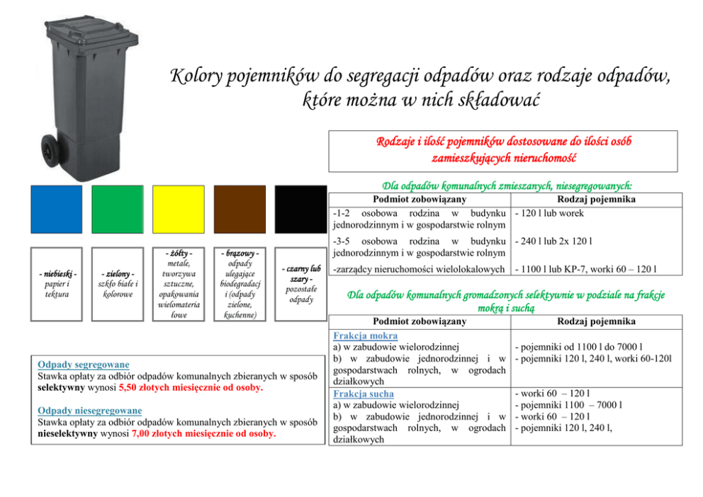 Kolory pojemników do segregacji odpadów oraz rodzaje odpadów, które można w nich składować Rodzaje i ilość pojemników dostosowane do ilości osób zamieszkujących nieruchomość Dla odpadów komunalnych zmieszanych, niesegregowanych: Podmiot zobowiązany Rodzaj pojemnika -1-2 osobowa rodzina w budynku - 120 l lub worek jednorodzinnym i w gospodarstwie rolnym - niebieski papier i tektura - zielony szkło białe i kolorowe - żółty metale, tworzywa sztuczne, opakowania wielomateria łowe - brązowy odpady ulegające biodegradacj i (odpady zielone, kuchenne) -3-5 osobowa rodzina w budynku - 240 l lub 2x 120 l jednorodzinnym i w gospodarstwie rolnym - czarny lub szary pozostałe odpady Odpady segregowane Stawka opłaty za odbiór odpadów komunalnych zbieranych w sposób selektywny wynosi 5,50 złotych miesięcznie od osoby. Odpady niesegregowane Stawka opłaty za odbiór odpadów komunalnych zbieranych w sposób nieselektywny wynosi 7,00 złotych miesięcznie od osoby. -zarządcy nieruchomości wielolokalowych - 1100 l lub KP-7, worki 60 – 120 l Dla odpadów komunalnych gromadzonych selektywnie w podziale na frakcje mokrą i suchą Podmiot zobowiązany Frakcja mokra a) w zabudowie wielorodzinnej b) w zabudowie jednorodzinnej i w gospodarstwach rolnych, w ogrodach działkowych Frakcja sucha a) w zabudowie wielorodzinnej b) w zabudowie jednorodzinnej i w gospodarstwach rolnych, w ogrodach działkowych Rodzaj pojemnika - pojemniki od 1100 l do 7000 l - pojemniki 120 l, 240 l, worki 60-120l - worki 60 – 120 l - pojemniki 1100 – 7000 l - worki 60 – 120 l - pojemniki 120 l, 240 l,
