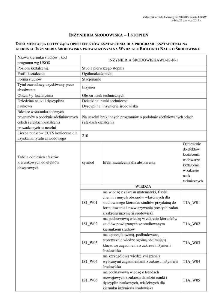 Załącznik nr 3 do Uchwały Nr 94/2015 Senatu UKSW z dnia 25 czerwca 2015 r. INŻYNIERIA ŚRODOWISKA – I STOPIEŃ DOKUMENTACJA DOTYCZĄCA OPISU EFEKTÓW KSZTAŁCENIA DLA PROGRAMU KSZTAŁCENIA NA KIERUNKU INŻYNIERIA ŚRODOWISKA PROWADZONYM NA WYDZIALE BIOLOGII I NAUK O ŚRODOWISKU Nazwa kierunku studiów i kod programu wg USOS Poziom kształcenia Profil kształcenia Forma studiów Tytuł zawodowy uzyskiwany przez absolwenta Obszar/-y kształcenia Dziedzina nauki i dyscyplina naukowa Różnice w stosunku do innych programów o podobnie zdefiniowanych celach i efektach kształcenia prowadzonych na uczelni Liczba punktów ECTS konieczna dla uzyskania tytułu zawodowego Tabela odniesień efektów kierunkowych do efektów obszarowych INŻYNIERIA ŚRODOWISKAWB-IS-N-1 Studia pierwszego stopnia Ogólnoakademicki Stacjonarne Inżynier Obszar nauk technicznych Dziedzina: nauki techniczne Dyscyplina: inżynieria środowiska Na uczelni brak innych programów o podobnie zdefiniowanych celach i efektach kształcenia 210 symbol IS1_W01 IS1_W02 IS1_W03 IS1_W04 IS1_W05 Efekt kształcenia dla absolwenta WIEDZA ma wiedzę z zakresu matematyki, fizyki, chemii i innych obszarów właściwych dla studiowanego kierunku studiów przydatną do formułowania i rozwiązywania prostych zadań z zakresu inżynierii środowiska ma podstawową wiedzę w zakresie kierunków studiów powiązanych ze studiowanym kierunkiem studiów ma uporządkowaną, podbudowaną teoretycznie wiedzę ogólną obejmującą kluczowe zagadnienia z zakresu inżynierii środowiska ma szczegółową wiedzę związaną z wybranymi zagadnieniami z zakresu inżynierii środowiska ma podstawową wiedzę o trendach rozwojowych z zakresu dziedzin nauki i dyscyplin naukowych, właściwych dla kierunku inżynieria środowiska Odniesienie do efektów kształcenia w obszarze kształcenia w zakresie nauk technicznych T1A_W01 T1A_W02 T1A_W03 T1A_W04 T1A_W05 IS1_W06 IS1_W07 IS1_W08 IS1_W09 IS1_W10 IS1_W11 IS1_W12 IS1_W131 IS1_W141 IS1_W152 IS1_W162 IS1_U01 IS1_U02 IS1_U03 zna podstawowe metody, techniki, narzędzia i materiały stosowane przy rozwiązywaniu prostych zadań inżynierskich z zakresu inżynierii środowiska ma podstawową wiedzę niezbędną do rozumienia społecznych, ekonomicznych, prawnych i innych pozatechnicznych uwarunkowań działalności inżynierskiej zna i rozumie podstawowe pojęcia i zasady z zakresu prawa autorskiego ma podstawową wiedzę o funkcjonowaniu, użytkowaniu urządzeń, instalacji, obiektów i systemów technicznych inżynierii środowiska ma podstawową wiedzę dotyczącą zarządzania małymi przedsiębiorstwami, w tym zarządzania jakością i prowadzenia działalności gospodarczej w obszarze inżynierii środowiska zna i rozumie podstawowe pojęcia i zasady z zakresu ochrony własności przemysłowej; potrafi korzystać z zasobów informacji patentowej w odniesieniu do technologii inżynierii środowiska zna ogólne zasady tworzenia i rozwoju form indywidualnej przedsiębiorczości, wykorzystującej wiedzę z zakresu dziedzin nauki i dyscyplin naukowych powiązanych z kierunkiem inżynieria środowiska ma podstawową wiedzę o naukach społecznych i ich relacjach z innymi naukami ma podstawową wiedzę o człowieku, jako podmiocie tworzącym struktury społeczne, zasady ich funkcjonowania i działającym w nich ma podstawową wiedzę o znaczeniu i specyfice przedmiotowej i metodologicznej nauk humanistycznych zna instytucje kultury i orientuje się w życiu kulturalnym UMIEJĘTNOŚCI potrafi pozyskiwać informacje z literatury, baz danych oraz innych właściwie dobranych źródeł; potrafi integrować uzyskane informacje, dokonywać ich interpretacji, a także wyciągać wnioski oraz formułować i uzasadniać opinie potrafi przygotować dobrze udokumentowane opracowanie problemów z zakresu inżynierii środowiska potrafi przygotować i przedstawić prezentację ustną, dotyczącą szczegółowych zagadnień T1A_W07 T1A_W08 T1A_W10 T1A_W06 T1A_W09 T1A_W10 T1A_W11 S1A_W01 S1A_W05 H1A_W01 H1A_W10 T1A_U01 T1A_U03 T1A_U04 IS1_U04 IS1_U05 IS1_U06 IS1_U07 IS1_U08 IS1_U09 IS1_U10 IS1_U11 IS1_U12 IS1_U13 IS1_U14 IS1_U15 z zakresu inżynierii środowiska ma umiejętność samokształcenia się ma umiejętności językowe zgodne z wymaganiami określonymi dla poziomu B2 Europejskiego Systemu Opisu Kształcenia Językowego potrafi posługiwać się technikami informacyjno-komunikacyjnymi właściwymi do realizacji zadań typowych dla działalności inżynierskiej potrafi planować i przeprowadzać eksperymenty, w tym pomiary i symulacje komputerowe, interpretować uzyskane wyniki i wyciągać wnioski ma przygotowanie niezbędne do pracy w środowisku przemysłowym oraz zna zasady bezpieczeństwa związane z tą pracą potrafi dokonać wstępnej analizy ekonomicznej podejmowanych działań inżynierskich potrafi dokonać krytycznej analizy sposobu funkcjonowania i ocenić – zwłaszcza w powiązaniu ze studiowanym kierunkiem studiów – istniejące rozwiązania techniczne, w szczególności urządzenia, obiekty, systemy, procesy, usługi potrafi dokonać identyfikacji i sformułować specyfikację prostych zadań inżynierskich o charakterze praktycznym, charakterystycznych dla inżynierii środowiska potrafi ocenić przydatność rutynowych metod i narzędzi służących do rozwiązania prostego zadania inżynierskiego o charakterze praktycznym, charakterystycznego dla inżynierii środowiska oraz wybrać i zastosować właściwą metodę i narzędzia potrafi – zgodnie z zadaną specyfikacją – zaprojektować oraz zrealizować proste urządzenie, obiekt, system lub proces, typowe dla inżynierii środowiska, używając właściwych metod, technik i narzędzi potrafi porozumiewać się przy użyciu różnych technik w środowisku zawodowym oraz w innych środowiskach, w tym w ramach pracy w biurze projektowym, wykonywania robót budowlanych, pracy w laboratoriach inżynierii środowiska potrafi wykorzystać do fo