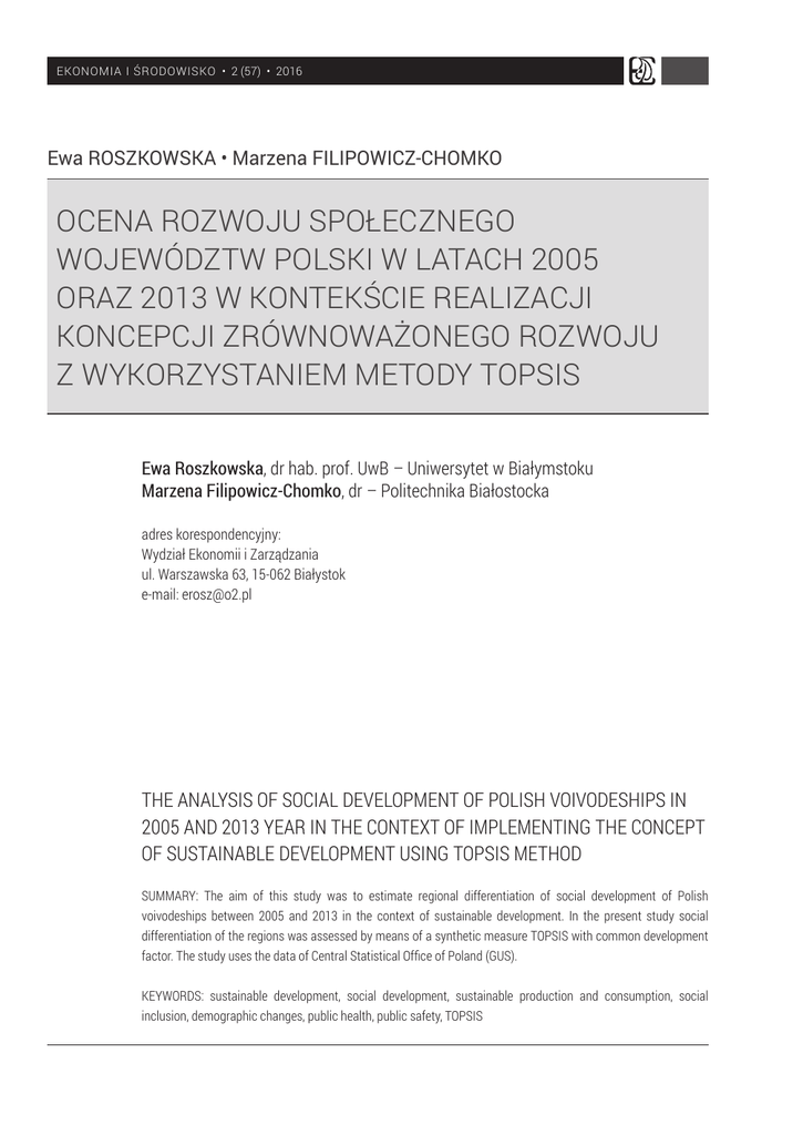 EKONOMIA I ŚRODOWISKO • 2 (57) • 2016 Ewa ROSZKOWSKA • Marzena FILIPOWICZ-CHOMKO OCENA ROZWOJU SPOŁECZNEGO WOJEWÓDZTW POLSKI W LATACH 2005 ORAZ 2013 W KONTEKŚCIE REALIZACJI KONCEPCJI ZRÓWNOWAŻONEGO ROZWOJU Z WYKORZYSTANIEM METODY TOPSIS Ewa Roszkowska, dr hab. prof. UwB – Uniwersytet w Białymstoku Marzena Filipowicz-Chomko, dr – Politechnika Białostocka adres korespondencyjny: Wydział Ekonomii i Zarządzania ul. Warszawska 63, 15-062 Białystok e-mail: [email protected] THE ANALYSIS OF SOCIAL DEVELOPMENT OF POLISH VOIVODESHIPS IN 2005 AND 2013 YEAR IN THE CONTEXT OF IMPLEMENTING THE CONCEPT OF SUSTAINABLE DEVELOPMENT USING TOPSIS METHOD SUMMARY: The aim of this study was to estimate regional differentiation of social development of Polish voivodeships between 2005 and 2013 in the context of sustainable development. In the present study social differentiation of the regions was assessed by means of a synthetic measure TOPSIS with common development factor. The study uses the data of Central Statistical Office of Poland (GUS). KEYWORDS: sustainable development, social development, sustainable production and consumption, social inclusion, demographic changes, public health, public safety, TOPSIS EKONOMIA I ŚRODOWISKO 2 (57) • 2016 Studia i materiały Wstęp Realizacja koncepcji zrównoważonego rozwoju w regionie jest wypadkową wielu procesów i zjawisk społeczno-ekonomicznych. Zarówno problematyka analizy poziomu zrównoważonego rozwoju województw Polski1, jak i poszczególne kwestie związane z rozwojem społecznym regionów były przedmiotem wielu badań i analiz ilościowych. Były w tym: zrównoważona produkcja i konsumpcja2, transport3 energia4, włączenie społeczne5, zatrudnienie6, zmiany demogra iczne7, zdrowie publiczne8, bezpieczeństwo publiczne9, jakość życia10, konwergencja dochodowa11. 1 2 3 4 5 6 7 8 9 10 11 E. Roszkowska, E. Misiewicz, R. Karwowska, Analiza poziomu zrównoważonego rozwoju województw Polski w 2010 roku, „Ekonomia i Środowisko” 2014 nr 2(49), s. 168190; D. Perło, E. Roszkowska, Zastosowanie wybranych metod klasy ikacji do analizy zrównoważonego rozwoju, „Zeszyty Naukowe 176, Wzrost Gospodarczy. Teoria. Rzeczywistość”, Poznań 2011, s. 372-399. A. Borowska, Społeczeństwo konsumpcyjne – charakterystyka, „Zeszyty Naukowe Politechniki Białostockiej” 2009 nr 14, s. 7-18; B. Kryk, Zrównoważona jakość życia a zrównoważona konsumpcja i zachowania ekologiczne polskich konsumentów, „Handel Wewnętrzny” 2013, listopad-grudzień (A), t. 2; E. Lorek, A. Lorek, Rozwój rynku dóbr i usług ekologicznych jako podstawa wdrażania zrównoważonej konsumpcji i produkcji, „Optimum. Studia Ekonomiczne” 2014 nr 4 (70). A. Przybyłowski Pomiar zrównoważonego rozwoju transportu w polskich województwach, „Optimum. Studia Ekonomiczne” 2014 nr 3(69). A. Pultowicz, Przesłanki rozwoju rynku odnawialnych źródeł energii w Polsce w świetle idei zrównoważonego rozwoju, PAN 2009, Komitet Człowiek i Środowisko nr 24 (1). B. Bal-Domańska, J. Wilk, B. Bartniczak, Ocena realizacji koncepcji zrównoważonego rozwoju w województwach w zakresie włączenia społecznego, „Econometrics” 2013 nr 2(40), s. 48-61. Raport monitorujący z 2011 r. w sprawie strategii zrównoważonego rozwoju UE, http://epp.eurostat.ec.europa.eu/cache/ITY_OFFPUB/224-PL/PL/224-PL-PL.PDF [02-12-2013]; R.B. Dylkiewicz, Czynniki ekonomiczne determinujące rynek pracy w ujęciu teoretycznym i empirycznym, „Optimum. Studia Ekonomiczne” 2014 nr 2(68). J. Wilk, T. Bartłomowicz, Wielowymiarowa analiza zmian demogra icznych w Polsce w świetle koncepcji zrównoważonego rozwoju, „Studia Demogra iczne” 2012 nr 2(162), s. 57-86. B. Bal-Domańska, J. Wilk, B. Bartniczak, Pomiar postępów województw w kierunku zrównoważonego rozwoju w zakresie zdrowia publicznego, „Econometrics” 2012 nr 3(37), s. 83-92. J. Kudełko, Poziom rozwoju społeczno-gospodarczego województw Polski, „Zeszyty Naukowe Akademii Ekonomicznej w Krakowie” 2004 nr 651, s. 75-90. B. Kryk, Środowiskowe uwarunkowania jakości życia w województwie zachodniopomorskim na tle Polski, „Ekonomia i Środowisko” 2015 nr 3(54). J. Batóg, Analiza krańcowej pionowej konwergencji dochodowej typu β w krajach Unii Europejskiej w latach 1993-2010, „Studia i Prace Wydziału Nauk Ekonomicznych i Zarządzania” 2013 nr 31, s. 29-48. 135 136 Studia i materiały EKONOMIA I ŚRODOWISKO 2 (57) • 2016 W opracowaniu przedstawiono wielowymiarową ocenę zróżnicowania rozwoju społecznego województw Polski w latach 2005 oraz 2013. Analiza postępów regionów w realizacji koncepcji zrównoważonego rozwoju w kontekście ładu społecznego została oparta na rankingach województw w ramach obszarów tematycznych obrazujących poziom rozwoju społecznego, poziom spójności terytorialnej oraz kierunek i tempo zachodzących zmian w roku 2013 w porównaniu z rokiem 2005. Syntetyczne mierniki wyznaczone metodą TOPSIS ze wspólnym wzorcem rozwoju, przez łączną analizę wskaźników cząstkowych, pozwoliły ocenić ogólny poziom rozwoju regionów oraz uszeregować i pogrupować badane regiony ze względu na rozważane obszary tematyczne rozwoju społecznego. Metodologia badań W celu porównania zmian oraz oceny postępu poszczególnych regionów w kierunku zrównoważonego rozwoju w 2013 roku w zestawieniu z rokiem 2005 wykorzystano procedurę TOPSIS ze wspólnym wzorcem i antywzorcem rozwoju12. Etapy postępowania w tej procedurze są następujące: 1) Wybór wskaźników na podstawie przesłanek merytorycznych oraz statystycznych. Konstrukcja macierzy danych: X = [xikt], gdzie: xikt – wartość k-tego wskaźnika zrównoważonego rozwoju (k = 1,2,...,m) dla i-tego województwa (i = 1,2,...,16) w t-tym roku (t = 2005; 2013). 2) Normalizacja wartości wskaźników w celu uzyskania ich porównywalności: - dla stymulant: z ikt x ikt min ^x ikt ` i max ^x ikt ` min ^x
