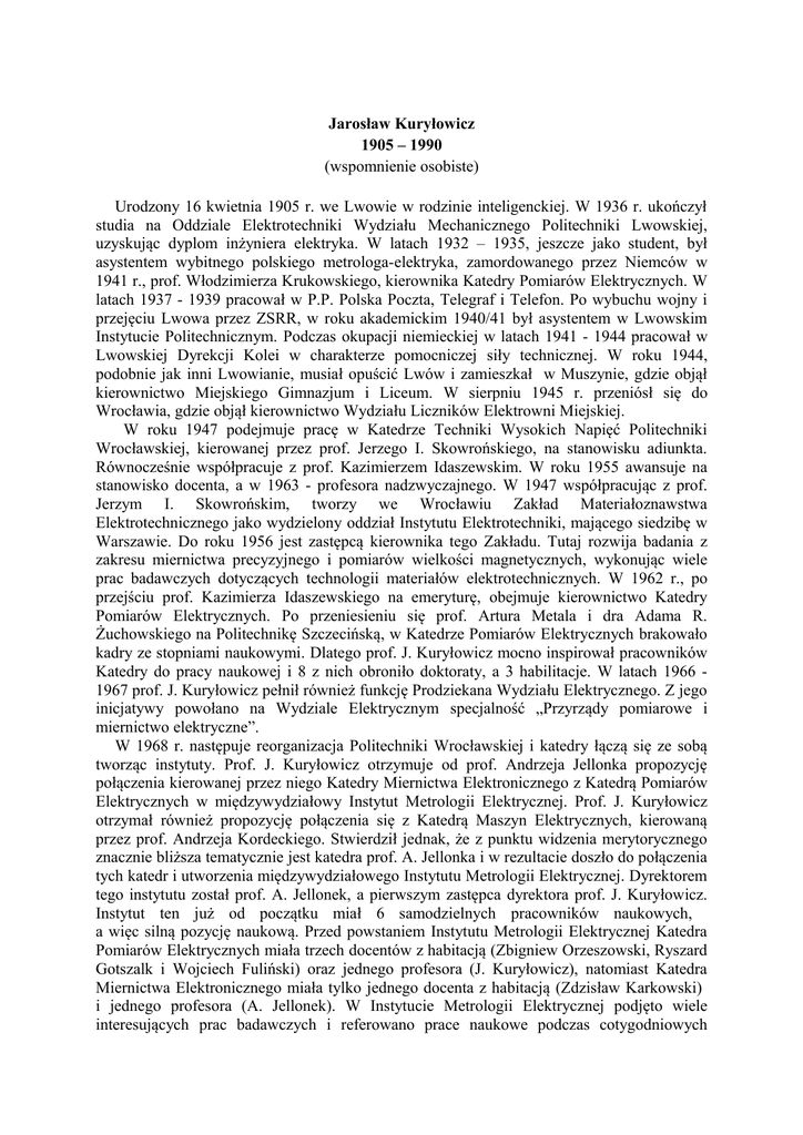 Jarosław Kuryłowicz 1905 – 1990 (wspomnienie osobiste) Urodzony 16 kwietnia 1905 r. we Lwowie w rodzinie inteligenckiej. W 1936 r. ukończył studia na Oddziale Elektrotechniki Wydziału Mechanicznego Politechniki Lwowskiej, uzyskując dyplom inżyniera elektryka. W latach 1932 – 1935, jeszcze jako student, był asystentem wybitnego polskiego metrologa-elektryka, zamordowanego przez Niemców w 1941 r., prof. Włodzimierza Krukowskiego, kierownika Katedry Pomiarów Elektrycznych. W latach 1937 - 1939 pracował w P.P. Polska Poczta, Telegraf i Telefon. Po wybuchu wojny i przejęciu Lwowa przez ZSRR, w roku akademickim 1940/41 był asystentem w Lwowskim Instytucie Politechnicznym. Podczas okupacji niemieckiej w latach 1941 - 1944 pracował w Lwowskiej Dyrekcji Kolei w charakterze pomocniczej siły technicznej. W roku 1944, podobnie jak inni Lwowianie, musiał opuścić Lwów i zamieszkał w Muszynie, gdzie objął kierownictwo Miejskiego Gimnazjum i Liceum. W sierpniu 1945 r. przeniósł się do Wrocławia, gdzie objął kierownictwo Wydziału Liczników Elektrowni Miejskiej. W roku 1947 podejmuje pracę w Katedrze Techniki Wysokich Napięć Politechniki Wrocławskiej, kierowanej przez prof. Jerzego I. Skowrońskiego, na stanowisku adiunkta. Równocześnie współpracuje z prof. Kazimierzem Idaszewskim. W roku 1955 awansuje na stanowisko docenta, a w 1963 - profesora nadzwyczajnego. W 1947 współpracując z prof. Jerzym I. Skowrońskim, tworzy we Wrocławiu Zakład Materiałoznawstwa Elektrotechnicznego jako wydzielony oddział Instytutu Elektrotechniki, mającego siedzibę w Warszawie. Do roku 1956 jest zastępcą kierownika tego Zakładu. Tutaj rozwija badania z zakresu miernictwa precyzyjnego i pomiarów wielkości magnetycznych, wykonując wiele prac badawczych dotyczących technologii materiałów elektrotechnicznych. W 1962 r., po przejściu prof. Kazimierza Idaszewskiego na emeryturę, obejmuje kierownictwo Katedry Pomiarów Elektrycznych. Po przeniesieniu się prof. Artura Metala i dra Adama R. Żuchowskiego na Politechnikę Szczecińską, w Katedrze Pomiarów Elektrycznych brakowało kadry ze stopniami naukowymi. Dlatego prof. J. Kuryłowicz mocno inspirował pracowników Katedry do pracy naukowej i 8 z nich obroniło doktoraty, a 3 habilitacje. W latach 1966 1967 prof. J. Kuryłowicz pełnił również funkcję Prodziekana Wydziału Elektrycznego. Z jego inicjatywy powołano na Wydziale Elektrycznym specjalność „Przyrządy pomiarowe i miernictwo elektryczne”. W 1968 r. następuje reorganizacja Politechniki Wrocławskiej i katedry łączą się ze sobą tworząc instytuty. Prof. J. Kuryłowicz otrzymuje od prof. Andrzeja Jellonka propozycję połączenia kierowanej przez niego Katedry Miernictwa Elektronicznego z Katedrą Pomiarów Elektrycznych w międzywydziałowy Instytut Metrologii Elektrycznej. Prof. J. Kuryłowicz otrzymał również propozycję połączenia się z Katedrą Maszyn Elektrycznych, kierowaną przez prof. Andrzeja Kordeckiego. Stwierdził jednak, że z punktu widzenia merytorycznego znacznie bliższa tematycznie jest katedra prof. A. Jellonka i w rezultacie doszło do połączenia tych katedr i utworzenia międzywydziałowego Instytutu Metrologii Elektrycznej. Dyrektorem tego instytutu został prof. A. Jellonek, a pierwszym zastępca dyrektora prof. J. Kuryłowicz. Instytut ten już od początku miał 6 samodzielnych pracowników naukowych, a więc silną pozycję naukową. Przed powstaniem Instytutu Metrologii Elektrycznej Katedra Pomiarów Elektrycznych miała trzech docentów z habitacją (Zbigniew Orzeszowski, Ryszard Gotszalk i Wojciech Fuliński) oraz jednego profesora (J. Kuryłowicz), natomiast Katedra Miernictwa Elektronicznego miała tylko jednego docenta z habitacją (Zdzisław Karkowski) i jednego profesora (A. Jellonek). W Instytucie Metrologii Elektrycznej podjęto wiele interesujących prac badawczych i referowano prace naukowe podczas cotygodniowych seminariów instytutowych. Pewną uciążliwością było rozbicie terytorialne instytutu; część mieściła się przy ul. B. Prusa, a część przy ul. Smoluchowskiego. Początkowo współpraca w instytucie prof. J. Kuryłowicza z prof. A. Jellonkiem układała się dobrze, ale z czasem prof. A. Jellonek zaczął go traktować nie tak, jak zasługiwałby na to kolega, który w skład Instytutu włączył swoją Katedrę. Dla prof. J. Kuryłowicza trudnym do zaakceptowania był autorytaryzm dyrektora prof. Andrzeja Jellonka. Był jego kolegą, którego znał od wielu lat. Prof. J. Kuryłowicz był człowiekiem bardzo wrażliwym i poczuł się dotknięty takim traktowaniem, ale nie opowiadał o swoich problemach. Chyba tylko mnie zwierzył się, ale i ja tych informacji nie rozpowszechniałem. W wieku 68 lat, mogąc jeszcze dwa lata pracować na Politechnice Wrocławskiej, pod pozorem złego stanu zdrowia, przechodzi na emeryturę, ale postanawia, że będzie nadal promotorem mojej rozprawy doktorskiej i promotorem jeszcze jednej nieukończonej pracy doktorskiej. Obydwie prace zostały obronione pod jego kierunkiem. Prof. J. Kuryłowicz był współtwórcą Szkoły Naukowej „Metrologia Elektryczna”. Jego prace naukowe dotyczyły głównie badania właściwości materiałów magnetycznych i elektrycznych pomiarów precyzyjnych. Dorobek publikacyjny Profesora liczbowo nie jest zbyt wielki, gdyż obejmuje tylko 21 pozycji naukowych, w tym 4 książki oraz 3 patenty. Ale jego monografia pt. „Badanie materiałów magnetycznych” jest bardzo dobrze znana w Polsce wszystkim tym, którzy interesują się pomiarami magnetycznymi, i jest często cytowana w różnych pracach naukowych. Drugą cenną pozycją jest „Poradnik materiałoznawstwa elektrotechnicznego”, którego jest on współautorem. Wielkość profesora ocenia się po osiągnięciach jego uczniów. Prof. J. Kuryłowicz ma bardzo duże osiągnięcia w rozwoju kadry naukowej. Mimo że sam nie miał doktoratu, wypromował 16 dok