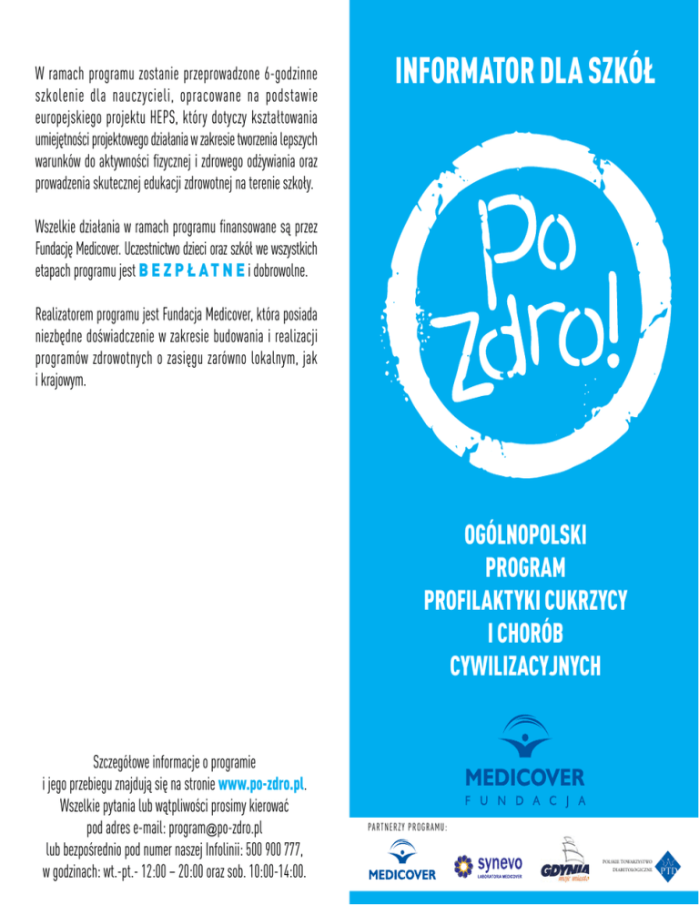 W ramach programu zostanie przeprowadzone 6-godzinne szkolenie dla nauczycieli, opracowane na podstawie europejskiego projektu HEPS, który dotyczy kształtowania umiejętności projektowego działania w zakresie tworzenia lepszych warunków do aktywności fizycznej i zdrowego odżywiania oraz prowadzenia skutecznej edukacji zdrowotnej na terenie szkoły. INFORMATOR DLA SZKÓŁ Wszelkie działania w ramach programu finansowane są przez Fundację Medicover. Uczestnictwo dzieci oraz szkół we wszystkich etapach programu jest B E Z P Ł A T N E i dobrowolne. Realizatorem programu jest Fundacja Medicover, która posiada niezbędne doświadczenie w zakresie budowania i realizacji programów zdrowotnych o zasięgu zarówno lokalnym, jak i krajowym. OGÓLNOPOLSKI PROGRAM PROFILAKTYKI CUKRZYCY I CHORÓB CYWILIZACYJNYCH Szczegółowe informacje o programie i jego przebiegu znajdują się na stronie www.po-zdro.pl. Wszelkie pytania lub wątpliwości prosimy kierować pod adres e-mail: [email protected] lub bezpośrednio pod numer naszej Infolinii: 500 900 777, w godzinach: wt.-pt.- 12:00 – 20:00 oraz sob. 10:00-14:00. PARTNERZ Y PROGRAMU : POLSKIE TOWARZYSTWO DIABETOLOGICZNE Szanowni Państwo, Dyrektorzy, Nauczyciele i Pracownicy gdyńskich gimnazjów. Zdrowie jest dobrem, które należy chronić, przywracać, ale również rozwijać. Jest ono podstawową wartością wszystkich dziedzin życia. Działania związane z edukacją zdrowotną, promocją zdrowego stylu życia oraz profilaktyką chorób podejmowane wobec dzieci i młodzieży powinny znajdować się w centrum uwagi całego społeczeństwa, a zwłaszcza pracowników oświaty. Nie można pozostawać obojętnym wobec narastającego problemu chorób cywilizacyjnych, w tym cukrzycy typu 2 – choroby, która dotyka coraz młodszych ludzi, a której świadomość jest bardzo niska. Ogólnopolski Program Profilaktyki Cukrzycy i Chorób Cywilizacyjnych „PoZdro” został stworzony przez zespół specjalistów – lekarzy, psychologów, dietetyków oraz specjalistów aktywności fizycznej – w celu identyfikacji zagrożeń związanych z cukrzycą u dzieci i młodzieży oraz wskazania możliwości zmiany zachowań zdrowotnych. Program ten pozwoli budować świadomość zdrowotną, która ułatwi podejmowanie odpowiednich decyzji i wyborów sprzyjających zdrowiu dzieci. Serdecznie zapraszamy do wzięcia udziału w Ogólnopolskim Programie Profilaktyki Cukrzycy i Chorób Cywilizacyjnych „PoZdro”, abyśmy wspólnie dbali o zdrowie dzieci i młodzieży. Marcin Radziwiłł, Prezes Fundacji Medicover Wojciech Szczurek, Prezydent Miasta Gdyni Poniżej przedstawiamy bardziej szczegółowy opis programu Cele szczegółowe: Dostarczenie dzieciom zarówno wiedzy, jak i narzędzi, dzięki którym świadomie będą mogły dokonywać wyboru jakości swojego życia. Zmotywowanie uczniów do prawidłowego i zdrowego trybu życia. Stworzenie mody na sportowe życie i prawidłowe żywienie. Redukcja zagrożenia zachorowań na cukrzycę typu 2. Elementy programu: 1. E tap podstawowy: przeprowadzenie na terenie szkół gimnazjalnych Kompleksowej Analizy Zdrowotnej (KAZ) w formie populacyjnych badań przesiewowych uczniów pierwszych klas: ocenę ciśnienia tętniczego krwi, ocenę ostrości widzenia, ocenę postawy ciała, ocenę sprawności krążeniowo-oddechowej, ocenę masy ciała. 2. Etap wsparcia środowiska szkolnego: przeprowadzenie szkoleń środowiska szkolnego w zakresie tworzenia i wdrażania polityki zdrowotnej na terenie placówek oświatowych oraz dostarczenie nowatorskich narzędzi służących edukacji zdrowotnej. 3. Etap specjalistyczny: objęcie dwuletnią Zintegrowaną Opieką Indywidualną (ZOI) dzieci z czynnikami ryzyka rozwoju chorób cywilizacyjnych oraz ich rodzin, a także przeprowadzenie warsztatów edukacyjnych dla rodzin objętych ZOI.