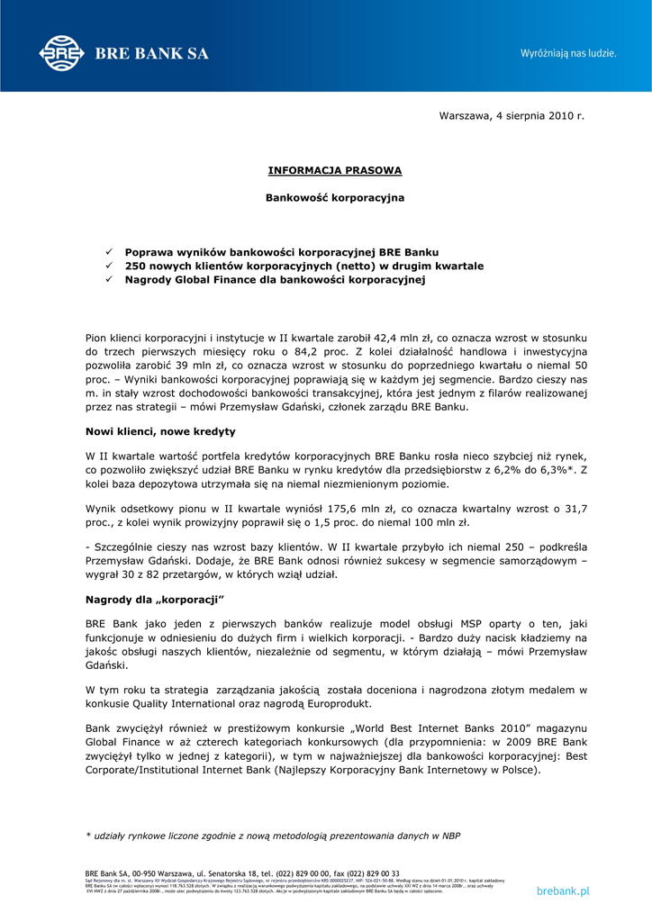 Warszawa, 4 sierpnia 2010 r. INFORMACJA PRASOWA Bankowość korporacyjna Poprawa wyników bankowości korporacyjnej BRE Banku 250 nowych klientów korporacyjnych (netto) w drugim kwartale Nagrody Global Finance dla bankowości korporacyjnej Pion klienci korporacyjni i instytucje w II kwartale zarobił 42,4 mln zł, co oznacza wzrost w stosunku do trzech pierwszych miesięcy roku o 84,2 proc. Z kolei działalność handlowa i inwestycyjna pozwoliła zarobić 39 mln zł, co oznacza wzrost w stosunku do poprzedniego kwartału o niemal 50 proc. – Wyniki bankowości korporacyjnej poprawiają się w każdym jej segmencie. Bardzo cieszy nas m. in stały wzrost dochodowości bankowości transakcyjnej, która jest jednym z filarów realizowanej przez nas strategii – mówi Przemysław Gdański, członek zarządu BRE Banku. Nowi klienci, nowe kredyty W II kwartale wartość portfela kredytów korporacyjnych BRE Banku rosła nieco szybciej niż rynek, co pozwoliło zwiększyć udział BRE Banku w rynku kredytów dla przedsiębiorstw z 6,2% do 6,3%*. Z kolei baza depozytowa utrzymała się na niemal niezmienionym poziomie. Wynik odsetkowy pionu w II kwartale wyniósł 175,6 mln zł, co oznacza kwartalny wzrost o 31,7 proc., z kolei wynik prowizyjny poprawił się o 1,5 proc. do niemal 100 mln zł. - Szczególnie cieszy nas wzrost bazy klientów. W II kwartale przybyło ich niemal 250 – podkreśla Przemysław Gdański. Dodaje, że BRE Bank odnosi również sukcesy w segmencie samorządowym – wygrał 30 z 82 przetargów, w których wziął udział. Nagrody dla „korporacji” BRE Bank jako jeden z pierwszych banków realizuje model obsługi MSP oparty o ten, jaki funkcjonuje w odniesieniu do dużych firm i wielkich korporacji. - Bardzo duży nacisk kładziemy na jakośc obsługi naszych klientów, niezależnie od segmentu, w którym działają – mówi Przemysław Gdański. W tym roku ta strategia zarządzania jakością została doceniona i nagrodzona złotym medalem w konkusie Quality International oraz nagrodą Europrodukt. Bank zwyciężył również w prestiżowym konkursie „World Best Internet Banks 2010” magazynu Global Finance w aż czterech kategoriach konkursowych (dla przypomnienia: w 2009 BRE Bank zwyciężył tylko w jednej z kategorii), w tym w najważniejszej dla bankowości korporacyjnej: Best Corporate/Institutional Internet Bank (Najlepszy Korporacyjny Bank Internetowy w Polsce). * udziały rynkowe liczone zgodnie z nową metodologią prezentowania danych w NBP BRE Bank SA, 00-950 Warszawa, ul. Senatorska 18, tel. (022) 829 00 00, fax (022) 829 00 33 Sąd Rejonowy dla m. st. Warszawy XII Wydział Gospodarczy Krajowego Rejestru Sądowego, nr rejestru przedsiębiorców KRS 0000025237, NIP: 526-021-50-88. Według stanu na dzień 01.01.2010 r. kapitał zakładowy BRE Banku SA (w całości wpłacony) wynosi 118.763.528 złotych. W związku z realizacją warunkowego podwyższenia kapitału zakładowego, na podstawie uchwały XXI WZ z dnia 14 marca 2008r., oraz uchwały XVI NWZ z dnia 27 października 2008r., może ulec podwyższeniu do kwoty 123.763.528 złotych. Akcje w podwyższonym kapitale zakładowym BRE Banku SA będą w całości opłacone. brebank.pl brebank.pl
