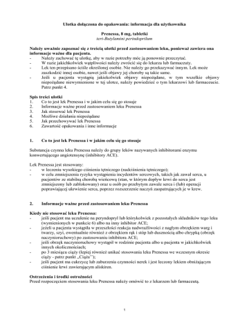 Ulotka dołączona do opakowania: informacja dla użytkownika Prenessa, 8 mg, tabletki tert-Butylamini perindoprilum Należy uważnie zapoznać się z treścią ulotki przed zastosowaniem leku, ponieważ zawiera ona informacje ważne dla pacjenta. Należy zachować tę ulotkę, aby w razie potrzeby móc ją ponownie przeczytać. W razie jakichkolwiek wątpliwości należy zwrócić się do lekarza lub farmaceuty. Lek ten przepisano ściśle określonej osobie. Nie należy go przekazywać innym. Lek może zaszkodzić innej osobie, nawet jeśli objawy jej choroby są takie same. Jeśli u pacjenta wystąpią jakiekolwiek objawy niepożądane, w tym wszelkie objawy niepożądane niewymienione w tej ulotce, należy powiedzieć o tym lekarzowi lub farmaceucie. Patrz punkt 4. Spis treści ulotki 1. Co to jest lek Prenessa i w jakim celu się go stosuje 2. Informacje ważne przed zastosowaniem leku Prenessa 3. Jak stosować lek Prenessa 4. Możliwe działania niepożądane 5. Jak przechowywać lek Prenessa 6. Zawartość opakowania i inne informacje 1. Co to jest lek Prenessa i w jakim celu się go stosuje Substancja czynna leku Prenessa należy do grupy leków nazywanych inhibitorami enzymu konwertującego angiotensynę (inhibitory ACE). Lek Prenessa jest stosowany: w leczeniu wysokiego ciśnienia tętniczego (nadciśnienia tętniczego); w celu zmniejszenia ryzyka wystąpienia incydentów sercowych, takich jak zawał serca, u pacjentów ze stabilną chorobą wieńcową (stan, w którym dopływ krwi do serca jest zmniejszony lub zablokowany) oraz u osób po przebytym zawale serca i (lub) operacji poprawiającej ukrwienie serca, poprzez rozszerzenie naczyń zaopatrujących je w krew. 2. Informacje ważne przed zastosowaniem leku Prenessa Kiedy nie stosować leku Prenessa: jeśli pacjent ma uczulenie na peryndopryl lub którykolwiek z pozostałych składników tego leku (wymienionych w punkcie 6) albo na inny inhibitor ACE; jeżeli u pacjenta wystąpiła w przeszłości reakcja nadwrażliwości z nagłym obrzękiem warg i twarzy, szyi, ewentualnie również z obrzękiem rąk i stóp lub dusznością albo chrypką (obrzęk naczynioruchowy) po zastosowaniu inhibitora ACE; jeśli obrzęk naczynioruchowy wystąpił w rodzinie pacjenta albo u pacjenta w jakichkolwiek innych okolicznościach; po 3 miesiącu ciąży (lepiej również unikać stosowania leku Prenessa we wczesnym okresie ciąży - patrz punkt ,,Ciąża’’); jeśli pacjent ma cukrzycę lub zaburzenia czynności nerek i jest leczony lekiem obniżającym ciśnienie krwi zawierającym aliskiren. Ostrzeżenia i środki ostrożności Przed rozpoczęciem stosowania leku Prenessa należy omówić to z lekarzem lub farmaceutą. 1 Istnieje możliwość, że lek Prenessa nie jest odpowiedni dla pacjenta lub jego przyjmowanie wymaga pozostawania pod regularną kontrolą lekarską. Z tego powodu, przed rozpoczęciem przyjmowania leku Prenessa, należy poinformować lekarza, jeśli: u pacjenta rozpoznano powiększenie mięśnia sercowego lub występują zaburzenia dotyczące zastawek serca; u pacjenta występuje zwężenie tętnicy zaopatrującej nerkę w krew (zwężenie tętnicy nerkowej); u pacjenta występuje cukrzyca; u pacjenta występują inne choroby nerek, wątroby lub serca; pacjent poddawany jest dializoterapii lub pacjentowi niedawno przeszczepiono nerkę; u pacjenta występuje kolagenoza, taka jak toczeń rumieniowaty układowy czy twardzina skóry; pacjent stosuje dietę z małą ilością soli albo występują nasilone wymioty lub biegunka lub pacjent przyjmuje leki, które zwiększają ilość moczu (leki moczopędne); pacjent przyjmuje lit, lek stosowany w leczeniu manii lub depresji; pacjent przyjmuje suplementy potasu lub zamienniki soli kuchennej zawierające potas; pacjent przyjmuje którykolwiek z poniższych leków, stosowanych w leczeniu wysokiego ciśnienia krwi: antagonistę receptora angiotensyny II (ang. Angiotensin Receptor Blockers, ARB) (znane również jako sartany - na przykład walsartan, telmisartan, irbesartan), zwłaszcza jeśli pacjent ma zaburzenia czynności nerek związane z cukrzycą, aliskiren. Lekarz prowadzący może monitorować czynność nerek, ciśnienie krwi oraz stężenie elektrolitów (np. potasu) we krwi w regularnych odstępach czasu. Patrz także informacje pod nagłówkiem „Kiedy nie stosować leku Prenessa:”. Należy poinformować lekarza o podejrzeniu (lub planowaniu) ciąży. Nie zaleca się stosowania leku Prenessa we wczesnym okresie ciąży i nie wolno go przyjmować po 3 miesiącu ciąży, ponieważ stosowany w tym okresie może poważnie zaszkodzić dziecku (patrz punkt ,,Ciąża’’). Podczas leczenia lekiem Prenessa Należy natychmiast poinformować lekarza, jeśli wystąpi którykolwiek z poniższych objawów: zawroty głowy po przyjęciu pierwszej dawki. Niektórzy pacjenci reagują na pierwszą dawkę lub na zwiększenie dawki leku zawrotami głowy, osłabieniem, omdleniem i nudnościami; nagły obrzęk warg i twarzy, szyi, ewentualnie również rąk i stóp lub świszczący oddech albo chrypka. Stan ten jest nazywany obrzękiem naczynioruchowym. Może on wystąpić w każdym momencie leczenia. Inhibitory ACE częściej powodują wystąpienie obrzęku naczynioruchowego u osób rasy czarnej niż u osób innych ras. gorączka, ból gardła lub owrzodzenia błony śluzowej jamy ustnej (mogą być objawami zakażenia spowodowanego zmniejszeniem liczby krwinek białych); zażółcenie skóry i białkówek oczu (żółtaczka), które może być objawem choroby wątroby; suchy kaszel utrzymujący się przez dłuższy czas. Kaszel jest działaniem niepożądanym zgłaszanym podczas stosowania inhibitorów ACE, ale może być również objawem choroby górnych dróg oddechowych. Na początku leczenia i (lub) podczas dostosowywania dawki mogą być konieczne częstsze kontrole lekarskie. Nie należy opuszczać wyznaczonych terminów wizyt, nawet jeśli występuje poprawa stanu pacjenta