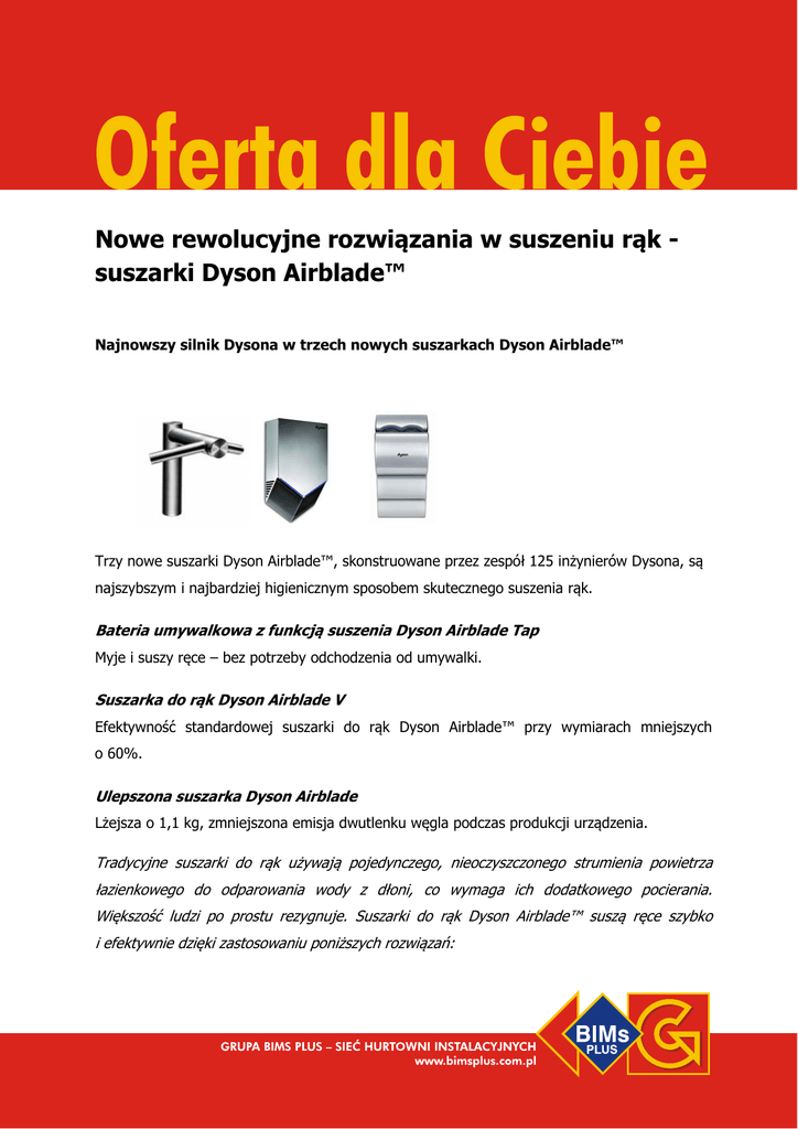 Nowe rewolucyjne rozwiązania w suszeniu rąk suszarki Dyson Airblade™ Najnowszy silnik Dysona w trzech nowych suszarkach Dyson Airblade™ Trzy nowe suszarki Dyson Airblade™, skonstruowane przez zespół 125 inżynierów Dysona, są najszybszym i najbardziej higienicznym sposobem skutecznego suszenia rąk. Bateria umywalkowa z funkcją suszenia Dyson Airblade Tap Myje i suszy ręce – bez potrzeby odchodzenia od umywalki. Suszarka do rąk Dyson Airblade V Efektywność standardowej suszarki do rąk Dyson Airblade™ przy wymiarach mniejszych o 60%. Ulepszona suszarka Dyson Airblade Lżejsza o 1,1 kg, zmniejszona emisja dwutlenku węgla podczas produkcji urządzenia. Tradycyjne suszarki do rąk używają pojedynczego, nieoczyszczonego strumienia powietrza łazienkowego do odparowania wody z dłoni, co wymaga ich dodatkowego pocierania. Większość ludzi po prostu rezygnuje. Suszarki do rąk Dyson Airblade™ suszą ręce szybko i efektywnie dzięki zastosowaniu poniższych rozwiązań: Technologia Airblade™ Strumienie niepodgrzanego powietrza z prędkością 690 km/h przepływają przez niewielkie szczeliny suszarki, dosłownie ściągając wodę z dłoni i pozostawiając je zupełnie suchymi. Cyfrowy silnik V4 Dysona W bezszczotkowym silniku DC o wysokiej gęstości mocy zastosowano wiązany magnes neodymowy umieszczony w rękawie z włókna węglowego. Jest to jeden z najmniejszych na świecie i w pełni zintegrowanych silników o mocy 1600W. Wykorzystując technologię cyfrowych impulsów, osiąga 90 000 obrotów na minutę w mniej niż 0,7 sekundy. Filtry HEPA W suszarce do rąk Dyson Airblade™ powietrze przepływa przez filtr HEPA, który usuwa 99.9% bakterii z powietrza, zanim zostanie ono skierowane na dłonie. Przy użyciu złożonego modelowania komputerowego, inżynierowie Dysona skonstruowali silnik cyfrowy V4 o wysokiej wydajności, który aktualizuje się 6 000 razy na sekundę. Utrzymuje w ten sposób optymalną efektywność w produkcji strumieni powietrza o wysokiej prędkości, które suszą dłonie szybko i higienicznie – mówi James Dyson, założyciel firmy. Bateria umywalkowa z funkcją suszenia Dyson Airblade Tap Bateria umywalkowa z funkcją suszenia Dyson Airblade Tap myje i suszy dłonie bez konieczności przenoszenia ich znad umywalki do suszarki. Czujniki na podczerwień precyzyjnie określają położenie dłoni i włączają przepływ wody. Kiedy ręce są już umyte i wymagają wysuszenia, informacja ta zostaje wysłana automatycznie, uruchamiając najnowszy cyfrowy silnik Dysona. Powstają wtedy dwa strumienie silnego powietrza, które z prędkością 690 km/h płyną z rozgałęzień baterii umywalkowej. Uwalniane jest czyste, niepodgrzewane powietrze, które dosłownie ściąga wodę z dłoni, susząc je w 12 sekund. Suszarka do rąk Dyson Airblade V Inżynierowie Dysona skondensowali technologię Dyson Airblade™, zachowując wysoką skuteczność suszenia. Suszarka Dyson Airblade V jest o 60% mniejsza od modelu wyjściowego, jednak równie skutecznie i szybko suszy ręce. Uwalnia dwa strumienie powietrza, które pod kątem 115 stopni kierowane są na ręce, by ściągnąć z nich wodę. Dłonie zupełnie suche w 10 sekund. Suszarka do rąk Airblade mk2 Inżynierowie Dysona udoskonalili suszarkę Dyson Airblade™. Zredukowali ciężar urządzenia o 1,1 kg, zmniejszając emisję dwutlenku węgla podczas produkcji urządzenia. Posiada ono certyfikat HACCP co oznacza, że suszarki Dyson Airblade™ mk2 mogą być używane w branży przetwórstwa żywności. Ręce suche w 10 sekund. Dodatkowe informacje Cyfrowy silnik Dysona: Dyson zatrudnia ponad 100 inżynierów którzy tworzą wewnętrzny zespół zajmujący się pracami nad cyfrowym silnikiem. W ciągu ostatnich 15 lat badania i rozwój cyfrowego silnika pochłonęły 100 mln funtów. Założyciel firmy nadal przeznacza 10 milionów funtów rocznie na badania nad nim. Cyfrowy silnik Dysona V4 kosztował 2,9 miliarda funtów, a prace nad nim trwały 7 lat. Cyfrowe silniki Dysona konstruowane są w bardzo nowoczesnej, wartej 20 mln funtów fabryce Dysona w Singapurze. Fabryka w West Park będzie produkować 50 000 silników tygodniowo. Cyfrowy silnik Dysona zamontowany w suszarce do rąk Dyson Airblade™ podczas całego okresu swojej żywotności jest w stanie przefiltrować około 162 000m3 powietrza, czyli tyle, ile potrzeba, by napełnić 26 milionów balonów1. 1 Dane dotyczą standardowych balonów sferycznych (23 cm). Badanie, projektowanie, rozwój Nowe suszarki Dyson Airblade™ są wynikiem prawie 3 lat 125 inżynierów z Centrum Badań i Rozwoju oraz inwestycji 40 milionów funtów. intensywnej pracy Testowanie urządzenia Bateria umywalkowa z funkcją suszenia Dyson Airblade Tap wykonana została ze stali nierdzewnej używanej do konstrukcji łodzi oraz przeszła pomyślnie testy atmosferyczne. Jej wytrzymałość sprawdzono pod ciśnieniem 16 bar - tradycyjny kran eksplodowałby w takich warunkach. Zwykle baterie łazienkowe testowane są pod ciśnieniem tylko 2 bar. Suszarka do rąk Dyson Airblade mk2 wykonana jest z tworzywa PC ABS (poliwęglanu akrylonitrylobutadieno-styrenowego). Dyson Airblade V wykonano z poliwęglanu, stosowanego również do produkcji tarcz używanych przez policję podczas zamieszek ulicznych. Natomiast z tworzywa ABS zrobione są klocki Lego. W suszarkach Dyson Airblade mk2 wykorzystano oba tworzywa – 70% poliwęglanu i 30% ABS, by zapewnić najwyższą trwałość urządzeń. Obydwa urządzenia zostały również wielokrotnie przetestowane pod kątem ich trwałości i odporności na nadużycia fizyczne i chemiczne. Inżynierowie Dysona skonstruowali ponad 3300 prototypów suszarek Dyson Airblade™ a części, z których zostały wykonane, poddano setkom testów. Zespół testujący był bezwzględny i miał za zadanie znaleźć każdą wadę i słabe punkty konstrukcji, zwracając uwagę na najmniejsze szczegóły. Inżynierowie przeprowadzili 213 m