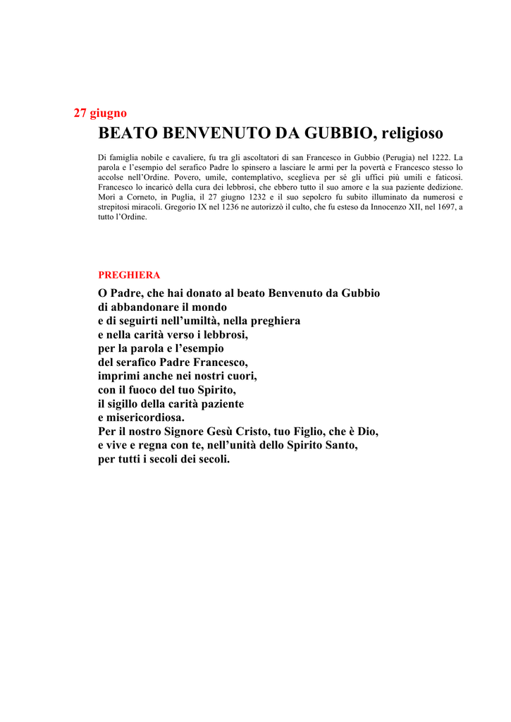 27 giugno BEATO BENVENUTO DA GUBBIO, religioso Di famiglia nobile e cavaliere, fu tra gli ascoltatori di san Francesco in Gubbio (Perugia) nel 1222. La parola e l’esempio del serafico Padre lo spinsero a lasciare le armi per la povertà e Francesco stesso lo accolse nell’Ordine. Povero, umile, contemplativo, sceglieva per sé gli uffici più umili e faticosi. Francesco lo incaricò della cura dei lebbrosi, che ebbero tutto il suo amore e la sua paziente dedizione. Morì a Corneto, in Puglia, il 27 giugno 1232 e il suo sepolcro fu subito illuminato da numerosi e strepitosi miracoli. Gregorio IX nel 1236 ne autorizzò il culto, che fu esteso da Innocenzo XII, nel 1697, a tutto l’Ordine. PREGHIERA O Padre, che hai donato al beato Benvenuto da Gubbio di abbandonare il mondo e di seguirti nell’umiltà, nella preghiera e nella carità verso i lebbrosi, per la parola e l’esempio del serafico Padre Francesco, imprimi anche nei nostri cuori, con il fuoco del tuo Spirito, il sigillo della carità paziente e misericordiosa. Per il nostro Signore Gesù Cristo, tuo Figlio, che è Dio, e vive e regna con te, nell’unità dello Spirito Santo, per tutti i secoli dei secoli. 27 giugno BEATA MARGHERITA BAYS, terziaria Nata l’8 settembre del 1815 a La Pierraz, frazione di Siviriez, vicino Friburgo, la suora laica svizzera, Terziaria francescana, Margherita Bays visse da sarta, casalinga e catechista. Esistenza semplice, non estranea al mondo: sostenne la stampa cattolica durante il Kulturkampf. Ma l’evento che la cambiò radicalmente fu il dono delle stimmate. Guarì anche miracolosamente da un cancro all’intestino l’8 dicembre 1854, proprio mentre Pio IX proclamava il dogma dell’Immacolata. Morì il 27 giugno del 1878. È stata beatificata il 29 ottobre 1995 da Giovanni Paolo II con due religiose elvetiche, Maria Teresa Scherer e Maria Bernarda Bütler. Riposa nella chiesa di Siviriez. PREGHIERA O Dio, che ci hai donato nella beata Margherita Bays un modello di laicità cristiana, concedici di imitare la sua infaticabile dedizione verso i bambini, i malati e i poveri e di aspirare a vivere come ella nell’umiltà alla sequela del tuo Figlio crocifisso. Egli è Dio, e vive e regna con te, nell’unità dello Spirito Santo, per tutti i secoli dei secoli.
