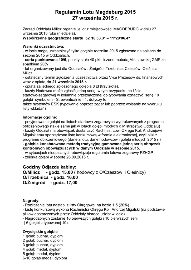 Regulamin Lotu Magdeburg 2015 27 września 2015 r. Zarząd Oddziału Milicz organizuje lot z miejscowości MAGDEBURG w dniu 27 września 2015 roku (niedziela). Współrzędne geograficzne startu 52°°10′′33.3″″ – 11°°29′′06.4″″ Warunki uczestnictwa: - w locie mogą uczestniczyć tylko gołębie rocznika 2015 zgłoszone na spisach do sezonu 2015 w Oddziałach. - seria punktowana 10/6, punkty stałe 40 pkt, liczone metodą Mistrzowską GMP ze spadkiem 20% - lot organizowany jest dla Oddziałów : śmigród, Trzebnica, Czeszów, Oleśnica i Milicz. - ostateczny termin zgłoszenia uczestnictwa przez V-ce Prezesow ds. finansowych wraz z opłatą do 21 września 2015 r. - opłata za jednego zgłoszonego gołębia 3 zł (trzy złote). - kaŜdy Hodowca moŜe zgłosić jedną serię, w tym przypadku na liście startowo-zegarowej w kolumnie przeznaczonej do typowania oznaczyć serię 10 gołębi symbolem - S, ewentualnie - 1. dotyczy to takŜe systemów ESK (typowanie poprzez zegar lub poprzez wpisanie na wydruku listy wkładań) Informacje ogólne: - przyjmowanie gołębi na listach startowo-zegarowych wydrukowanych z programu obliczeniowego (takie same jak w lotach gołębi młodych o Mistrzostwo Oddziału) - kaŜdy Oddział ma obowiązek dostarczyć Rachmistrzowi Okręgu Kol. Andrzejowi Migalskiemu sporządzoną listę konkursową w formie elektronicznej, czyli pliki z programu obliczeniowego (dane z lotu, dane hodowców i gołębi młodych 2015 r.) - gołębie konstatowane metodą tradycyjną gumowane jedną serią obrączek kontrolnych obowiązujących w danym Oddziale w sezonie 2015. - w sytuacjach nieopisanych obowiązuje regulamin lotowo-zegarowy PZHGP - zbiórka gołębi w sobotę 26.09.2015 r. Godziny Odjazdu kabiny: O/Milicz - godz. 15,00 ( hodowcy z O/Czeszów i Oleśnicy) O/Trzebnica - godz. 16,00 O/śmigród - godz. 17,00 Nagrody: - Rozliczenie lotu nastąpi z listy Okręgowej na bazie 1:5 (20%) - Listę konkursową wykona Rachmistrz Okręgu Kol. Andrzej Migalski (na podstawie plikow dostarczonych przez Oddziały biorące udział w locie) - Nagrodzonych zostanie 10 pierwszych gołębi i 10 pierwszych serii ( 6 gołębi z typowanej 10). Zwycięskie gołębie 1 gołąb puchar, dyplom 2 gołąb puchar, dyplom 3 gołąb puchar, dyplom 4 gołąb medal, dyplom 5 gołąb medal, dyplom 6-10 gołąb medal, dyplom Zwycięskie serie 1 seria puchar, dyplom 2 seria puchar, dyplom 3 seria puchar, dyplom 4 seria medal, dyplom 5 seria medal, dyplom 6-10 seria medal, dyplom Obowiązkowe zgłaszanie przylotu pierwszych gołębi u Organizatorów (Hodowca zgłasza u swojego Prezesa, a Prezesi pierwsze 5 gołębi i 3 serie u organizatora) Dobry Lot Zarząd Oddziału