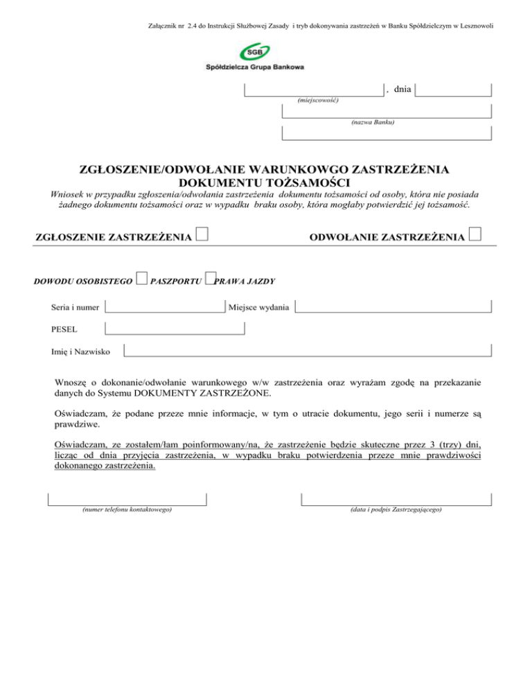 Załącznik nr 2.4 do Instrukcji Służbowej Zasady i tryb dokonywania zastrzeżeń w Banku Spółdzielczym w Lesznowoli , dnia (miejscowość) (nazwa Banku) ZGŁOSZENIE/ODWOŁANIE WARUNKOWGO ZASTRZEŻENIA DOKUMENTU TOŻSAMOŚCI Wniosek w przypadku zgłoszenia/odwołania zastrzeżenia dokumentu tożsamości od osoby, która nie posiada żadnego dokumentu tożsamości oraz w wypadku braku osoby, która mogłaby potwierdzić jej tożsamość. ZGŁOSZENIE ZASTRZEŻENIA DOWODU OSOBISTEGO PASZPORTU Seria i numer ODWOŁANIE ZASTRZEŻENIA PRAWA JAZDY Miejsce wydania PESEL Imię i Nazwisko Wnoszę o dokonanie/odwołanie warunkowego w/w zastrzeżenia oraz wyrażam zgodę na przekazanie danych do Systemu DOKUMENTY ZASTRZEŻONE. Oświadczam, że podane przeze mnie informacje, w tym o utracie dokumentu, jego serii i numerze są prawdziwe. Oświadczam, ze zostałem/łam poinformowany/na, że zastrzeżenie będzie skuteczne przez 3 (trzy) dni, licząc od dnia przyjęcia zastrzeżenia, w wypadku braku potwierdzenia przeze mnie prawdziwości dokonanego zastrzeżenia. (numer telefonu kontaktowego) (data i podpis Zastrzegającego) Informacja udzielana w trybie art. 24 ust. 1 w zw. z art. 25 ust. 2 pkt. 6 UODO Oświadczam, że zostałem/am poinformowany/na, że: 1) Uczestnik jest administratorem danych w rozumieniu ustawy z dnia 29 sierpnia 1997 r. o ochronie danych osobowych (Dz.U. z 2002 r. Nr 101, poz. 926 z późn. zm.) – w odniesieniu do moich danych osobowych umieszczonych we Wniosku o dokonanie/odwołanie zastrzeżenia, 2) podane przeze mnie, dobrowolnie we Wniosku o dokonanie/odwołanie zastrzeżenia, dane osobowe zostaną przekazane do Systemu DOKUMENTY ZASTRZEŻONE którego administratorem danych jest Związek Banków Polskich, z siedzibą w Warszawie, Biuro Obsługi Klienta, 02-676 Warszawa, ul. Postępu 17A, w rozumieniu ustawy wymienionej w pkt. 1, 3) celem zbierania danych jest uniemożliwienie wykorzystania utraconych dokumentów i danych w nich zawartych w sposób sprzeczny z prawem, wyeliminowanie nadużyć popełnianych przy użyciu utraconych dokumentów lub z wykorzystaniem danych osobowych zawartych w utraconym dokumencie, 4) odbiorcami danych są podmioty, w tym, przedsiębiorcy, którzy w ramach prowadzonej działalności identyfikują osoby na podstawie dokumentów umożliwiających stwierdzenie tożsamości lub przyjmują zapłatę przy użyciu czeków lub elektronicznych instrumentów płatniczych, 5) mam prawo dostępu do treści swoich danych i ich poprawiania. Przyjąłem/Przyjęłam do wiadomości powyższe informacje. (data i podpis Zastrzegającego) WYPEŁNIA BANK: Potwierdzenie przyjęcia zgłoszenia/odwołania zastrzeżenia: (data) (godz.) (pieczątka , data i podpis pracownika Banku)