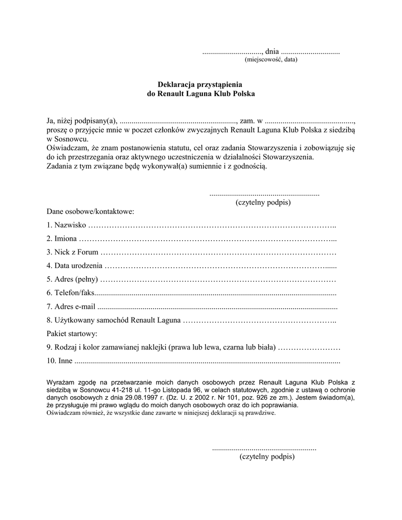 .............................., dnia .............................. (miejscowość, data) Deklaracja przystąpienia do Renault Laguna Klub Polska Ja, niżej podpisany(a), ..........................................................., zam. w ............................................., proszę o przyjęcie mnie w poczet członków zwyczajnych Renault Laguna Klub Polska z siedzibą w Sosnowcu. Oświadczam, że znam postanowienia statutu, cel oraz zadania Stowarzyszenia i zobowiązuję się do ich przestrzegania oraz aktywnego uczestniczenia w działalności Stowarzyszenia. Zadania z tym związane będę wykonywał(a) sumiennie i z godnością. ........................................................ (czytelny podpis) Dane osobowe/kontaktowe: 1. Nazwisko ………………………………………………………………………………….. 2. Imiona ……………………………………………………………………………………... 3. Nick z Forum ……………………………………………………………………………… 4. Data urodzenia …………………………………………………………………………...... 5. Adres (pełny) ……………………………………………………………………………… 6. Telefon/faks........................................................................................................................... 7. Adres e-mail .......................................................................................................................... 8. Użytkowany samochód Renault Laguna ………………………………………………….. Pakiet startowy: 9. Rodzaj i kolor zamawianej naklejki (prawa lub lewa, czarna lub biała) …………………… 10. Inne ....................................................................................................................................... Wyrażam zgodę na przetwarzanie moich danych osobowych przez Renault Laguna Klub Polska z siedzibą w Sosnowcu 41-218 ul. 11-go Listopada 96, w celach statutowych, zgodnie z ustawą o ochronie danych osobowych z dnia 29.08.1997 r. (Dz. U. z 2002 r. Nr 101, poz. 926 ze zm.). Jestem świadom(a), że przysługuje mi prawo wglądu do moich danych osobowych oraz do ich poprawiania. Oświadczam również, że wszystkie dane zawarte w niniejszej deklaracji są prawdziwe. ..................................................... (czytelny podpis)