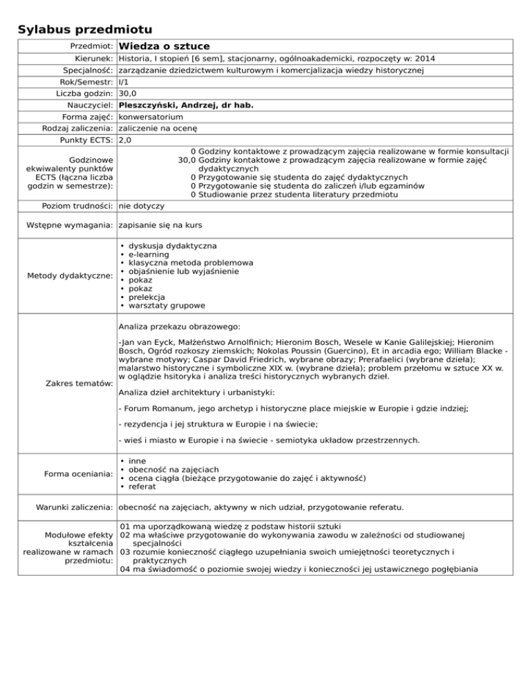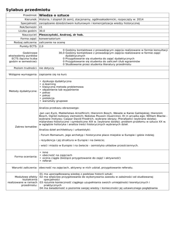 Sylabus przedmiotu Przedmiot: Wiedza o sztuce Kierunek: Historia, I stopień [6 sem], stacjonarny, ogólnoakademicki, rozpoczęty w: 2014 Specjalność: zarządzanie dziedzictwem kulturowym i komercjalizacja wiedzy historycznej Rok/Semestr: I/1 Liczba godzin: 30,0 Nauczyciel: Pleszczyński, Andrzej, dr hab. Forma zajęć: konwersatorium Rodzaj zaliczenia: zaliczenie na ocenę Punkty ECTS: 2,0 0 Godziny kontaktowe z prowadzącym zajęcia realizowane w formie konsultacji 30,0 Godziny kontaktowe z prowadzącym zajęcia realizowane w formie zajęć dydaktycznych 0 Przygotowanie się studenta do zajęć dydaktycznych 0 Przygotowanie się studenta do zaliczeń i/lub egzaminów 0 Studiowanie przez studenta literatury przedmiotu Godzinowe ekwiwalenty punktów ECTS (łączna liczba godzin w semestrze): Poziom trudności: nie dotyczy Wstępne wymagania: zapisanie się na kurs • • • • Metody dydaktyczne: • • • • dyskusja dydaktyczna e-learning klasyczna metoda problemowa objaśnienie lub wyjaśnienie pokaz pokaz prelekcja warsztaty grupowe Analiza przekazu obrazowego: Zakres tematów: -Jan van Eyck, Małżeństwo Arnolfinich; Hieronim Bosch, Wesele w Kanie Galilejskiej; Hieronim Bosch, Ogród rozkoszy ziemskich; Nokolas Poussin (Guercino), Et in arcadia ego; William Blacke wybrane motywy; Caspar David Friedrich, wybrane obrazy; Prerafaelici (wybrane dzieła); malarstwo historyczne i symboliczne XIX w. (wybrane dzieła); problem przełomu w sztuce XX w. w oglądzie hsitoryka i analiza treści historycznych wybranych dzieł. Analiza dzieł architektury i urbanistyki: - Forum Romanum, jego archetyp i historyczne place miejskie w Europie i gdzie indziej; - rezydencja i jej struktura w Europie i na świecie; - wieś i miasto w Europie i na świecie - semiotyka układow przestrzennych. Forma oceniania: • • • • inne obecność na zajęciach ocena ciągła (bieżące przygotowanie do zajęć i aktywność) referat Warunki zaliczenia: obecność na zajęciach, aktywny w nich udział, przygotowanie referatu. 01 ma uporządkowaną wiedzę z podstaw historii sztuki Modułowe efekty 02 ma właściwe przygotowanie do wykonywania zawodu w zależności od studiowanej specjalności kształcenia realizowane w ramach 03 rozumie konieczność ciągłego uzupełniania swoich umiejętności teoretycznych i praktycznych przedmiotu: 04 ma świadomość o poziomie swojej wiedzy i konieczności jej ustawicznego pogłębiania A. Boczkowska, Tryumf Luny i Wenus. Pasja Hieronima Boscha, Kraków 1980. E. Gombrich, O sztuce, Warszawa 1997. W. Koch, Style w architekturze. Arcydzieła budownictwa europejskiego od antyku po czasy współczesne, Warszawa 1996; W. Krassowski, Architektura drewniana w Polsce, Warszawa 1961; Literatura: U. Krzywda-Janicka, Patron, atrybut, symbol, Poznań 1993; F. G. Lanzi, Jak rozpoznać świętego i patrona w sztuce i wyobrażeniach ludowych , Kielce, 2004; N. Pevsner, Historia architektury europejskiej, Warszawa (wiele wydań); P. de Rynck, Jak czytać opowieści biblijne i mitologiczne w sztuce, Kraków 2008; Słownik terminologii sztuk pięknych, Warszawa 2005; M. Rzepińska, Siedem wieków malarstwa europejskiego, Warszawa 1986.