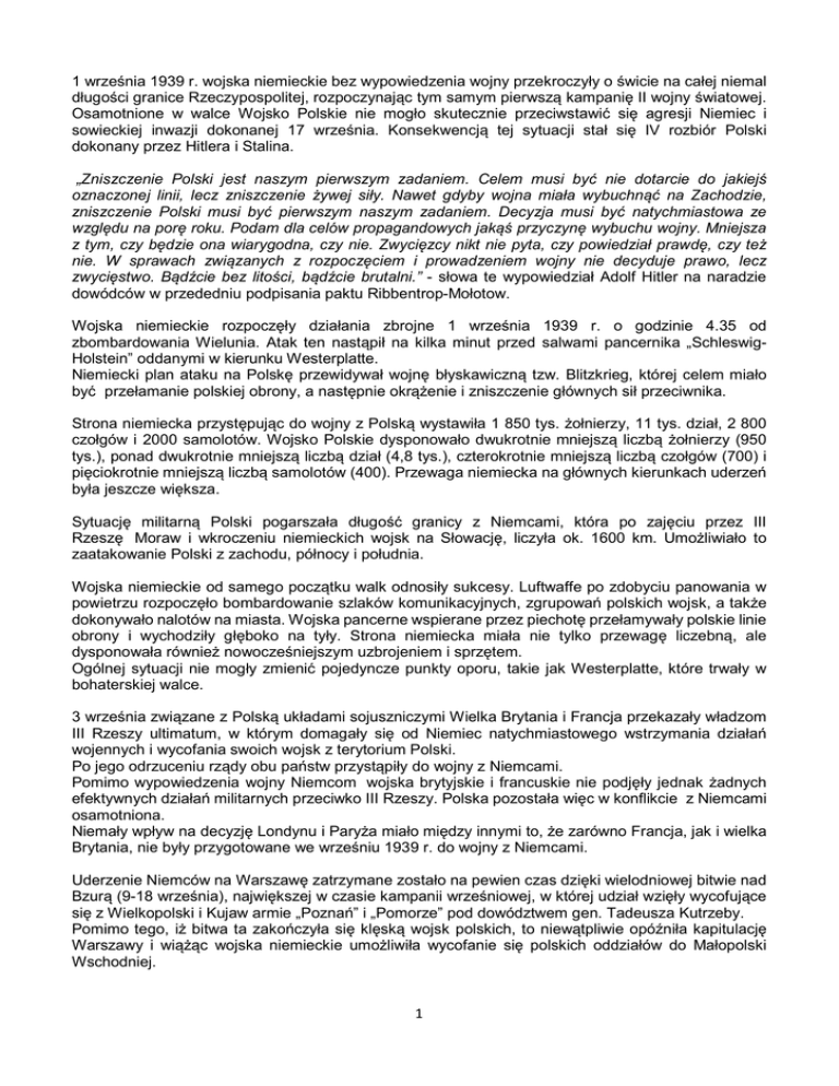 1 września 1939 r. wojska niemieckie bez wypowiedzenia wojny przekroczyły o świcie na całej niemal długości granice Rzeczypospolitej, rozpoczynając tym samym pierwszą kampanię II wojny światowej. Osamotnione w walce Wojsko Polskie nie mogło skutecznie przeciwstawić się agresji Niemiec i sowieckiej inwazji dokonanej 17 września. Konsekwencją tej sytuacji stał się IV rozbiór Polski dokonany przez Hitlera i Stalina. „Zniszczenie Polski jest naszym pierwszym zadaniem. Celem musi być nie dotarcie do jakiejś oznaczonej linii, lecz zniszczenie żywej siły. Nawet gdyby wojna miała wybuchnąć na Zachodzie, zniszczenie Polski musi być pierwszym naszym zadaniem. Decyzja musi być natychmiastowa ze względu na porę roku. Podam dla celów propagandowych jakąś przyczynę wybuchu wojny. Mniejsza z tym, czy będzie ona wiarygodna, czy nie. Zwycięzcy nikt nie pyta, czy powiedział prawdę, czy też nie. W sprawach związanych z rozpoczęciem i prowadzeniem wojny nie decyduje prawo, lecz zwycięstwo. Bądźcie bez litości, bądźcie brutalni.” - słowa te wypowiedział Adolf Hitler na naradzie dowódców w przededniu podpisania paktu Ribbentrop-Mołotow. Wojska niemieckie rozpoczęły działania zbrojne 1 września 1939 r. o godzinie 4.35 od zbombardowania Wielunia. Atak ten nastąpił na kilka minut przed salwami pancernika „SchleswigHolstein” oddanymi w kierunku Westerplatte. Niemiecki plan ataku na Polskę przewidywał wojnę błyskawiczną tzw. Blitzkrieg, której celem miało być przełamanie polskiej obrony, a następnie okrążenie i zniszczenie głównych sił przeciwnika. Strona niemiecka przystępując do wojny z Polską wystawiła 1 850 tys. żołnierzy, 11 tys. dział, 2 800 czołgów i 2000 samolotów. Wojsko Polskie dysponowało dwukrotnie mniejszą liczbą żołnierzy (950 tys.), ponad dwukrotnie mniejszą liczbą dział (4,8 tys.), czterokrotnie mniejszą liczbą czołgów (700) i pięciokrotnie mniejszą liczbą samolotów (400). Przewaga niemiecka na głównych kierunkach uderzeń była jeszcze większa. Sytuację militarną Polski pogarszała długość granicy z Niemcami, która po zajęciu przez III Rzeszę Moraw i wkroczeniu niemieckich wojsk na Słowację, liczyła ok. 1600 km. Umożliwiało to zaatakowanie Polski z zachodu, północy i południa. Wojska niemieckie od samego początku walk odnosiły sukcesy. Luftwaffe po zdobyciu panowania w powietrzu rozpoczęło bombardowanie szlaków komunikacyjnych, zgrupowań polskich wojsk, a także dokonywało nalotów na miasta. Wojska pancerne wspierane przez piechotę przełamywały polskie linie obrony i wychodziły głęboko na tyły. Strona niemiecka miała nie tylko przewagę liczebną, ale dysponowała również nowocześniejszym uzbrojeniem i sprzętem. Ogólnej sytuacji nie mogły zmienić pojedyncze punkty oporu, takie jak Westerplatte, które trwały w bohaterskiej walce. 3 września związane z Polską układami sojuszniczymi Wielka Brytania i Francja przekazały władzom III Rzeszy ultimatum, w którym domagały się od Niemiec natychmiastowego wstrzymania działań wojennych i wycofania swoich wojsk z terytorium Polski. Po jego odrzuceniu rządy obu państw przystąpiły do wojny z Niemcami. Pomimo wypowiedzenia wojny Niemcom wojska brytyjskie i francuskie nie podjęły jednak żadnych efektywnych działań militarnych przeciwko III Rzeszy. Polska pozostała więc w konflikcie z Niemcami osamotniona. Niemały wpływ na decyzję Londynu i Paryża miało między innymi to, że zarówno Francja, jak i wielka Brytania, nie były przygotowane we wrześniu 1939 r. do wojny z Niemcami. Uderzenie Niemców na Warszawę zatrzymane zostało na pewien czas dzięki wielodniowej bitwie nad Bzurą (9-18 września), największej w czasie kampanii wrześniowej, w której udział wzięły wycofujące się z Wielkopolski i Kujaw armie „Poznań” i „Pomorze” pod dowództwem gen. Tadeusza Kutrzeby. Pomimo tego, iż bitwa ta zakończyła się klęską wojsk polskich, to niewątpliwie opóźniła kapitulację Warszawy i wiążąc wojska niemieckie umożliwiła wycofanie się polskich oddziałów do Małopolski Wschodniej. 1 Po wygranej bitwie granicznej wojska niemieckie zaczęły coraz bardziej zagrażać stolicy. W nocy z 4 na 5 września rozpoczęto ewakuację urzędów centralnych i rządowych. 6 września Warszawę opuścił rząd i marszałek Edward Rydz-Śmigły, który przeniósł swoją kwaterę do Brześcia nad Bugiem. Walczące oddziały rozkazem Naczelnego Wodza miały tworzyć linię obrony wzdłuż Narwi, Wisły i Sanu. 8 września pierwsze oddziały niemieckie dotarły pod Warszawę, której obroną kierowali gen. Walerian Czuma i prezydent Stefan Starzyński, pełniący funkcję cywilnego dowódcy obrony stolicy. Agresja sowiecka 17 września, łamiąc obowiązujący polsko-sowiecki pakt o nieagresji, na teren Rzeczypospolitej wkroczyły oddziały Armii Czerwonej. Niemcy od kilkunastu dni ponaglali już Sowietów, ażeby zajęli obszary uznane w pakcie Ribbentrop-Mołotow za ich strefę interesów. Stalin zwlekał jednak z podjęciem decyzji, czekając na to, jak zachowają się wobec niemieckiej agresji na Polskę Wielka Brytania i Francja, a także przyglądając się temu, jak silny opór Niemcom stawia polskie wojsko. Siły Armii Czerwonej skierowane przeciwko Rzeczypospolitej wynosiły w sumie ok. 1,5 miliona żołnierzy, ponad 6 tys. czołgów i ok. 1800 samolotów. Pomimo wkroczenia wojsk sowieckich do Polski i ewakuacji najwyższych władz Rzeczypospolitej walki trwały nadal. Od 17 września pod Tomaszowem Lubelskim armie „Kraków” i „Lublin” toczyły bój z Niemcami usiłując przedostać się na tzw. przedmoście rumuńskie. 20 września, po wyczerpaniu amunicji, skapitulowały. 22 września, po wielodniowej walce z Niemcami, dowódca obrony Lwowa gen. Władysław Langner poddał miasto Sowietom. Do 28 września broniła się Warszawa, a do 2 października załoga Helu. K