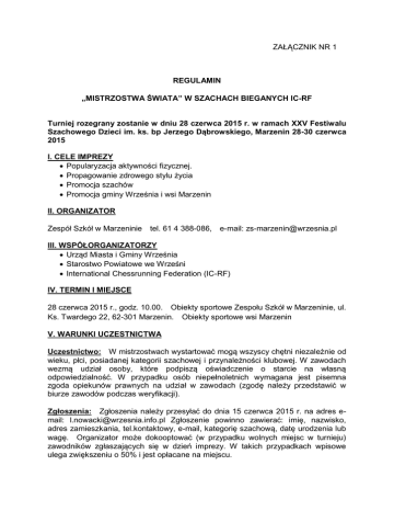 ZAŁĄCZNIK NR 1 REGULAMIN „MISTRZOSTWA ŚWIATA” W SZACHACH BIEGANYCH IC-RF Turniej rozegrany zostanie w dniu 28 czerwca 2015 r. w ramach XXV Festiwalu Szachowego Dzieci im. ks. bp Jerzego Dąbrowskiego, Marzenin 28-30 czerwca 2015 I. CELE IMPREZY Popularyzacja aktywności fizycznej. Propagowanie zdrowego stylu życia Promocja szachów Promocja gminy Września i wsi Marzenin II. ORGANIZATOR Zespół Szkół w Marzeninie tel. 61 4 388-086, e-mail: [email protected] III. WSPÓŁORGANIZATORZY Urząd Miasta i Gminy Września Starostwo Powiatowe we Wrześni International Chessrunning Federation (IC-RF) IV. TERMIN I MIEJSCE 28 czerwca 2015 r., godz. 10.00. Obiekty sportowe Zespołu Szkół w Marzeninie, ul. Ks. Twardego 22, 62-301 Marzenin. Obiekty sportowe wsi Marzenin V. WARUNKI UCZESTNICTWA Uczestnictwo: W mistrzostwach wystartować mogą wszyscy chętni niezależnie od wieku, płci, posiadanej kategorii szachowej i przynależności klubowej. W zawodach wezmą udział osoby, które podpiszą oświadczenie o starcie na własną odpowiedzialność. W przypadku osób niepełnoletnich wymagana jest pisemna zgoda opiekunów prawnych na udział w zawodach (zgodę należy przedstawić w biurze zawodów podczas weryfikacji). Zgłoszenia: Zgłoszenia należy przesyłać do dnia 15 czerwca 2015 r. na adres email: [email protected] Zgłoszenie powinno zawierać: imię, nazwisko, adres zamieszkania, tel.kontaktowy, e-mail, kategorię szachową, datę urodzenia lub wagę. Organizator może dokooptować (w przypadku wolnych miejsc w turnieju) zawodników zgłaszających się w dzień imprezy. W takich przypadkach wpisowe ulega zwiększeniu o 50% i jest opłacane na miejscu. Wpisowe: Opłatę startową w wysokości 20 zł należy uiścić do 15 czerwca br. na rachunek bankowy: PBS Września - 98 9681 0002 0000 1050 2000 0020 W tytule przelewu prosimy wpisać: imię, nazwisko, adres zamieszkania np.”Jan Kowalski, ul.Nowa 123, 62-300 Września”. Uczestnicy festiwalu, którzy opłacili wpisowe za festiwal są zwolnieni z opłat za turniej mistrzowski, (obowiązuje tylko jedna opłata wpisowa). VI. SYSTEM ROZGRYWEK Tempo gry: 20 minut na partię dla zawodnika. Dystans: 25 metrów na ruch. Reguły gry: szachista po wykonaniu posunięcia, a przed naciśnięciem zegara, musi przebiec (przejść) określony dystans. I część - na boisku trawiastym i szachownicach ustawionych na stolikach - system szwajcarski kontrolowany na dystansie 5 rund w czterech turniejach: open, juniorów i juniorek U-17 (ur. 1999 i mł.), juniorów i juniorek U-14 (ur. 2002 i mł.), młodziczek i młodzików U-12 (ur. 2005 i mł.). II część - na szachownicach parkowych - 3 rundy systemem pucharowym dla najlepszych siedmiu mężczyzn z turnieju open i najlepszego juniora oraz 2 rundy systemem pucharowym dla trzech najlepszych seniorek z turnieju open i najlepszej juniorki. W systemie pucharowym do kolejnej rundy przechodzi zwycięzca partii, a w przypadku remisu zawodnik wyżej sklasyfikowany po „szwajcarze”. Organizatorzy zastrzegają sobie prawo rozstrzygania w sytuacjach nieobjętych regulaminem. VII. NAGRODY Zwycięzcy dwóch głównych kategorii otrzymają okazałe grawertony „World Champion International Chessrunning Federation 2015”. Zwycięzcy pobocznych kategorii oraz zawodnicy na II i III miejscach we wszystkich kategoriach nagrodzeni zostaną okazałymi dyplomami federacji IC-RF w drewnianych ramkach. VIII. PROGRAM MINUTOWY 9.00 – 9.30 – weryfikacja zawodników w Biurze Zawodów (sala w ZS Marzenin) 10.00 – 14.00 – oficjalne rozpoczęcie i start rund I-V 14.00 – 15.00 – przerwa na posiłek regeneracyjny 15.00 – 17.00 – system pucharowy (finały) 17.30 – 18.00 – podsumowanie, wręczenie nagród, zakończenie mistrzostw IX. POSTANOWIENIA KOŃCOWE 1. Zawody odbędą się bez względu na warunki atmosferyczne. 2. Wpłacona opłata startowa nie podlega zwrotowi. 3. Uczestnicy zawodów zobowiązani są do przestrzegania regulaminu, ogólnych zasad bezpieczeństwa i stosowania się do poleceń organizatorów. 4. Zawodnicy wyrażają zgodę na przetwarzanie danych osobowych dla potrzeb organizatora oraz na wykorzystanie swojego wizerunku w materiałach informacyjnych i promocyjnych imprezy. 5. Organizator zastrzega sobie prawo odmowy dopuszczenia do zawodów lub wykreślenia w ich trakcie zawodnika, który w sposób rażący naruszył regulamin oraz swoim zachowaniem zakłócił przebieg rywalizacji. 6. Organizator zastrzega sobie prawo do zmiany regulaminu. 7. Ostateczna interpretacja regulaminu należy do organizatora. UWAGA! • Zawodnicy biorą udział w imprezie na własną odpowiedzialność. • Organizator nie ubezpiecza uczestników zawodów od następstw nieszczęśliwych wypadków. • Wskazanym jest ubezpieczenie od następstw nieszczęśliwych wypadków we własnym zakresie