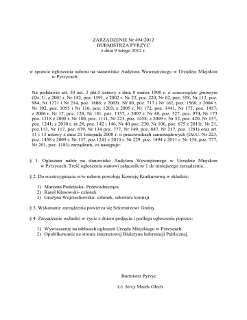 ZARZĄDZENIE Nr 494/2012 BURMISTRZA PYRZYC z dnia 9 lutego 2012 r. w sprawie ogłoszenia naboru na stanowisko Audytora Wewnętrznego w Urzędzie Miejskim w Pyrzycach. Na podstawie art. 30 ust. 2 pkt.5 ustawy z dnia 8 marca 1990 r. o samorządzie gminnym (Dz. U. z 2001 r. Nr 142, poz. 1591, z 2002 r. Nr 23, poz. 220, Nr 62, poz. 558, Nr 113, poz. 984, Nr 1271 i Nr 214, poz. 1806; z 2003r. Nr 80, poz. 717 i Nr 162, poz. 1568; z 2004 r. Nr 102, poz. 1055 i Nr 116, poz. 1203; z 2005 r. Nr 172, poz. 1441, Nr 175, poz. 1457; z 2006 r. Nr 17, poz. 128, Nr 181, poz. 1337; z 2007 r. Nr 48, poz. 327, poz. 974, Nr 173 poz. 1218 z 2008 r. Nr 180, poz. 1111, Nr 223, poz. 1458; z 2009 r. Nr 52, poz. 420, Nr 157, poz. 1241; z 2010 r. nr 28, poz. 142 i 146, Nr 40 poz. 230, Nr 106, poz. 675 z 2011r. Nr 21, poz.113, Nr 117, poz. 679, Nr 134 poz. 777, Nr 149, poz. 887, Nr 217, poz. 1281) oraz art. 11 i 13 ustawy z dnia 21 listopada 2008 r. o pracownikach samorządowych (Dz.U. Nr 223, poz. 1458 z 2009 r. Nr 157, poz.1241 z 2010 r. Nr 229, poz. 1494 z 2011 r. Nr 134, poz. 777, Nr 201, poz. 1183) zarządzam, co następuje: § 1. Ogłaszam nabór na stanowisko Audytora Wewnętrznego w Urzędzie Miejskim w Pyrzycach. Treść ogłoszenia stanowi załącznik nr 1 do niniejszego zarządzenia. § 2. Do rozstrzygnięcia w/w naboru powołuję Komisję Konkursową w składzie: 1) Marzena Podzińska- Przewodnicząca 2) Karol Kłosowski- członek 3) Grażyna Wojciechowska- członek, sekretarz komisji § 3. Wykonanie zarządzenia powierza się Sekretarzowi Gminy. § 4. Zarządzenie wchodzi w życie z dniem podjęcia i podlega ogłoszeniu poprzez: 1) Wywieszenie na tablicach ogłoszeń Urzędu Miejskiego w Pyrzycach. 2) Opublikowanie na stronie internetowej Biuletynu Informacji Publicznej. Burmistrz Pyrzyc (-) Jerzy Marek Olech Załącznik nr 1 do Zarządzenia nr 494/2012 Burmistrza Pyrzyc z dnia 9 lutego 2012 r. w sprawie ogłoszenia naboru na stanowisko Audytora Wewnętrznego w Urzędzie Miejskim w Pyrzycach BURMISTRZ PYRZYC Ogłasza nabór Na stanowisko urzędnicze Audytora Wewnętrznego w Urzędzie Miejskim w Pyrzycach, Plac Ratuszowy 1. I . Wymagania niezbędne: Wykształcenie wyższe. Co najmniej 5 letni staż pracy. Obywatelstwo polskie Nieposzlakowana opinia. Niekaralność za przestępstwa popełnione umyślnie. Stan zdrowia pozwalający na zatrudnienie na określonym stanowisku. Posiadanie następujących kwalifikacji zawodowych do przeprowadzenia audytu wewnętrznego (art. 58 ustawy z dnia 30 czerwca 2005r. o finansach publicznych. Dz.U Dz. 2005 r. Nr 249, poz. 2104 ze zm.) tj.: Certyfikaty: Certified Internal Auditor (CIA), Certified Government Auditing Professional (CGAP), Certified Information Sestems Auditor (CISA), Association of Chartered Certified Accountants (ACCA), Certified Fraud Examiner (CFE), Certification in Control SelfAssessment (CCSA), Certified Financial Services Auditor (CFSA) lub Chartered Financial Analyst (CFA), lub ukończenie aplikacji kontrolerskiej i złożenie egzaminu kontrolerskiego z wynikiem pozytywnym przed komisją egzaminacyjną powołaną przez Prezesa Najwyższej Izby Kontroli, lub złożenie z wynikiem pozytywnym egzaminu kwalifikacyjnego na stanowisko inspektora kontroli skarbowej, lub posiadanie uprawnień biegłego rewidenta, lub złożenie z pozytywnym wynikiem egzaminu na audytora wewnętrznego przed Komisją Egzaminacyjną powołaną przez Ministra Finansów. a. b. c. d. e. f. g. II. Wymagania dodatkowe Bardzo dobra znajomość przepisów prawa w zakresie rachunkowości budżetowej, finansów publicznych oraz samorządu terytorialnego. Mile widziane doświadczenie w pracy na stanowisku audytora, głównego księgowego lub w kontroli finansowej jednostek sektora finansów publicznych. Samodzielność w pracy, odpowiedzialność oraz bardzo dobra organizacja pracy. III. Zakres wykonywanych zadań: Wykonywanie czynności audytorskich. Sporządzanie rocznego planu audytu wewnętrznego. Sporządzanie sprawozdań z wykonywania planu audytu. Dokonywanie oceny gospodarki finansowej Urzędu. 2 IV. Wymagane dokumenty: a. Kwestionariusz osobowy. b. List motywacyjny + CV. c. Kopia dowodu osobistego lub paszportu. d. Kopie dokumentów potwierdzających wykształcenie. e. Kopie świadectw pracy potwierdzających wymagany staż. f. Oświadczenia o: Korzystaniu z pełni praw publicznych oraz niekaralności za przestępstwa popełnione umyślnie. Braku przeciwwskazań zdrowotnych do wykonywania pracy na wskazanym stanowisku. Prowadzeniu lub nie prowadzeniu działalności gospodarczej. W przypadku wyboru kandydata na stanowisko Audytora Wewnętrznego, uczestnik konkursu zobowiązany jest do przedłożenia zaświadczenia o stanie zdrowia od lekarza medycyny pracy, jak również dostarczyć informację o niekaralności z Krajowego Rejestru Sądowego. Niedostarczenie powyższych dokumentów będzie uznane za odmowę zawarcia stosunku pracy. Kandydat zatrudniony będzie na niepełny wymiar czasu pacy tj. ¼ etatu lub na umowęzlecenie. W przypadku osób podejmujących pracę po raz pierwszy na stanowisku urzędniczym umowa zawarta będzie na czas określony do 6 miesięcy, z możliwością wcześniejszego rozwiązania stosunku pracy za dwutygodniowym wypowiedzeniem. Pracodawca zastrzega sobie prawo unieważnienia konkursu bez podania przyczyny. TERMIN I MIEJSCE SKŁADANIA DOKUMENTÓW: Dokumenty należy składać do dnia 20 lutego 2012 r. do godz. 16:00 decyduje data wpływu w sekretariacie Urzędu Miejskiego w Pyrzycach. Ofertę należy złożyć w zamkniętej kopercie dopiskiem: „Audytor Wewnętrzny w Urzędzie Miejskim w Pyrzycach”. Pod adresem: Urząd Miejski w Pyrzycach ul. Plac Ratuszowy 1 74-200 Pyrzyce Kandydaci zakwalifikowani do dalszego etapu konkursu zostaną powiadomieni telefonicznie o terminie przeprowadzenia rozmowy kwalifikacyjnej. Złożonych dokumentów nie odsyłamy. Rozstrzygnięcie naboru nastąpi w terminie do dnia 9 marca 2012 r., Wymagane dokumenty aplikacyjne: l