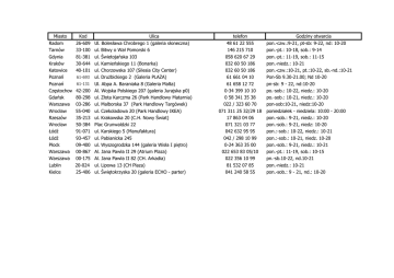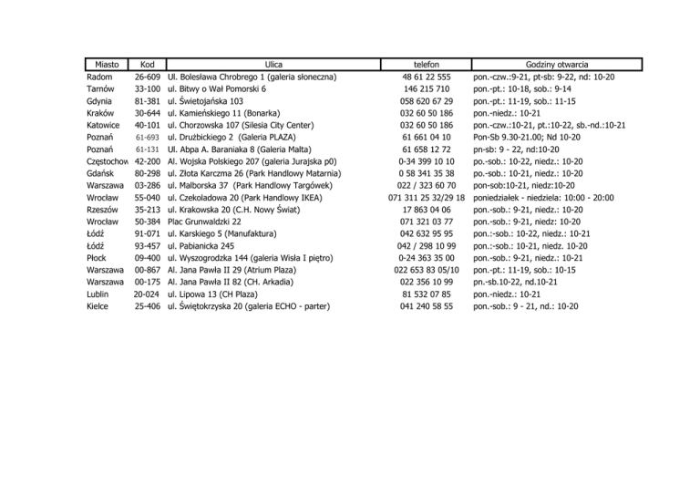 Miasto Kod Radom 26-609 Tarnów 33-100 Gdynia 81-381 Kraków 30-644 Katowice 40-101 61-693 Poznań 61-131 Poznań Częstochowa42-200 Gdańsk 80-298 Warszawa 03-286 Wrocław 55-040 Rzeszów 35-213 Wrocław 50-384 Łódź 91-071 Łódź 93-457 Płock 09-400 Warszawa 00-867 Warszawa 00-175 Lublin 20-024 Kielce 25-406 Ulica Ul. Bolesława Chrobrego 1 (galeria słoneczna) ul. Bitwy o Wał Pomorski 6 ul. Świetojańska 103 ul. Kamieńskiego 11 (Bonarka) ul. Chorzowska 107 (Silesia City Center) ul. Drużbickiego 2 (Galeria PLAZA) Ul. Abpa A. Baraniaka 8 (Galeria Malta) Al. Wojska Polskiego 207 (galeria Jurajska p0) ul. Złota Karczma 26 (Park Handlowy Matarnia) ul. Malborska 37 (Park Handlowy Targówek) ul. Czekoladowa 20 (Park Handlowy IKEA) ul. Krakowska 20 (C.H. Nowy Świat) Plac Grunwaldzki 22 ul. Karskiego 5 (Manufaktura) ul. Pabianicka 245 ul. Wyszogrodzka 144 (galeria Wisła I piętro) Al. Jana Pawła II 29 (Atrium Plaza) Al. Jana Pawła II 82 (CH. Arkadia) ul. Lipowa 13 (CH Plaza) ul. Świętokrzyska 20 (galeria ECHO - parter) telefon 48 61 22 555 146 215 710 058 620 67 29 032 60 50 186 032 60 50 186 61 661 04 10 61 658 12 72 0-34 399 10 10 0 58 341 35 38 022 / 323 60 70 071 311 25 32/29 18 17 863 04 06 071 321 03 77 042 632 95 95 042 / 298 10 99 0-24 363 35 00 022 653 83 05/10 022 356 10 99 81 532 07 85 041 240 58 55 Godziny otwarcia pon.-czw.:9-21, pt-sb: 9-22, nd: 10-20 pon.-pt.: 10-18, sob.: 9-14 pon.-pt.: 11-19, sob.: 11-15 pon.-niedz.: 10-21 pon.-czw.:10-21, pt.:10-22, sb.-nd.:10-21 Pon-Sb 9.30-21.00; Nd 10-20 pn-sb: 9 - 22, nd:10-20 po.-sob.: 10-22, niedz.: 10-20 po.-sob.: 10-21, niedz.: 10-20 pon-sob:10-21, niedz:10-20 poniedziałek - niedziela: 10:00 - 20:00 pon.-sob.: 9-21, niedz.: 10-20 pon.-sob.: 9-21, niedz: 10-20 pon.:-sob.: 10-22, niedz.: 10-21 pon.:-sob.: 10-21, niedz. 10-20 pon.-sob.: 9-21, niedz.: 10-21 pon.-pt.: 11-19, sob.: 10-15 pn.-sb.10-22, nd.10-21 pon.-niedz.: 10-21 pon.-sob.: 9 - 21, nd.: 10-20