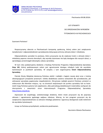 GMINA MIEJSKA PIECHOWICE Urząd Miasta w Piechowicach, ul. śymierskiego 49, 58-573 Piechowice tel. 075 75 48 900, fax 075 76 12 274, e-mail: [email protected] www.piechowice.pl _________________________________________________________________________________________________________________ Piechowice 09.08.2010r. LIST OTWARTY DO SPRZEDAWCÓW WYROBÓW TYTONIOWYCH W PIECHOWICACH Szanowni Państwo! Rozpoczynamy obecnie w Piechowicach kampanię społeczną, której celem jest zwiększenie świadomości i odpowiedzialności sprzedawców dotyczącej ochrony zdrowia dzieci i młodzieży. Odpowiedzialna sprzedaż to postawa, która przyczynia się do większej troski o zdrowie dzieci i młodzieży poprzez starania dorosłych, aby wyroby tytoniowe nie były dostępne dla naszych dzieci, a sprzedający przestrzegali obowiązku zakazu sprzedaży. W tym roku podejmujemy działania z Koalicją Partnerów Programu Odpowiedzialnej Sprzedaży Stop 18!, której podstawowym celem jest ograniczenie dostępu młodych ludzi do wyrobów tytoniowych w punktach sprzedaży. W związku z tym organizujemy Dzień Odpowiedzialnej Sprzedaży. Patrole Straży Miejskiej dostarczą Państwu ulotki i naklejki z logiem naszej akcji oraz z treścią obowiązujących przepisów prawnych. Ulotka dodatkowa zawiera wskazówki dla sprzedawców, jak odmawiać sprzedaży papierosów niepełnoletnim. Otrzymane naklejki powinni Państwo umieścić w widocznym dla klientów miejscu, np. na drzwiach wejściowych do punktu sprzedaży lub na kasie. Jeżeli mają Państwo pytania lub wątpliwości, albo potrzebują dodatkowych materiałów zachęcam do skorzystania z zawartości stron internetowych Programu Odpowiedzialnej Sprzedaży http://www.stop18.pl. Zapraszam do wspólnego, wielotorowego działania, które może przyczynić się do poprawy zdrowia i ograniczenia zgubnego wpływu nikotyny. Wierzę, że ten program przyczyni się do zwiększenia odpowiedzialności za zdrowie młodego pokolenia i ograniczy dostępność osób nieletnich do wyrobów tytoniowych. Licząc na Państwa przychylność, serdecznie pozdrawiam. Burmistrz Miasta Piechowice