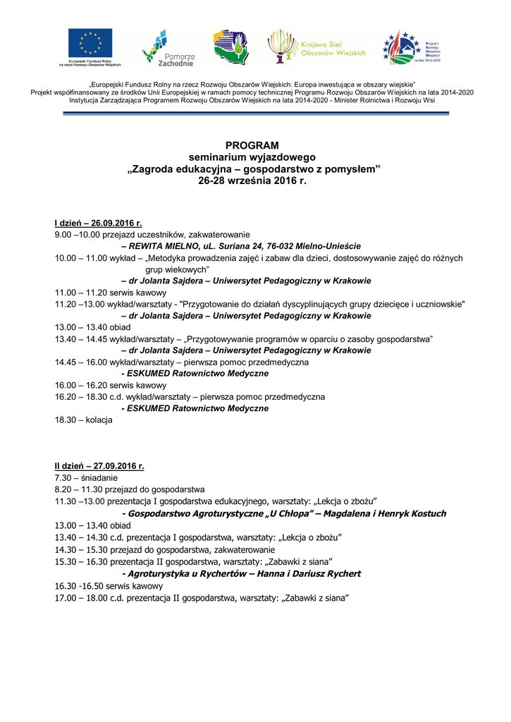 „Europejski Fundusz Rolny na rzecz Rozwoju Obszarów Wiejskich: Europa inwestuj ca w obszary wiejskie” Projekt wspó finansowany ze rodków Unii Europejskiej w ramach pomocy technicznej Programu Rozwoju Obszarów Wiejskich na lata 2014-2020 Instytucja Zarz dzaj ca Programem Rozwoju Obszarów Wiejskich na lata 2014-2020 - Minister Rolnictwa i Rozwoju Wsi PROGRAM seminarium wyjazdowego „Zagroda edukacyjna – gospodarstwo z pomys em” 26-28 wrze nia 2016 r. I dzie – 26.09.2016 r. 9.00 –10.00 przejazd uczestników, zakwaterowanie – REWITA MIELNO, uL. Suriana 24, 76-032 Mielno-Unie cie 10.00 – 11.00 wyk ad – „Metodyka prowadzenia zaj i zabaw dla dzieci, dostosowywanie zaj do ró nych grup wiekowych” – dr Jolanta Sajdera – Uniwersytet Pedagogiczny w Krakowie 11.00 – 11.20 serwis kawowy 11.20 –13.00 wyk ad/warsztaty - "Przygotowanie do dzia dyscyplinuj cych grupy dzieci ce i uczniowskie" – dr Jolanta Sajdera – Uniwersytet Pedagogiczny w Krakowie 13.00 – 13.40 obiad 13.40 – 14.45 wyk ad/warsztaty – „Przygotowywanie programów w oparciu o zasoby gospodarstwa” – dr Jolanta Sajdera – Uniwersytet Pedagogiczny w Krakowie 14.45 – 16.00 wyk ad/warsztaty – pierwsza pomoc przedmedyczna - ESKUMED Ratownictwo Medyczne 16.00 – 16.20 serwis kawowy 16.20 – 18.30 c.d. wyk ad/warsztaty – pierwsza pomoc przedmedyczna - ESKUMED Ratownictwo Medyczne 18.30 – kolacja II dzie – 27.09.2016 r. 7.30 – niadanie 8.20 – 11.30 przejazd do gospodarstwa 11.30 –13.00 prezentacja I gospodarstwa edukacyjnego, warsztaty: „Lekcja o zbo u” - Gospodarstwo Agroturystyczne „U Ch opa” – Magdalena i Henryk Kostuch 13.00 – 13.40 obiad 13.40 – 14.30 c.d. prezentacja I gospodarstwa, warsztaty: „Lekcja o zbo u” 14.30 – 15.30 przejazd do gospodarstwa, zakwaterowanie 15.30 – 16.30 prezentacja II gospodarstwa, warsztaty: „Zabawki z siana” - Agroturystyka u Rychertów – Hanna i Dariusz Rychert 16.30 -16.50 serwis kawowy 17.00 – 18.00 c.d. prezentacja II gospodarstwa, warsztaty: „Zabawki z siana” „Europejski Fundusz Rolny na rzecz Rozwoju Obszarów Wiejskich: Europa inwestuj ca w obszary wiejskie” Projekt wspó finansowany ze rodków Unii Europejskiej w ramach pomocy technicznej Programu Rozwoju Obszarów Wiejskich na lata 2014-2020 Instytucja Zarz dzaj ca Programem Rozwoju Obszarów Wiejskich na lata 2014-2020 - Minister Rolnictwa i Rozwoju Wsi III dzie – 28.09.2016 r. 8.00 – niadanie 8.40 – 10.30 przejazd do gospodarstwa 10.30 – 11.30 prezentacja III gospodarstwa edukacyjnego, warsztaty garncarskie - Zagroda Edukacyjna "U Garncarza" SZYSZKA – Joanna Szyszka 11.30 -11.50 serwis kawowy 11.50 – 13.00 c.d. prezentacja III gospodarstwa edukacyjnego, warsztaty garncarskie 13.00 – 13.40 obiad 14.00 wyjazd grupy