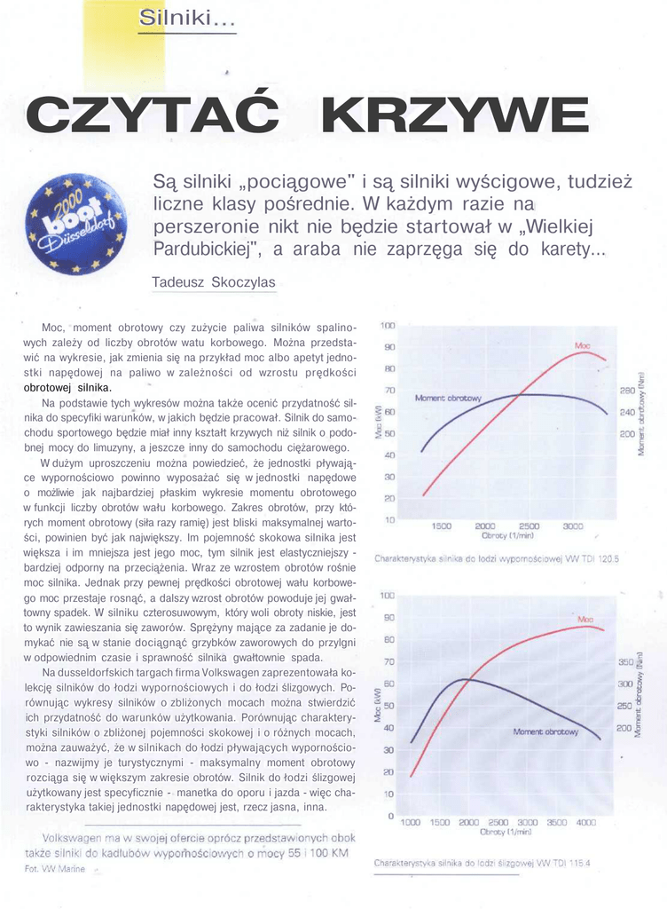 Silniki CZYTAĆ KRZYWE Są silniki „pociągowe" i są silniki wyścigowe, tudzież liczne klasy pośrednie. W każdym razie na perszeronie nikt nie będzie startował w „Wielkiej Pardubickiej", a araba nie zaprzęga się do karety... Tadeusz Skoczylas Moc, moment obrotowy czy zużycie paliwa silników spalinowych zależy od liczby obrotów watu korbowego. Można przedstawić na wykresie, jak zmienia się na przykład moc albo apetyt jednostki napędowej na paliwo w zależności od wzrostu prędkości obrotowej silnika. Na podstawie tych wykresów można także ocenić przydatność silnika do specyfiki warunków, w jakich będzie pracował. Silnik do samochodu sportowego będzie miał inny kształt krzywych niż silnik o podobnej mocy do limuzyny, a jeszcze inny do samochodu ciężarowego. W dużym uproszczeniu można powiedzieć, że jednostki pływające wypornościowo powinno wyposażać się w jednostki napędowe o możliwie jak najbardziej płaskim wykresie momentu obrotowego w funkcji liczby obrotów wału korbowego. Zakres obrotów, przy których moment obrotowy (siła razy ramię) jest bliski maksymalnej wartości, powinien być jak największy. Im pojemność skokowa silnika jest większa i im mniejsza jest jego moc, tym silnik jest elastyczniejszy bardziej odporny na przeciążenia. Wraz ze wzrostem obrotów rośnie moc silnika. Jednak przy pewnej prędkości obrotowej wału korbowego moc przestaje rosnąć, a dalszy wzrost obrotów powoduje jej gwałtowny spadek. W silniku czterosuwowym, który woli obroty niskie, jest to wynik zawieszania się zaworów. Sprężyny mające za zadanie je domykać nie są w stanie dociągnąć grzybków zaworowych do przylgni w odpowiednim czasie i sprawność silnika gwałtownie spada. Na dusseldorfskich targach firma Volkswagen zaprezentowała kolekcję silników do łodzi wypornościowych i do łodzi ślizgowych. Porównując wykresy silników o zbliżonych mocach można stwierdzić ich przydatność do warunków użytkowania. Porównując charakterystyki silników o zbliżonej pojemności skokowej i o różnych mocach, można zauważyć, że w silnikach do łodzi pływających wypornościowo - nazwijmy je turystycznymi - maksymalny moment obrotowy rozciąga się w większym zakresie obrotów. Silnik do łodzi ślizgowej użytkowany jest specyficznie - manetka do oporu i jazda - więc charakterystyka takiej jednostki napędowej jest, rzecz jasna, inna. Silniki do łodzi wypornościowych V W SD 145.4 silnik rzędowy, 4-cylindrowy, wysokoprężny, wolnossący pój. skokowa 1896 cm3 stopień sprężania 19,5:1 45 KM moc obroty mocy max 2500 obr/min max moment obr. 125 Nm obroty mom. max 2400 obr/min masa wtasna 175 kg VW SD l 60.4 silnik rzędowy, 4-cylindrowy, wysokoprężny, wolnossący pój. skokowa 1896 cm3 stopień sprężania 19,5:1 moc 60 KM obroty mocy max 3500 obr/min max moment obr. 125 N m obroty mom. max 2400 obr/rnin masa własna 175 kg VWSDI75.5 silnik rzędowy, 5-cylindrowy, wysokoprężny, wolnossący 2461 crn^ pój. skokowa stopień sprężania 19,5:1 75 KM moc obroty mocy max 3600 obr/min max moment obr. 155 Nm obroty mom. max 2250 obr/rnin 260 kg masa własna VW TDl 120.5 silnik rzędowy, 5-cy!indrowy, wysokoprężny, z turbodoładowaniem pój. skokowa 2461 cnr; stopień sprężania 19,5:1 moc 120 KM obroty mocy max 3200 obr/min max moment obr. 275 Nm obroty mom. max 2500 obr/min masa własna 275 kg Silniki do łodzi ślizgowych VW TDl 115.4 silnik rzędowy, 4-cylindrowy, wysokoprężny, z turbodoładowaniem pój. skokowa 1896 cm3 stopień sprężania 18:1 moc 115 KM obroty mocy max 4000 obr/min max moment obr. 310 Nm obroty rnom. max 1900 obr/min masa własna 195 kg VW TDl 150.5 silnik rzędowy, 5-cylindrowy, wysokoprężny, z turbodoładowaniem poj. skokowa 2461 cm3 stopień sprężania 19:1 moc 150 KM obroty mocy max 4000 obr/min max moment obr. 310 Nm obroty rnom. max 2500 obr/min masa własna 280 kg