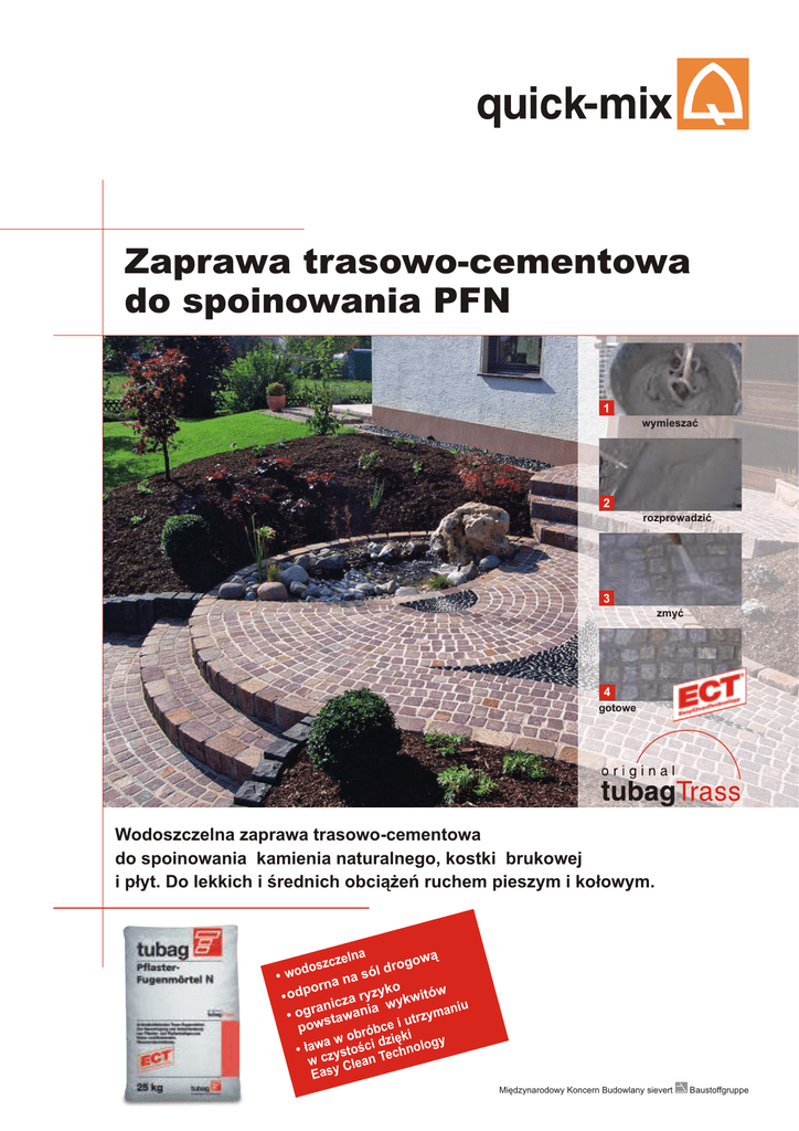 Zaprawa trasowo-cementowa do spoinowania PFN 1 wymieszać 2 rozprowadzić 3 zmyć 4 gotowe Wodoszczelna zaprawa trasowo-cementowa do spoinowania kamienia naturalnego, kostki brukowej i płyt. Do lekkich i średnich obciążeń ruchem pieszym i kołowym. wą elna szcz rogo o d d l o ó •w as rna n o p w yko d •o a ryz wykwitó z c i n a a r i aniu • og stawan trzym u i w e o c p brób i a w o ści dzięk ology w a ł n • o t h s c y w cz Clean Te y s a E Międzynarodowy Koncern Budowlany sievert Baustoffgruppe Zaprawa cementowotrasowa do spoinowania PFN Wodoszczelna zaprawa cementowa z trasem Tubag do spoinowania kamienia naturalnego, kostki brukowej i płyt. Do lekkich i średnich obciążeń ruchem pieszym i kołowym. Właściwości: • łatwe, czyste i racjonalne stosowanie dzięki technice Easy Clean Technology, • jednoskładnikowa, • nieprzepuszczalna dla wody, • kolor szary, • dobra przyczepność do bocznych powierzchni kamienia, • duża odporność na sól drogową, • z trasem Tubag - ogranicza ryzyko powstawania wykwitów. Zastosowanie: • do wykonywania nowych spoin i napraw spoin kostek brukowych i płyt z kamienia naturalnego oraz elementów betonowych, • do ozdobnego kształtowania tarasów, placów i dróg, • do nawierzchni o lekkim i średnim obciążeniu ruchem pieszym i kołowym. Jakość i bezpieczeństwo: • z trasem Tubag wg normy DIN 51043, • cement wg normy PN-EN 197, • sortowane piaski wg normy PN-EN 13139, • zawartość chromianu VI zredukowana do poziomu < 2 ppm, • z zewnętrzną kontrolą jakości. Podłoża: W przypadku bruku głębokość spoiny musi być równa co najmniej podwójnej szerokości spoiny, lecz nie mniej niż 30 mm dla nawierzchni nie obciążonych ruchem kołowym. Dla powierzchni z ruchem kołowym głębokość spoiny musi wynosić co najmniej połowę wysokości kostki lecz nie mniej niż 40 mm. Minimalna szerokość spoiny 5 mm. Maksymalna szerokość spoiny 25 mm. Przygotowanie podłoża: Spoinę należy przed fugowaniem odpowiednio przygotować i oczyścić w razie potrzeby wydrapać do wymaganej głębokości. W zależności od nasiąkliwości powierzchni należy wielokrotnie dokładnie zwilżyć powierzchnię bruku. Jednakże nie dopuszcza się śladów wody w spoinach przy nanoszeniu trasowej zaprawy spoinowej PFN. Przygotowanie i stosowanie: Zawartość worka (25 kg) dokładnie wymieszać ogólnie dostępnym mieszadłam mechanicznym z ok. 5,5 litrami wody do uzyskania jednorodnej i nadającej się do użycia zaprawy. Wprowadzić zaprawę PFN do spoin brukowych raklą gumową skośnie do przebiegu spoin pod lekkim naciskiem, aby spoiny zostały wypełnione całkowicie, szczelnie i głęboko. Pozostałości zaprawy na powierzchni kamienia powinny być jak najmniejsze, ponieważ utrudni to czyszczenie powierzchni. W celu oceny optymalnego wyglądu zalecamy ułożenie próbnej powierzchni z wybranego bruku. W zależności od nasiąkliwości i ukształtowania powierzchni bruku czyszczenie nawierzchni może odbywać się w różny sposób: 1. Bezpośrednio po stwardnieniu powierzchni spoiny należy zmyć nawierzchnię brukową. Stopień stwardnienia spoiny sprawdzić kciukiem. Resztki zaprawy na powierzchni kamienia mogą przy tym być wyschnięte. W zależności od zdolności wchłaniania, ukształtowania powierzchni i temperatury stosowania czas twardnienia wynosi ok. 1 do 3 godzin. Zmyć powierzchnię bruku przy użyciu np. węża ogrodowego (z dyszą natryskową) i średnio twardej miotły, skośnie do przebiegu spoiny. Dopilnować, aby zaprawa nie była wymywana ze spoin. Gdy zaprawa ma skłonność do wymywania, to wymagany stopień stwardnienia nie został jeszcze osiągnięty. Powtarzać zmywanie do czasu pełnego usunięcia smug bez śladów. W razie potrzeby po pełnym stwardnieniu usunąć resztki zanieczyszczeń myjką ciśnieniową. quick-mix Sp. z o.o. Strzelin 57-100, ul Brzegowa 73 tel. 071/ 392 72 20, fax 071/ 392 72 23 e-mail: [email protected], www.quick-mix.pl Dane techniczne wytrzymałość na ściskanie: uziarnienie: szerokość spoiny: czas stosowania: temperatura stosowania: zużycie wody: wydajność: zużycie: przechowywanie: forma dostawy: kolor: ok. 25 N/mm2 0-1,25 mm 5 do 25 mm ok. 15 minut przy + 20 °C od + 10 °C do + 25 °C ok. 5,5 l wody na 25 kg ok. 16 l z 25 kg patrz tabela w suchym i przeznaczonym do tego miejscu worek 25 kg szary 2. Bezpośrednio po stwardnieniu powierzchni spoiny, należy zmyć nawierzchnię brukową. Stwardnienie należy sprawdzić kciukiem. Resztki zaprawy na powierzchni kamienia mogą przy tym być wyschnięte. W zależności od zdolności wchłaniania, ukształtowania powierzchni i temperatury stosowania czas sztywnięcia wynosi ok. 30 do 90 minut. Zmywać powierzchnię bruku raklą gąbczastą skośnie do przebiegu spoiny. Dopilnować, aby zaprawa nie była wymywana ze spoin. Gdy zaprawa ma skłonność do wymywania, to wymagany stopień stwardnienia nie został jeszcze osiągnięty. Systematycznie wymieniać wodę do zmywania. Powtarzać zmywanie do czasu pełnego usunięcia smug bez śladów. W razie potrzeby po pełnym stwardnieniu usunąć resztki zanieczyszczeń myjką ciśnieniową. Czas stosowania wynosi około 15 minut. Nie wykonywać prac przy temperaturach powietrza poniżej +10 °C. Podane czasy odnoszą się do stosowania w normalnym zakresie temperatur (+20 °C, wilgotność względna powietrza 65 %). Wyższe temperatury skracają czas stosowania. Niższe temperatury przedłużają czas stosowania. Obróbka wykańczająca: Zaspoinowane powierzchnie należy chronić przed zbyt szybkim wyschnięciem i niekorzystnymi czynnikami atmosferycznymi jak mróz, przeciągi, bezpośrednie nasłonecznienie oraz bezpośrednimi ulewnymi opadami (w razie potrzeby przykryć folią). Pełne obciążenie: Po brukowanej nawierzchni można chodzić po ok. 3 godzinach, a pełne obciążenie jest możliwe po ok. 7 dniach. Zaprawa Tubag PFN osiąga 2 wytrzyma