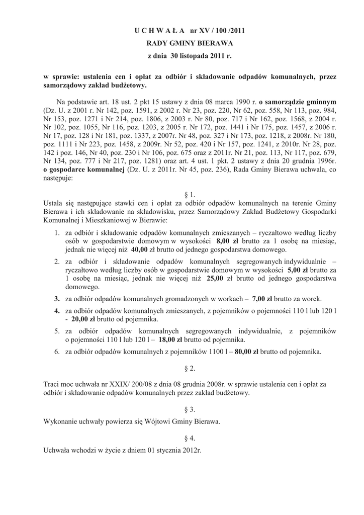 U C H W A Ł A nr XV / 100 /2011 RADY GMINY BIERAWA z dnia 30 listopada 2011 r. w sprawie: ustalenia cen i opłat za odbiór i składowanie odpadów komunalnych, przez samorządowy zakład budŜetowy. Na podstawie art. 18 ust. 2 pkt 15 ustawy z dnia 08 marca 1990 r. o samorządzie gminnym (Dz. U. z 2001 r. Nr 142, poz. 1591, z 2002 r. Nr 23, poz. 220, Nr 62, poz. 558, Nr 113, poz. 984, Nr 153, poz. 1271 i Nr 214, poz. 1806, z 2003 r. Nr 80, poz. 717 i Nr 162, poz. 1568, z 2004 r. Nr 102, poz. 1055, Nr 116, poz. 1203, z 2005 r. Nr 172, poz. 1441 i Nr 175, poz. 1457, z 2006 r. Nr 17, poz. 128 i Nr 181, poz. 1337, z 2007r. Nr 48, poz. 327 i Nr 173, poz. 1218, z 2008r. Nr 180, poz. 1111 i Nr 223, poz. 1458, z 2009r. Nr 52, poz. 420 i Nr 157, poz. 1241, z 2010r. Nr 28, poz. 142 i poz. 146, Nr 40, poz. 230 i Nr 106, poz. 675 oraz z 2011r. Nr 21, poz. 113, Nr 117, poz. 679, Nr 134, poz. 777 i Nr 217, poz. 1281) oraz art. 4 ust. 1 pkt. 2 ustawy z dnia 20 grudnia 1996r. o gospodarce komunalnej (Dz. U. z 2011r. Nr 45, poz. 236), Rada Gminy Bierawa uchwala, co następuje: § 1. Ustala się następujące stawki cen i opłat za odbiór odpadów komunalnych na terenie Gminy Bierawa i ich składowanie na składowisku, przez Samorządowy Zakład BudŜetowy Gospodarki Komunalnej i Mieszkaniowej w Bierawie: 1. za odbiór i składowanie odpadów komunalnych zmieszanych – ryczałtowo według liczby osób w gospodarstwie domowym w wysokości 8,00 zł brutto za 1 osobę na miesiąc, jednak nie więcej niŜ 40,00 zł brutto od jednego gospodarstwa domowego. 2. za odbiór i składowanie odpadów komunalnych segregowanych indywidualnie – ryczałtowo według liczby osób w gospodarstwie domowym w wysokości 5,00 zł brutto za 1 osobę na miesiąc, jednak nie więcej niŜ 25,00 zł brutto od jednego gospodarstwa domowego. 3. za odbiór odpadów komunalnych gromadzonych w workach – 7,00 zł brutto za worek. 4. za odbiór odpadów komunalnych zmieszanych, z pojemników o pojemności 110 l lub 120 l - 20,00 zł brutto od pojemnika. 5. za odbiór odpadów komunalnych segregowanych indywidualnie, z pojemników o pojemności 110 l lub 120 l – 18,00 zł brutto od pojemnika. 6. za odbiór odpadów komunalnych z pojemników 1100 l – 80,00 zł brutto od pojemnika. § 2. Traci moc uchwała nr XXIX/ 200/08 z dnia 08 grudnia 2008r. w sprawie ustalenia cen i opłat za odbiór i składowanie odpadów komunalnych przez zakład budŜetowy. § 3. Wykonanie uchwały powierza się Wójtowi Gminy Bierawa. § 4. Uchwała wchodzi w Ŝycie z dniem 01 stycznia 2012r.