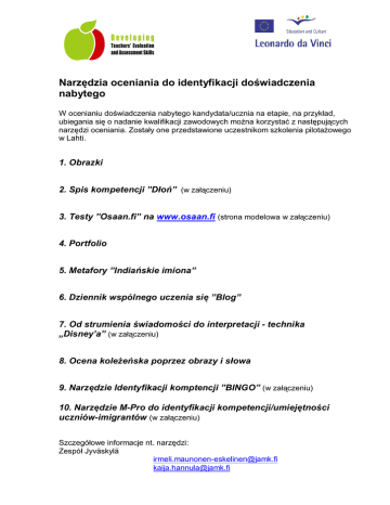 Narz dzia oceniania do identyfikacji do wiadczenia nabytego W ocenianiu do wiadczenia nabytego kandydata/ucznia na etapie, na przyk ad, ubiegania si o nadanie kwalifikacji zawodowych mo na korzysta z nast puj cych narz dzi oceniania. Zosta y one przedstawione uczestnikom szkolenia pilota owego w Lahti. 1. Obrazki 2. Spis kompetencji ”D ” (w za czeniu) 3. Testy ”Osaan.fi” na www.osaan.fi (strona modelowa w za czeniu) 4. Portfolio 5. Metafory ”India skie imiona” 6. Dziennik wspólnego uczenia si ”Blog” 7. Od strumienia wiadomo ci do interpretacji - technika „Disney’a” (w za czeniu) 8. Ocena kole ska poprzez obrazy i s owa 9. Narz dzie Identyfikacji komptencji ”BINGO” (w za czeniu) 10. Narz dzie M-Pro do identyfikacji kompetencji/umiej tno ci uczniów-imigrantów (w za czeniu) Szczegó owe informacje nt. narz dzi: Zespó Jyväskylä [email protected] [email protected] [email protected] [email protected] [email protected] DO WIADCZENIE UMIEJ TNO CI SIECI NASTAWIENIE WIEDZA ENERGIA Spis kompetencji Narz dzie samooceny WIEDZA – teoria, baza informacyjna UMIEJ TNO CI – umiej tno ci lub zdolno ci wykorzystywania informacji I teorii DO WIADCZENIE – kontekst, w którym mo liwe jest wykorzystywanie oraz doskonalenie umiej tno ci i wiedzy SIECI – podniesienie i doskonalenie kompetencji ENERGIA – czynniki fizyczne i umys owe spajaj ce wszelkie inne aspekty oraz opisuj ce mocne strony danej osoby Testy www.osaan.fi Serwis ten jest utrzymywany przez Krajowe Kuratorium O wiaty i wykorzystywany w celu identyfikacji lub oceniania kompetencji zawodowych w ramach Kompetencyjnego Systemu Kwalifikacji Zawodowych dla Doros ych. Ta strona internetowa umo liwia dost p do wszystkich wymaga dotycz cych kwalifikacji zawodowych. Dzi ki niej mo na samodzielnie okre li w asne, obecne kwalifikacje poprzez wybranie odpowiedniego stwierdzenia dla ka dego z wymaga osobno (1= nie potrafi tego zrobi , 2 = Znam to, 3 = Znam to dobrze, jestem kompetentny(a)). Od strumienia wiadomo ci do interpretacji - technika ”Disney’a” Najpierw zaplanuj, czego potrzebujesz si dowiedzie . W ka dym punkcie doko cz zdanie. Najpierw zapisz swoje my li na osobnych kartkach papieru A4. Nast pnie po kartki na pod odze – b dziesz chodzi (a) mi dzy tymi kartkami zatrzymuj c si przy ka dej i post powa (a) zgodnie z my zapisan na danej kartce. Twój partner zapisze, co b dziesz wtedy mówi (a). Po tym, jak obydwoje przejdziecie ju przez wszystkie kartki, usi dziecie i porozmawiacie o my lach zapisanych oraz zinterpretowanych przez partnera oraz spróbujecie sformu owa wspólne rozumienie waszych kompetencji. Technika ta mo e by stosowana na pierwszych spotkaniach (by mo e równie jako cz oceny ko cowej) z uczniem/kandydatem, poprzez zapisanie kluczowych twierdze otwieraj cych rozmowy, w celu pomocy uczniom w opowiedzeniu nam o ich do wiadczeniu nabytym oraz do wiadczeniu zawodowym. Przyk ad: ”Dalsze Kwalifikacje w Zakresie Us ug Domowych – wywiad wst pnej identyfikacji” 1. My , e Us ugi Domowe s … 2. Chc pracowa w Us ugach Domowych, poniewa … 3. Klienci Us ug Domowych mog by … . Jaki jest Twój wymarzony klient… 4. My , e czysty dom jest… 5. Sprz tanie domu wymaga … 6. Do sprz tania w domu potrzebuj … 7. Do moich mocnych stron nale … 8. Chcia bym dalej rozwija moje umiej tno ci w … 9. My , e niezawodno oznacza… 10. Opisz nam, jak wed ug Ciebie wygl da typowy dzie pracy pracownika us ug domowych … BINGO – narz dzie identyfikacji kompetencji Narz dzie to, które przypomina pasek bingo, mo e by wykorzystywane na przyk ad do pomocy zarówno nauczycielowi, jak i uczniowi w identyfikacji wymaga kompetencyjnych danej kwalifikacji zawodowej, na doradczym etapie ubiegania si o jej przyznanie. Wpisz wymagania do siatki oraz zaznacz “ptaszkiem” (kod kolorowy) ma e kwadraciki, gdy zidentyfikujesz badan kompetencj podczas sesji, rozmowy. Zestaw pyta jest pomocny w prowadzeniu rozmowy w kierunku poj kluczowych. Kwalifikacje modelowe: Kompetencje ogólne wymagane w yciu zawodowym jest odpowiedzialny ma dobre maniery jest wydajny Jest aktywny Jest pozytywny Jest rzetelny Jest zdecydowany Jest dok adny Jest dumny ze swojej pracy Cz kwalifikacji modelowej: Pierwsza cz kwalifikacji modelowej Zna obszar swojej dzia alno ci zawodowej ledzi zmiany w obszarze swojej dzia alno ci zawodowej Wie, jak pracowa jako cz onek zespo u Zna struktur organizacyjn swojej firmy Pracuje wg procesów Stosuje si do polece i dyrektyw Instruuje, jak korzysta ze sprz tu biurowego Stosuje si do instrukcji zabezpiecze informatycznych Zna etykiet oraz ró nice kulturowe Mo e obs ugiwa klientów w j zyku szwedzkim i angielskim Wie jak udziela oraz otrzymywa informacj zwrotn Rozpoznaje swoje potrzeby dalszego doskonalenia umiej tno ci Narz dzie M-Pro do identyfikacji kompetencji/umiej tno ci uczniów-imigrantów Narz dzie to zosta o skonstruowane w celu identyfikacji oraz zilustrowania potrzeb uczniów-imigrantów w odniesieniu do doradztwa zawodowego. Pomaga ono zaplanowa wszystkie specjalne kroki, które ucze -imigrant b dzie potrzebowa podj podczas nauki. Narz dzie to jest wykorzystywane do oceny yciowej sytuacji ucznia-imigranta, jego umiej tno ci j zykowych oraz kulturowych, wraz z innymi istotnymi informacjami, w celu umo liwienia mu uzyskania kwalifikacji. Narz dzie to jest w kszta cie tarczy do darta z segmentami ilustruj cymi kluczowe obszary identyfikacji. Mo e by ono wykorzystywane podczas krótkiego wywiadu, lub w trakcie d szego procesu poradniczego. Mo e by wype nione przez ucznia, nauczyciela, czy instruktora stanowiska pracy w celu przedstawienia ró nych pogl dów na temat danych kompetencji ucznia. Profil potrzeb uczniów-imigrantów w odniesieniu do doradztwa zawodowego 8 1 7 2 6 3 5 4 Nazwisko _________________________________________ 1 Podstawowe umiej tno ci j zykowe 2 Wykszta cenie i przeszkolenie w danej dziedzinie (poziom w momencie zg oszenia do szkolenia) 3 Do wiadczenie zawodowe w danej dziedz