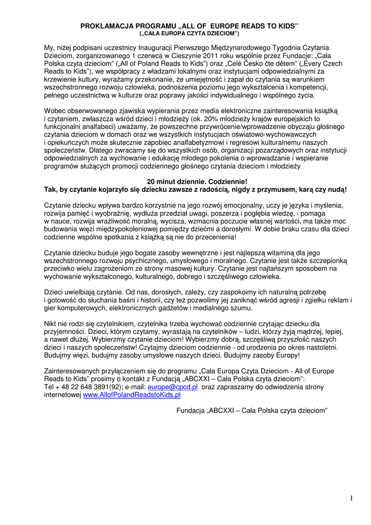 PROKLAMACJA PROGRAMU „ALL OF EUROPE READS TO KIDS” („CAŁA EUROPA CZYTA DZIECIOM”) My, niżej podpisani uczestnicy Inauguracji Pierwszego Międzynarodowego Tygodnia Czytania Dzieciom, zorganizowanego 1 czerwca w Cieszynie 2011 roku wspólnie przez Fundacje: „Cała Polska czyta dzieciom” („All of Poland Reads to Kids”) oraz „Celé Česko čte dětem” („Every Czech Reads to Kids”), we współpracy z władzami lokalnymi oraz instytucjami odpowiedzialnymi za krzewienie kultury, wyrażamy przekonanie, że umiejętność i zapał do czytania są warunkiem wszechstronnego rozwoju człowieka, podnoszenia poziomu jego wykształcenia i kompetencji, pełnego uczestnictwa w kulturze oraz poprawy jakości indywidualnego i wspólnego życia. Wobec obserwowanego zjawiska wypierania przez media elektroniczne zainteresowania książką i czytaniem, zwłaszcza wśród dzieci i młodzieży (ok. 20% młodzieży krajów europejskich to funkcjonalni analfabeci) uważamy, że powszechne przywrócenie/wprowadzenie obyczaju głośnego czytania dzieciom w domach oraz we wszystkich instytucjach oświatowo-wychowawczych i opiekuńczych może skutecznie zapobiec analfabetyzmowi i regresowi kulturalnemu naszych społeczeństw. Dlatego zwracamy się do wszystkich osób, organizacji pozarządowych oraz instytucji odpowiedzialnych za wychowanie i edukację młodego pokolenia o wprowadzanie i wspieranie programów służących promocji codziennego głośnego czytania dzieciom i młodzieży 20 minut dziennie. Codziennie! Tak, by czytanie kojarzyło się dziecku zawsze z radością, nigdy z przymusem, karą czy nudą! Czytanie dziecku wpływa bardzo korzystnie na jego rozwój emocjonalny, uczy je języka i myślenia, rozwija pamięć i wyobraźnię, wydłuża przedział uwagi, poszerza i pogłębia wiedzę, i pomaga w nauce, rozwija wrażliwość moralną, wycisza, wzmacnia poczucie własnej wartości, ma także moc budowania więzi międzypokoleniowej pomiędzy dziećmi a dorosłymi. W dobie braku czasu dla dzieci codzienne wspólne spotkania z książką są nie do przecenienia! Czytanie dziecku buduje jego bogate zasoby wewnętrzne i jest najlepszą witaminą dla jego wszechstronnego rozwoju psychicznego, umysłowego i moralnego. Czytanie jest także szczepionką przeciwko wielu zagrożeniom ze strony masowej kultury. Czytanie jest najtańszym sposobem na wychowanie wykształconego, kulturalnego, dobrego i szczęśliwego człowieka. Dzieci uwielbiają czytanie. Od nas, dorosłych, zależy, czy zaspokoimy ich naturalną potrzebę i gotowość do słuchania baśni i historii, czy też pozwolimy jej zaniknąć wśród agresji i zgiełku reklam i gier komputerowych, elektronicznych gadżetów i medialnego szumu. Nikt nie rodzi się czytelnikiem, czytelnika trzeba wychować codziennie czytając dziecku dla przyjemności. Dzieci, którym czytamy, wyrastają na czytelników – ludzi, którzy żyją mądrzej, lepiej, a nawet dłużej. Wybierzmy czytanie dzieciom! Wybierzmy dobrą, szczęśliwą przyszłość naszych dzieci i naszych społeczeństw! Czytajmy dzieciom codziennie - od urodzenia po okres nastoletni. Budujmy więzi, budujmy zasoby umysłowe naszych dzieci. Budujmy zasoby Europy! Zainteresowanych przyłączeniem się do programu „Cała Europa Czyta Dzieciom - All of Europe Reads to Kids” prosimy o kontakt z Fundacją „ABCXXI – Cała Polska czyta dzieciom”: Tel + 48 22 648 3891(92); e-mail: [email protected] oraz zapraszamy do odwiedzenia strony internetowej www.AllofPolandReadstoKids.pl Fundacja „ABCXXI – Cała Polska czyta dzieciom” 1 Załączniki: A. Korzyści z codziennego czytania dzieciom B. Wyniki badań efektywności programów: „Czytające przedszkola” i „Czytające Szkoły” C. Założenia programów - Czytające Szkoły, Czytające Przedszkola D. Pisma z zaproszeniami dla szkół i przedszkoli do przystąpienia do Programów E. Przykłady dobrych praktyk F. Polecane lektury G. Nasze reklamy i teledyski w wersji angielskiej - adres na You Tube lub Facebooku ZAŁĄCZNIKI A. Korzyści z codziennego czytania dzieciom: Codzienne czytanie dziecku na głos - co potwierdzają badania, a także obserwacje czytających rodzin, przedszkoli i szkół: 1. zaspokaja najważniejsze potrzeby emocjonalne dziecka - miłości, uwagi, stymulacji itp. 2. buduje mocną więź pomiędzy czytającym dorosłym i dzieckiem 3. wspiera rozwój psychiczny dziecka, 4. wzmacnia jego poczucie własnej wartości 5. uczy języka, rozwija słownictwo, daje swobodę w mówieniu 6. przygotowuje do sprawnego samodzielnego czytania i pisania 7. uczy samodzielnego myślenia: logicznego, przyczynowo-skutkowego, krytycznego 8. rozwija wyobraźnię 9. poprawia koncentrację, wycisza i uspokaja 10. ćwiczy pamięć 11. przynosi ogromną wiedzę ogólną 12. ułatwia naukę i pomaga odnieść sukces w szkole 13. uczy dziecko wartości i odróżniania dobra od zła, rozwija wrażliwość moralną 14. rozwija poczucie humoru 15. jest znakomitą rozrywką 16. zapobiega uzależnieniu od telewizji i komputera 17. jest zdrową ucieczka od nudy, niepowodzeń i problemów 18. chroni dziecko przed zagrożeniami ze strony kultury masowej 19. jest profilaktyką działań aspołecznych 20. kształtuje na całe życie nawyk czytania i zdobywania wiedzy B. Wyniki badania efektywności programów „Czytające szkoły” i „Czytające Przedszkola” www.cpcd.pl, zakładka Badania i publikacje C. Założenia programów - Czytające Szkoły, Czytające Przedszkola www.calapolskaczytadzieciom.pl Zakładka: Programy czytelnicze D. Pisma z zaproszeniem szkół i przedszkoli do programów* E. Wskazówki i przykłady dobrych praktyk wypracowanych w ramach kampanii społecznej „Cała Polska czyta dzieciom” Zasady uniwersalne: - Czytamy zawsze w atmosferze entuzjazmu i zachwytu dzieckiem i książką - Codziennie, regularnie, dobrze jest wybrać stałą porę i stworzyć rytuał czytania - Zawsze z myślą o sprawieniu dz