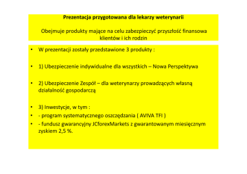 Prezentacja przygotowana dla lekarzy weterynarii Obejmuje produkty mające na celu zabezpieczyć przyszłość finansowa klientów i ich rodzin • W prezentacji zostały przedstawione 3 produkty : • 1) Ubezpieczenie indywidualne dla wszystkich – Nowa Perspektywa • 2) Ubezpieczenie Zespół – dla weterynarzy prowadzących własną działalność gospodarczą • 3) Inwestycje, w tym : • ‐ program systematycznego oszczędzania ( AVIVA TFI ) • ‐ fundusz gwarancyjny JCforexMarkets z gwarantowanym miesięcznym zyskiem 2,5 %. Nowa Perspektywa ubezpieczenie indywidualne dla wszystkich • Ubezpieczenie zabezpiecza finanse rodziny i uczestnika w trudnych sytuacjach życiowych, poprzez: • dowolną sumę ubezpieczenia • zapewnienie dużego wsparcia finansowego w sytuacji zdiagnozowania poważnej choroby m.in. nowotworu złośliwego, zawału serca ‐ opcja „Poważne Zachorowania” • uzyskanie pieniedzy w sytuacji leczenia szpitalnego, obejmującego 1 850 różnych powodów hospitalizacji – od stosunkowo błahych (np. zapalenie oskrzeli), po bardzo poważne (niewydolność narządów wymagające przeszczepu ‐ opcja „Na Zdrowie” • ( przykład ubezpieczenia – następny slajd ) Przykład ubezpieczenia Nowa Perspektywa Pan Kowalski – lekarz weterynarii, lat 45 • Suma ubezpieczenia w przypadku śmierci 55.000 zł – koszt 91,67 zł miesięcznie • Dodatkowa opcja „Poważne Zachorowania” – wypłata 55.000 w przypadku diagnozy choroby, – koszt 36,80 zł miesięcznie • Dodatkowa opcja „ Na Zdrowie” – koszt 30,66 zł miesięcznie • RAZEM: Miesięczny koszt ochrony 159,13 zł. Wysokość składek zależy od wieku i płci ubezpieczonego, w przykładzie podane kwoty są dla mężczyzny w wieku 45 lat Zespół ubezpieczenie dla weterynarzy prowadzących własną działalność gospodarczą ZESPÓŁ to propozycja skierowana do osób prowadzących działalność. Minimalna liczba uczestników to 2 osoby ( osoba prowadząca działalność + małżonek, który nie musi być związany z działalnością) W ubezpieczeniu Zespół można wyodrębnić dwie części: ochronną oraz inwestycyjną Część ochronna obejmuje: ‐ śmierć ubezpieczonego ‐ kalectwo wskutek NW ( NW – nieszczęśliwy wypadek) ‐ trwały uszczerbek na zdrowiu wskutek NW; ‐ niezdolności do pracy wskutek NW; ‐ poważne zachorowania – obejmujące 11 zachorowań; ‐ świadczenie z tytułu leczenia szpitalnego wskutek NW Ubezpieczenie Zespół c.d Składkę ubezpieczeniową minimum 60 zł na osobę miesięcznie, uczestnik dzieli sobie w dowolny sposób na część ochronną i inwestycyjną ( np. 30 zł przeznacza na ochronę a 30 zł miesięcznie inwestuje w funduszach) Dla weterynarzy prowadzących działalność gospodarczą jest możliwość przygotowania indywidualnej oferty Zespół jest najtańszym ubezpieczeniem uwzględniającym III filar Inwestycje Program systematycznego oszczędzania – inwestujemy minimum 100 zł miesięcznie w dowolne wybrane fundusze AVIVA TFI. Fundusz gwarancyjny JCForexMarkets Fundusz gwarantuje miesięczna stopę zwrotu 2,5 % ( w skali roku 27,5 % ‐ 11 miesięcy x 2,5 % , nie uwzględniając comiesięcznej kapitalizacji ) wpłaty tylko w EURO, minimalna wpłata 3.000 EUR Prezentacje przygotował Marek Sztajmec Magister Finansów i Inwestycji MSc Marek Sztajmec Licencjonowany agent Aviva Commercial Union Przedstawiciel funduszu JCForexMarket na Polskę Informacje kontaktowe Telefon kom. 517‐260‐050 ( Orange ) 792‐175‐037 ( Play ) e‐mail : [email protected] Dyżury w biurze Aviva przy ul. Śnigurskiego 12 w Przemyślu Wtorek 14 ‐17 Sobota 12‐14 Proszę o wcześniejsze umówienie spotkania telefonicznie. Dziękuje za zapoznanie się z prezentacja.
