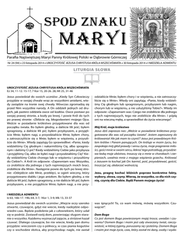 SPOD ZNAKU MARYI Parafia Najświętszej Maryi Panny Królowej Polski w Dąbrowie Górniczej Nr 24 (94) • 23 listopada 2014 • UROCZYSTOŚĆ JEZUSA CHRYSTUSA KRÓLA WSZECHŚWIATA • 30 listopada 2014 • I NIEDZIELA ADWENTU LITURGIA SŁOWA | UROCZYSTOŚĆ JEZUSA CHRYSTUSA KRÓLA WSZECHŚWIATA Ez 34, 11-12. 15-17; 7 Kor 15, 20-26. 28; Mt 25, 31-46 Jezus powiedział do swoich uczniów: „Kiedy Syn Człowieczy przyjdzie w swojej chwale wraz ze wszystkimi aniołami, wtedy zasiądzie na tronie swej chwały. Wówczas zgromadzą się przed Nim wszystkie narody. A On oddzieli jednych od drugich, jak pasterz oddziela owce od kozłów. Owce postawi po swojej prawej stronie, a kozły po lewej. I powie Król do tych po prawej stronie: «Zbliżcie się, błogosławieni mojego Ojca. Weźcie w posiadanie królestwo przygotowane dla was od początku świata. Bo byłem głodny, a daliście Mi jeść; byłem spragniony, a daliście Mi pić; byłem przybyszem, a przyjęliście Mnie; byłem nagi, a przyodzialiście Mnie; byłem chory, a zatroszczyliście się o Mnie; byłem w więzieniu, a przyszliście do Mnie». Wtedy zapytają Go sprawiedliwi: «Panie, kiedy widzieliśmy Cię głodnym i nakarmiliśmy Cię, albo spragnionym i daliśmy Ci pić? Kiedy widzieliśmy Ciebie jako przybysza i przyjęliśmy Cię, albo że byłeś nagi i przyodzialiśmy Cię? Kiedy widzieliśmy Ciebie chorego lub w więzieniu i przyszliśmy do Ciebie?». A Król im odpowie: «Zapewniam was: Wszystko, co zrobiliście dla jednego z tych najmniejszych moich braci, zrobiliście dla Mnie». Następnie powie do tych po lewej stronie: «Odejdźcie ode Mnie, przeklęci, w ogień wieczny, który przygotowano diabłu i jego aniołom. Bo byłem głodny, a nie daliście Mi jeść; byłem spragniony, a nie daliście Mi pić; byłem przybyszem, a nie przyjęliście Mnie; byłem nagi, a nie przy- odzialiście Mnie; byłem chory i w więzieniu, a nie zatroszczyliście się o Mnie». Wtedy oni zapytają: «Panie, kiedy widzieliśmy Cię głodnym lub spragnionym, przybyszem lub nagim, chorym lub w więzieniu, a nie usłużyliśmy Tobie?». Wtedy im odpowie: «Zapewniam was: Czego nie zrobiliście dla jednego z tych najmniejszych, tego nie zrobiliście dla Mnie». I pójdą oni na wieczną mękę, a sprawiedliwi do życia wiecznego”. Mój Król, moje królestwo Jezus dziś zaprasza nas: „Weźcie w posiadanie królestwo przygotowane dla was od początku świata”. Jestem zaproszony do królowania! Ale jak mam to czynić? Jezus jest prawdziwym Królem królów i Panem panujących. On króluje w moim życiu, bo: zaspokaja mój głód prawdy i sensu życia, moje pragnienie miłości, gości mnie w swoim sercu, ilekroć tego potrzebuję, przyodziewa łaską moje ubóstwo, troszczy się o mnie w chorobach i cierpieniach, uwalnia mnie z mojego więzienia grzechu. Królować z Jezusem to kochać jak On: karmić, poić, przyodziewać, gościć, troszczyć się, obdarzać wolnością. Jezu, pragnę kochać bliźnich poprzez konkretne fakty, wybory, słowa, czyny. Wierzę, że wszystko, co dla nich czynię, czynię dla Ciebie. Bądź Panem mojego życia! I NIEDZIELA ADWENTU Iz 63, 16b-17. 19b; 64, 3-7; 1Kor 1, 3-9; Mk 13, 33-37 Jezus powiedział do swoich uczniów: „Miejcie oczy szeroko otwarte, czuwajcie, gdyż nie wiecie, kiedy nadejdzie odpowiedni czas. Będzie podobnie jak z człowiekiem, który udał się w podróż. Zostawił swój dom, powierzając sługom staranie o wszystko. Każdemu wyznaczył zajęcie, a stróżowi kazał czuwać. Dlatego czuwajcie, bo nie wiecie, kiedy pan domu przyjdzie: wieczorem czy o północy, w czas piania kogutów czy o wschodzie słońca, aby przychodząc nagle, nie zastał was śpiących! To, co wam mówię, mówię wszystkim: Czuwajcie!”. Dom Boga Co jest domem Boga powierzonym mojej trosce, uwadze i czuwaniu? Domem Boga i moim jest cały stworzony świat, rzeczywistość, w której żyjemy, poruszamy się i jesteśmy. Domem Boga i moim jest moje życie, czas, który został mi dany, osoby i wyda- rzenia. Domem Boga i moim jest moja osoba, moje serce, moja dusza, moje zdolności i możliwości. Jezus pragnie, aby nasze oczekiwanie było uważne i zarazem pełne ufności, nadziei i radości, a nie niepewności czy lęku. Oto powraca Pan i Przyjaciel, Zbawiciel i Oblubieniec! d IDEOLOGIA GENDER ! Kto jeszcze nie słyszał o ideologii gender, zapewne o niej usłyszy. Oby wiadomości jej dotyczące były prawdziwe i nie poznane zbyt późno. Bo o gender trzeba mówić póki jeszcze można się przed tą śmiercionośną ideologią bronić Czym więc jest gender ideologia? Najkrócej można powiedzieć, że to nowa forma totalitaryzmu, mająca na celu zniszczenie człowieka jako człowieka, bez względu na to, kim jest i skąd pochodzi. Gender ideologia głosi, że każda z osób, która twierdzi, iż człowiek rodzi się jako kobieta lub jako mężczyzna, wychowuje się w rodzinie, którą tworzą matka, ojciec i dziecko lub dzieci, sam chce założyć rodzinę jako związek mężczyzny i kobiety, jest osobą zacofaną, reakcyjną, zniewoloną przez kulturę i religię – i przez to w gruncie rzeczy niebezpieczną dla społeczeństwa. Gender ogłasza, że każdy z nas ma prawo wyboru tożsamości płciowej, że rodzina to związek osób tej samej płci, że wolny jest tylko człowiek, który może uprawiać seks bez ograniczeń i odpowiedzialności, a prawem każdego człowieka winno być prawo do dokonania aborcji. W pakiet działań genderowych na pierwszym miejscu wpisana jest seksualizacja wychowania. Widoczna jest ona w mediach, w popkulturze i modzie, ale przede wszystkim chce zakrólować w szkole. Gender plany dla szkoły i wychowania seksualnego Wiosną tego roku powstał projekt ustawy, na mocy której miał wejść z dniem 31 sierpnia tego roku w obowiązkowy program nauczania na wszystkich poziomach kształcenia w szkole, przedmiot „Wiedza o seksualności człowieka”. Póki co, działania nad wpr