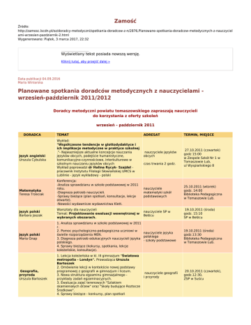 Zamość Źródło: http://zamosc.lscdn.pl/oz/doradcy-metodyczni/spotkania-doradcow-z-n/2876,Planowane-spotkania-doradcow-metodycznych-z-nauczyciel ami-wrzesien-pazdziernik-2.html Wygenerowano: Piątek, 3 marca 2017, 22:32 Wyświetlany tekst posiada nowszą wersję. Kliknij tutaj, aby przejść dalej » Data publikacji 04.09.2016 Maria Winiarska Planowane spotkania doradców metodycznych z nauczycielami wrzesień-październik 2011/2012 Doradcy metodyczni powiatu tomaszowskiego zapraszają nauczycieli do korzystania z oferty szkoleń wrzesień - październik 2011 DORADCA Język angielski Urszula Cybulska TEMAT Wykład: "Współczesne tendencje w glottodydaktyce i ich implikacje metodyczne w praktyce szkolnej ."- Najwazniejsze aktualne koncepcje nauczania języków obcych, podejście humanistyczne, komunikacyjno-czynnościowe, interkulturowe w szkolnym nauczaniu języków obcych Wykład poprowadzi dr Halina Rycyk- Szajdel pracownik Instytutu Filologii Słowiańskiej UMCS w Lublinie - język wykładowy - polski ADRESAT nauczyciele języków obcych czas trwania 2 godz. TERMIN, MIEJSCE 27.10.2011 (czwartek) godz 15:00 w Zespole Szkół Nr 1 w Tomaszowie Lub, ul Wyspiańskiego 8 Matematyka Teresa Trzeciak Konferencja: -Analiza sprawdzianu w szkole podstawowej w 2011 roku. -Diagnoza potrzeb nauczycieli. -Sprawy bieżące (plan spotkań, konsultacje, lekcje otwarte). -Nowości wydawnicze wydawnictwa Klett. nauczyciele matematyki szkół podstawowych 25.10.2011 (wtorek) godz. 14:00 Biblioteka Pedagogiczna w Tomaszowie Lub. Język polski Barbara Jaszak Warsztaty dla nauczycieli Temat: Projektowanie ewaluacji wewnętrznej w wybranych obszarach. nauczyciele SP w Bełżcu 19.10.2011 (środa) godz. 15:10 SP w Bełżcu Język polski Maria Gnap 1. Analiza sprawdzianu w szkole podstawowej w 2011 r. 2. Pomoc psychologiczno-pedagogiczna uczniowi w nauczyciele języka świetle rozporządzenia MEN. polskiego 3. Diagnoza potrzeb edukacyjnych nauczycieli języka - szkoły podstawowe polskiego. 4. Sprawy bieżące (kokursy, spotkania, lekcje koleżeńskie, konsultacje). 19.10.2011 (środa) godz.13:30 Biblioteka Pedagogiczna w Tomaszowie Lub. Geografia, przyroda Urszula Bartoszek 1. Lekcja koleżeńska w kl. III gimnazjum "Światowa metropolia - Londyn". Prowadząca Urszula Bartoszek 2. Omówienie lekcji w kontekście nowej podstawy programowej z geografii w gimnazjum i liceum. nauczyciele geografii 3. Nowa struktura egzaminu gimnazjalnego i przyrody przykłady zadań egzaminacyjnych. 3. Ewaluacja zajęć terenowych "Szlakiem skamieniałych drzew" oraz "Skały budujące Roztocze Środkowe". 4. Sprawy bieżące - konkursy, plan spotkań 20.10.2011 (czwartek), godz.12:30, ZSP w Suścu Historia, WOS Wiesława Gruner 1. Prezentacja oferty edukacyjnej i Muzeum Miejsca Pamięci w Bełżcu. 2. Nowy egzamin gimnazjalny w 2012 roku. 3. Przedstawienie propozycji spotkań z doradcą w nowym roku szkolnym 2011/2012. 4. Diagnoza potrzeb szkoleniowych Język polski Jacek Pawłucki Program konferencji: 1. Analiza wyników matury z j. polskiego w 2011 roku. 2. Pomoc psychologiczno- pedagogiczna uczniowi w szkole. nauczyciele języka 3. Proponowane i już zatwierdzone zmiany w polskiego SPG organizacji matury z j. polskiego w latach następnych. 4. Diagnoza potrzeb edukacyjnych nauczycieli. 5. Nowości wydawnictwa OPERON Edukacja wczesnoszkolna Alina Twardecka Zajęcia otwarte dla koordynatorów edukacji wczesnoszkolnej powiatu Tomaszów Lub.- Edukacja plastyczna w klasie III - "Jesienne bukiety druk strukturalny". Prowadząca - Alina Twardecka - doradca metodyczny 1. Szczegółowa analiza wyników egzaminu maturalnego z matematyki w 2011 roku. Matematyka 2. Ewaluacja zawodów matematycznych PZMat.2011 Ryszard Daczyszyn - propozycja zmian w regulaminie zawodów. Robert Wojciechowski 3. Przedstawienie propozycji tematycznej spotkań (lekcje, warsztaty) z doradcą metodycznym w roku szkolnym 2011/12. nauczyciele historii, wosu szkół podstawowych i gimnazjów 19.10.2011 r. (środa) godz. 13.30-15.30 Gimnazjum Nr 1 w Tomaszowie Lub. 20.10.2011 (czwartek) godz. 15:30 w ZS nr 2 w Tomaszowie Lub., sala nr 11 koordynatorzy EW powiatu tomaszowskiego 18.10.2011 (wtorek) godz.12:00 w Zespole Szkół PodstawowoGimnazjalnych w Jarczowie nauczyciele matematyki SPG 18.10.2011 r. (wtorek) godz. 15:00 ZS Nr 1 w Tomaszowie Lub. Język polski Barbara Jaszak Jolanta Wojciechowska Warsztaty: nauczyciele języka Ocenianie kryterialne różnych form wypowiedzi polskiego w gimnazjum w kontekście egzaminu gimnazjalnego 12.10.2011 r. (środa) godz. 13:30 Biblioteka Pedagogiczna w Tomaszowie Lub. Język angielski Urszula Cybulska Nowa Matura Ustna 2012, informacje dotyczące arkuszy i zasad oceniania nauczyciele języka angielskiego SPG 20.10.2011 (czwartek) godz 15:00 ZS Nr 3 ul. Hallera Tomaszów Lub. Język angielski Urszula Cybulska Nowa Matura Ustna 2012, informacje dotyczące arkuszy i zasad oceniania nauczyciele języka angielskiego SPG 06.10.2011 (czwartek) godz 15:00 ZS Nr 2 ul. Żwirki i Wigury Tomaszów Lub. Język angielski Urszula Cybulska Nowa Matura Ustna 2012, informacje dotyczące arkuszy i zasad oceniania nauczyciele języka angielskiego SPG 03.10.2011 (poniedziałek) godz 15:00, ZS Nr 1 ul. Wyspiańskiego 8, Tomaszów Lub. Język polski Barbara Jaszak Jolanta Wojciechowska Podstawa programowa w edukacji i na egzaminie - konferencja • Egzamin gimnazjalny w kontekście nowej podstawy nauczyciele języka programowej języka polskiego polskiego w gimnazjum • Analiza wyników egzaminu w 2011 r. • Nowa formuła egzaminu gimnazjalnego w 2012 r. • Diagnoza potrzeb nauczycieli Starsze wersje dokumentu 28.09.2011 (środa) godz. 13:30 Biblioteka Pedagogiczna w Tomaszowie Lub.
