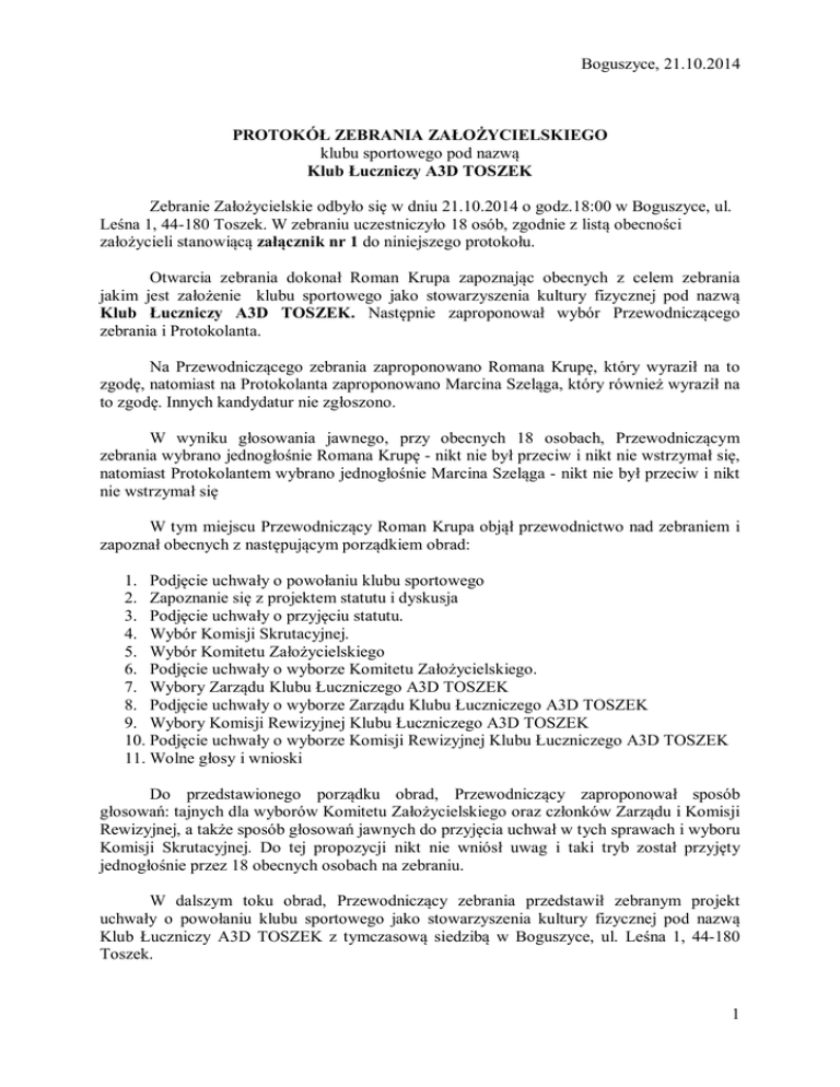 Boguszyce, 21.10.2014 PROTOKÓŁ ZEBRANIA ZAŁOŻYCIELSKIEGO klubu sportowego pod nazwą Klub Łuczniczy A3D TOSZEK Zebranie Założycielskie odbyło się w dniu 21.10.2014 o godz.18:00 w Boguszyce, ul. Leśna 1, 44-180 Toszek. W zebraniu uczestniczyło 18 osób, zgodnie z listą obecności założycieli stanowiącą załącznik nr 1 do niniejszego protokołu. Otwarcia zebrania dokonał Roman Krupa zapoznając obecnych z celem zebrania jakim jest założenie klubu sportowego jako stowarzyszenia kultury fizycznej pod nazwą Klub Łuczniczy A3D TOSZEK. Następnie zaproponował wybór Przewodniczącego zebrania i Protokolanta. Na Przewodniczącego zebrania zaproponowano Romana Krupę, który wyraził na to zgodę, natomiast na Protokolanta zaproponowano Marcina Szeląga, który również wyraził na to zgodę. Innych kandydatur nie zgłoszono. W wyniku głosowania jawnego, przy obecnych 18 osobach, Przewodniczącym zebrania wybrano jednogłośnie Romana Krupę - nikt nie był przeciw i nikt nie wstrzymał się, natomiast Protokolantem wybrano jednogłośnie Marcina Szeląga - nikt nie był przeciw i nikt nie wstrzymał się W tym miejscu Przewodniczący Roman Krupa objął przewodnictwo nad zebraniem i zapoznał obecnych z następującym porządkiem obrad: 1. Podjęcie uchwały o powołaniu klubu sportowego 2. Zapoznanie się z projektem statutu i dyskusja 3. Podjęcie uchwały o przyjęciu statutu. 4. Wybór Komisji Skrutacyjnej. 5. Wybór Komitetu Założycielskiego 6. Podjęcie uchwały o wyborze Komitetu Założycielskiego. 7. Wybory Zarządu Klubu Łuczniczego A3D TOSZEK 8. Podjęcie uchwały o wyborze Zarządu Klubu Łuczniczego A3D TOSZEK 9. Wybory Komisji Rewizyjnej Klubu Łuczniczego A3D TOSZEK 10. Podjęcie uchwały o wyborze Komisji Rewizyjnej Klubu Łuczniczego A3D TOSZEK 11. Wolne głosy i wnioski Do przedstawionego porządku obrad, Przewodniczący zaproponował sposób głosowań: tajnych dla wyborów Komitetu Założycielskiego oraz członków Zarządu i Komisji Rewizyjnej, a także sposób głosowań jawnych do przyjęcia uchwał w tych sprawach i wyboru Komisji Skrutacyjnej. Do tej propozycji nikt nie wniósł uwag i taki tryb został przyjęty jednogłośnie przez 18 obecnych osobach na zebraniu. W dalszym toku obrad, Przewodniczący zebrania przedstawił zebranym projekt uchwały o powołaniu klubu sportowego jako stowarzyszenia kultury fizycznej pod nazwą Klub Łuczniczy A3D TOSZEK z tymczasową siedzibą w Boguszyce, ul. Leśna 1, 44-180 Toszek. 1 Ad.1 - Uchwała nr 1 z dnia 21.10.2014 o powołaniu klubu sportowego Klub Łuczniczy A3D TOSZEK, z tymczasową siedzibą w Boguszyce, ul. Leśna 1, 44-180 Toszek, przy obecnych 18 osobach, została w głosowaniu jawnym przyjęta jednogłośnie, nikt nie był przeciw i nikt nie wstrzymał się. Tekst przyjętej uchwały stanowi załącznik nr 2 niniejszego protokołu. Ad.2 - Następnie Przewodniczący zebrania zapoznał zgromadzonych z projektem statutu klubu sportowego Klub Łuczniczy A3D TOSZEK. W toku dyskusji nad przedłożonym projektem nie zgłoszono żadnych uwag. W związku z powyższym przystąpiono do głosowania. Ad.3 - Uchwała nr 2 z dnia 21.10.2014 o przyjęciu statutu klubu sportowego Klub Łuczniczy A3D TOSZEK, przy obecnych 18 osobach, została w głosowaniu jawnym przyjęta jednogłośnie, nikt nie był przeciw i nikt nie wstrzymał się. Tekst przyjętej uchwały stanowi załącznik nr 3 niniejszego protokołu. Ad.4 – W dalszej części zebrania, Przewodniczący ogłosił wybory Komisji Skrutacyjnej. Do Komisji Skrutacyjnej zgłosiły się następujące osoby: 1. Tomasz Wawrzyniak 2. Łukasz Przybylski W głosowaniu jawnym, przy obecnych 18 osobach, kandydatury zostały przyjęte jednogłośnie, nikt nie był przeciw i nikt nie wstrzymał się. Tym samym, Tomasz Wawrzyniak i Łukasz Przybylski objęli obowiązki Komisji Skrutacyjnej. Ad.5 – Kontynuując zebranie, Przewodniczący ogłosił wybory do Komitetu Założycielskiego dla Klubu Łuczniczego A3D TOSZEK (głosowanie nr 1) pouczając o sposobie głosowania. Do Komitetu Założycielskiego zgłoszono: 1. Roman Krupa 2. Marcin Szeląg Kandydaci wyrazili zgodę i przystąpiono do głosowania tajnego Komisja Skrutacyjna po przeliczeniu głosów z głosowania nr 1, stwierdziła co następuje: 1. W przeprowadzonym głosowaniu tajnym, kandydat do Komitetu Założycielskiego Klubu Łuczniczego A3D TOSZEK, Roman Krupa, uzyskał przy obecnych 18 osobach w czasie głosowania, następującą ilość głosów: Za: 18 głosów / Przeciw: 0 głosów / Nieważnych: 0 głosów W wyniku głosowania Roman Krupa został wybrany do Komitetu Założycielskiego Klubu Łuczniczego A3D TOSZEK. 2. W przeprowadzonym głosowaniu tajnym, kandydat do Komitetu Założycielskiego Klubu Łuczniczego A3D TOSZEK, Marcin Szeląg, uzyskał przy obecnych 18 osobach w czasie głosowania, następującą ilość głosów: Za: 18 głosów / Przeciw: 0 głosów / Nieważnych: 0 głosów 2 W wyniku głosowania Marcin Szeląg został wybrany do Komitetu Założycielskiego Klubu Łuczniczego A3D TOSZEK. Ad.6 – Przewodniczący po zapoznaniu obecnych z treścią uchwały poddał ją pod głosowanie. Uchwała nr 3 z dnia 21.10.2014 o wyborze Komitetu Założycielskiego dla Klubu Łuczniczy A3D TOSZEK, przy obecnych 18 osobach, została w głosowaniu jawnym przyjęta jednogłośnie, nikt nie był przeciw i nikt nie wstrzymał się. Tekst przyjętej uchwały stanowi załącznik nr 4 niniejszego protokołu. Ad.7 - W dalszej części zebrania przewodniczący ogłosił wybory członków Zarządu Klubu Łuczniczego A3D TOSZEK pouczając o sposobie głosowania. Do Zarządu zgłoszono: 1. 2. 3. 4. 5. Roman Krupa - Prezes Rafał Dowhyluk - Wiceprezes Marcin Szeląg - Skarbnik Władysław Andruszkiewicz – Członek Zarządu Paweł Mazalik - Sekretarz Wszyscy kandydaci wyrazili zgodę na kandydowanie i przystąpiono do głosowań tajnych. Komisja Skrutacyjna po przeliczeniu głosów poszczególnych głosow
