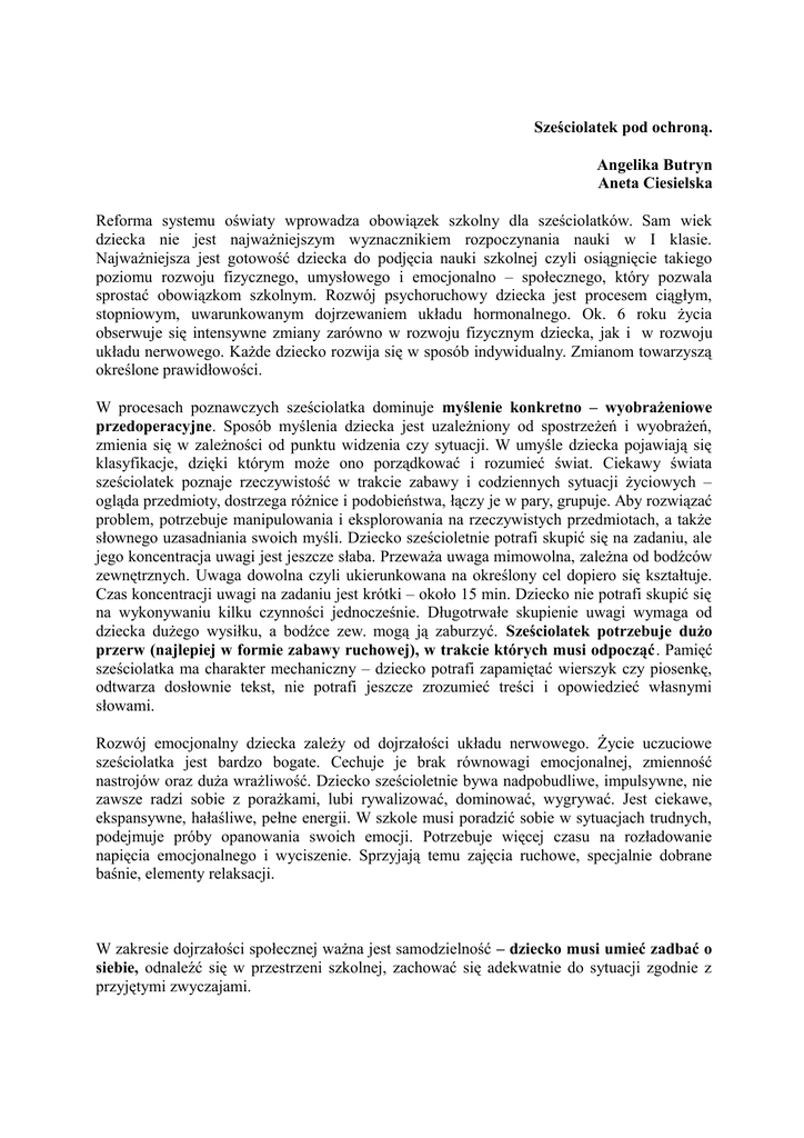 Sześciolatek pod ochroną. Angelika Butryn Aneta Ciesielska Reforma systemu oświaty wprowadza obowiązek szkolny dla sześciolatków. Sam wiek dziecka nie jest najważniejszym wyznacznikiem rozpoczynania nauki w I klasie. Najważniejsza jest gotowość dziecka do podjęcia nauki szkolnej czyli osiągnięcie takiego poziomu rozwoju fizycznego, umysłowego i emocjonalno – społecznego, który pozwala sprostać obowiązkom szkolnym. Rozwój psychoruchowy dziecka jest procesem ciągłym, stopniowym, uwarunkowanym dojrzewaniem układu hormonalnego. Ok. 6 roku życia obserwuje się intensywne zmiany zarówno w rozwoju fizycznym dziecka, jak i w rozwoju układu nerwowego. Każde dziecko rozwija się w sposób indywidualny. Zmianom towarzyszą określone prawidłowości. W procesach poznawczych sześciolatka dominuje myślenie konkretno – wyobrażeniowe przedoperacyjne. Sposób myślenia dziecka jest uzależniony od spostrzeżeń i wyobrażeń, zmienia się w zależności od punktu widzenia czy sytuacji. W umyśle dziecka pojawiają się klasyfikacje, dzięki którym może ono porządkować i rozumieć świat. Ciekawy świata sześciolatek poznaje rzeczywistość w trakcie zabawy i codziennych sytuacji życiowych – ogląda przedmioty, dostrzega różnice i podobieństwa, łączy je w pary, grupuje. Aby rozwiązać problem, potrzebuje manipulowania i eksplorowania na rzeczywistych przedmiotach, a także słownego uzasadniania swoich myśli. Dziecko sześcioletnie potrafi skupić się na zadaniu, ale jego koncentracja uwagi jest jeszcze słaba. Przeważa uwaga mimowolna, zależna od bodźców zewnętrznych. Uwaga dowolna czyli ukierunkowana na określony cel dopiero się kształtuje. Czas koncentracji uwagi na zadaniu jest krótki – około 15 min. Dziecko nie potrafi skupić się na wykonywaniu kilku czynności jednocześnie. Długotrwałe skupienie uwagi wymaga od dziecka dużego wysiłku, a bodźce zew. mogą ją zaburzyć. Sześciolatek potrzebuje dużo przerw (najlepiej w formie zabawy ruchowej), w trakcie których musi odpocząć. Pamięć sześciolatka ma charakter mechaniczny – dziecko potrafi zapamiętać wierszyk czy piosenkę, odtwarza dosłownie tekst, nie potrafi jeszcze zrozumieć treści i opowiedzieć własnymi słowami. Rozwój emocjonalny dziecka zależy od dojrzałości układu nerwowego. Życie uczuciowe sześciolatka jest bardzo bogate. Cechuje je brak równowagi emocjonalnej, zmienność nastrojów oraz duża wrażliwość. Dziecko sześcioletnie bywa nadpobudliwe, impulsywne, nie zawsze radzi sobie z porażkami, lubi rywalizować, dominować, wygrywać. Jest ciekawe, ekspansywne, hałaśliwe, pełne energii. W szkole musi poradzić sobie w sytuacjach trudnych, podejmuje próby opanowania swoich emocji. Potrzebuje więcej czasu na rozładowanie napięcia emocjonalnego i wyciszenie. Sprzyjają temu zajęcia ruchowe, specjalnie dobrane baśnie, elementy relaksacji. W zakresie dojrzałości społecznej ważna jest samodzielność – dziecko musi umieć zadbać o siebie, odnaleźć się w przestrzeni szkolnej, zachować się adekwatnie do sytuacji zgodnie z przyjętymi zwyczajami. W oparciu o Rozporządzenie Ministra Edukacji Narodowej z dnia 27 sierpnia 2012r. w sprawie podstawy programowej wychowania przedszkolnego oraz kształcenia ogólnego w poszczególnych typach szkół (Dziennik Ustaw z dnia 30 sierpnia 2012r., poz. 977) dziecko jest gotowe do podjęcia nauki w szkole, jeżeli: rozumie polecenia formułowane do niego przez dorosłych; mówi poprawnie, uważnie słucha, potrafi zadawać pytania, w zrozumiały sposób mówi o swoich potrzebach; orientuje się w swoim najbliższym otoczeniu; radzi sobie w codziennych sytuacjach życiowych, próbuje, potrafi zwrócić się o pomoc; jest sprawne w zakresie czynności samoobsługowych; stara się współdziałać w zabawie i sytuacjach zadaniowych, przestrzega reguł obowiązujących w grupie, próbuje pokonywać trudności; interesuje się książkami, słucha opowiadań i rozmawia o nich, układa krótkie zdania, dzieli wyrazy na sylaby, wyodrębnia głoski w słowach o prostej budowie fonetycznej; jest sprawne manualnie, ma dobrą koordynację wzrokowo – ruchową potrzebną do rysowania, wycinania i nauki pisania; jest sprawne fizycznie, uczestniczy w zajęciach ruchowych, zabawach i grach zespołowych; buduje konstrukcje z klocków i tworzy kompozycje z różnorodnych materiałów, potrafi przewidywać skutki czynności manipulacyjnych na przedmiotach; klasyfikuje obiekty i formułuje uogólnienia typu: to do tego pasuje, te obiekty są podobne, a te inne; stara się łączyć przyczynę ze skutkiem i próbuje przewidywać, co może się zdarzyć; liczy obiekty, wyznacza wynik dodawania i odejmowania na konkretach, porównuje liczebność i wielkość przedmiotów; rozróżnia lewą i prawą stronę, określa kierunki i ustala położenie obiektów, zna stałe następstwo pór roku, dni tygodnia, miesięcy w roku. Dziecko rozpoczynające naukę w klasie I szkoły podstawowej nie musi umieć czytać, pisać i przeprowadzać działań matematycznych na liczbach. Sześciolatek w szkole ma prawo do: maksymalnie wydłużonego okresu adaptacji, nauki przez zabawę, doświadczanie, eksplorowanie otoczenia, krótkiego czasu koncentracji uwagi na zajęciach, indywidualnego tempa pracy na zajęciach, rozładowania napięcia emocjonalnego poprzez ruch, możliwości przerwy, odpoczynku w czasie lekcji, zapewnienia poczucia bezpieczeństwa i wsparcia ze strony nauczycieli. Rodzice dzieci sześcioletnich mają prawo wymagać od nauczyciela nauczania zintegrowanego dostosowania wymagań do ich możliwości i potrzeb. Nauczyciel powinien stosować atrakcyjne, urozmaicone i zgodne z zainteresowaniami dziecka metody pracy. Oceniając postępy sześciolatka powinien stosować wzmocnienia pozytywne, stosować pochwały i nagrody, które zwiększają motywację do uczenia się. Nie wolno krytykować dziecka za błędy, zmuszać do