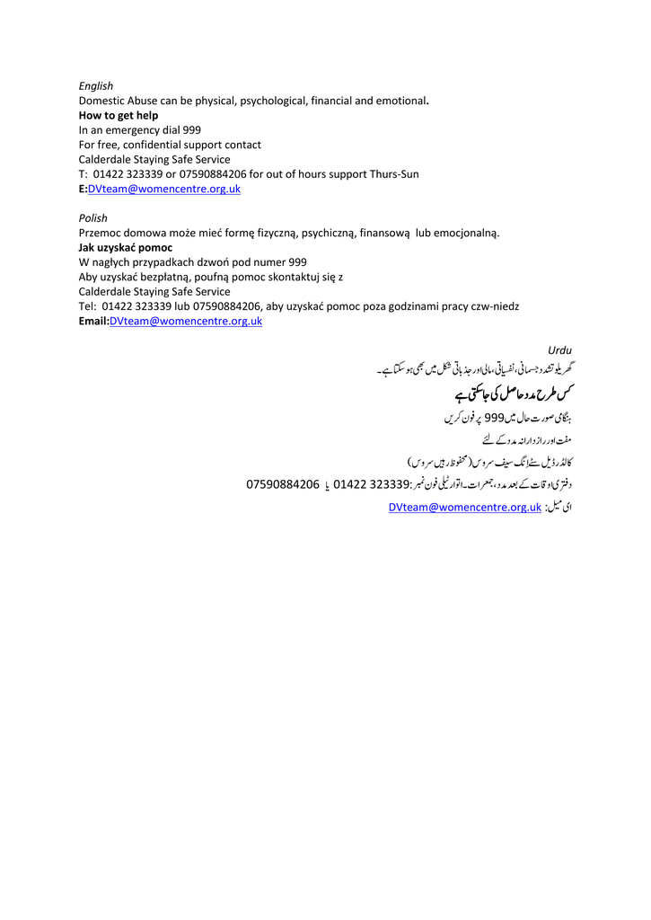 English Domestic Abuse can be physical, psychological, financial and emotional. How to get help In an emergency dial 999 For free, confidential support contact Calderdale Staying Safe Service T: 01422 323339 or 07590884206 for out of hours support Thurs-Sun E:[email protected] Polish Przemoc domowa może mieć formę fizyczną, psychiczną, finansową lub emocjonalną. Jak uzyskać pomoc W nagłych przypadkach dzwoń pod numer 999 Aby uzyskać bezpłatną, poufną pomoc skontaktuj się z Calderdale Staying Safe Service Tel: 01422 323339 lub 07590884206, aby uzyskać pomoc poza godzinami pracy czw-niedz Email:[email protected] Urdu امیلاورجذبایتلکشںیمیھبوہاتکسےہ۔،ایسفنیت،رھگولیدشتدامسجین سکرطحدمداحلصیکاجیتکسےہ رپوفنرکںی999اگنہیموصرتاحلںیم تفماوررازداراہندمدےکےئل )اکڈلرڈلیےٹساِنفیسرسوس(وفحمظرںیہرسوس 07590884206 با01422 323339:رعمجات۔اوتاریلیٹوفنربمن،درتفیاواقتےکدعبدمد [email protected] :ایلیم
