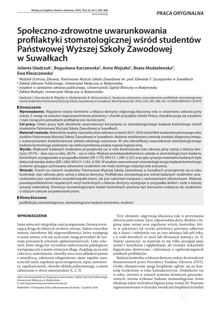 Medycyna Ogólna i Nauki o Zdrowiu, 2016, Tom 22, Nr 4, 282–286 www.monz.pl PRACA ORYGINALNA Społeczno-zdrowotne uwarunkowania profilaktykistomatologicznej wśród studentów Państwowej Wyższej Szkoły Zawodowej w Suwałkach Jolanta Gładczuk1, Bogusława Karczewska2, Anna Wojszko3, Beata Modzelewska4, Ewa Kleszczewska1 Wydział Ochrony Zdrowia, Państwowa Wyższa Szkoła Zawodowa im. prof. Edwarda F. Szczepanika w Suwałkach Zakład Zdrowia Publicznego, Uniwersytet Medyczny w Białymstoku 3 rezydent w dziedzinie zdrowia publicznego, Uniwersytecki Szpital Kliniczny w Białymstoku 4 Zakład Biofizyki, Uniwersytet Medyczny w Białymstoku 1 2 Gładczuk J, Karczewska B, Wojszko A, Modzelewska B, Kleszczewska E. Społeczno-zdrowotne uwarunkowania profilaktyki stomatologicznej wśród studentów Państwowej Wyższej Szkoły Zawodowej w Suwałkach. Med Og Nauk Zdr. 2016; 22(3): 282–286. doi: 10.5604/20834543.1227610 Streszczenie Wprowadzenie. Regularne wizyty kontrolne u lekarza dentysty odgrywają kluczową rolę w utrzymaniu zdrowia jamy ustnej. Z uwagi na znaczne rozpowszechnienie próchnicy i chorób przyzębia młodzi Polacy charakteryzują się wysokimi i stale rosnącymi potrzebami profilaktyczno-leczniczymi. Cel pracy. Celem pracy było określenie uwarunkowań korzystania ze stomatologicznego badania kontrolnego wśród studentów Państwowej Wyższej Szkoły Zawodowej w Suwałkach. Materiał i metoda. Materiał do analizy stanowiły dane zebrane w latach 2013–2016 wśród 864 studentów pierwszego roku studiów Państwowej Wyższej Szkoły Zawodowej w Suwałkach. Badanie zrealizowano metodą sondażu diagnostycznego, z wykorzystaniem kwestionariusza ankiety własnego autorstwa. W celu identyfikacji uwarunkowań stomatologicznego badania kontrolnego posłużono się wieloczynnikową analizą regresji logistycznej. Wyniki. Większość badanych studentów przynajmniej raz w roku kontrolowała stan zdrowia jamy ustnej u lekarza dentysty (37,7% – dwa razy w roku; 38,1% – raz w roku). Większe prawdopodobieństwo udziału w stomatologicznym badaniu kontrolnym występowało w przypadku kobiet (OR 1,775; 95% CI: 1,249–2,521) oraz gdy sytuacja materialna badanych była dobra lub bardzo dobra (OR 1,584; 95% CI: 1,144–2,193). W analizie uwarunkowań stomatologicznego badania kontrolnego zmienne opisujące zachowania zdrowotne studentów nie miały istotnego statystycznie znaczenia. Wnioski. Trzech na czterech studentów Państwowej Wyższej Szkoły Zawodowej w Suwałkach przynajmniej raz w roku kontroluje stan zdrowia jamy ustnej u lekarza dentysty. Profilaktyka stomatologiczna wśród badanych studentów uwarunkowana jest czynnikami socjodemograficznymi, nie jest natomiast związana z zachowaniami zdrowotnymi. Większe prawdopodobieństwo regularnych wizyt kontrolnych u lekarza dentysty występuje w przypadku kobiet i osób o lepszej sytuacji materialnej. Promocja stomatologicznych badań kontrolnych powinna być kierowana zwłaszcza do studentów o niższym statusie socjoekonomicznym. Słowa kluczowe profilaktyka stomatologiczna, stomatologiczne badanie kontrolne, studenci - - - - WPROWADZENIE Jama ustna jest integralną częścią organizmu i bramą otwierającą drogę do dalszych struktur ustroju. Zatem wszystkie zmiany chorobowe lub nieprawidłowości, które występują w jamie ustnej, o ile nie są leczone, mogą prowadzić do rozwoju poważnych schorzeń ogólnoustrojowych. Lista schorzeń, które mogą być wywołane nieleczonymi patologiami występującymi w jamie ustnej jest długa. Znajdują się na niej cukrzyca, nadciśnienie, choroby serca oraz układu krążenia z miażdżycą, zakażenia odogniskowe, stany zapalne uszu, oczu lub zatok, zapalenia opon mózgowych, sepsa, nowotwory, zapalenia nerek, choroby układu pokarmowego, a nawet zaburzenia w sferze emocjonalnej [1, 2, 3]. Adres do korespondencji: Bogusława Karczewska, Zakład Zdrowia Publicznego, Uniwersytet Medyczny w Białymstoku E-mail: [email protected] - Nadesłano: 15 listopada 2016; zaakceptowano do druku: 7 grudnia 2016 Trzy elementy odgrywają kluczową rolę w utrzymaniu zdrowia jamy ustnej. Są to: odpowiednia dieta, dbałość o higienę jamy ustnej oraz regularne wizyty kontrolne, które w zależności od ryzyka próchnicy powinny odbywać się u dzieci i młodzieży raz na trzy miesiące lub pół roku, a u osób dorosłych co sześć lub dwanaście miesięcy [4, 5]. Należy zaznaczyć, że kontrola to nie tylko przegląd jamy ustnej z lusterkiem i zgłębnikiem, ale również wskazówki higieniczno-dietetyczne i informacje o ogólnodostępnych środkach profilaktyki. Badanie kontrolne u lekarza dentysty należy do świadczeń finansowanych przez Narodowy Fundusz Zdrowia (NFZ). Osoby ubezpieczone mogą bezpłatnie zgłosić się na kontrolę trzykrotnie w roku kalendarzowym. Dodatkowo raz w roku, również w ramach systemu świadczeń gwarantowanych, można wykonać badanie stomatologiczne, które obejmuje także instruktaż higieny jamy ustnej [6]. Pomimo zagwarantowania w koszyku świadczeń bezpłatnych badań Medycyna Ogólna i Nauki o Zdrowiu, 2016, Tom 22, Nr 4 Jolanta Gładczuk, Bogusława Karczewska, Anna Wojszko, Beata Modzelewska, Ewa Kleszczewska. Społeczno-zdrowotne uwarunkowania profilaktyki… kontrolnych, większość Polaków korzysta z nich rzadko lub w ogóle. Według wyników reprezentatywnego badania Centrum Badania Opinii Społecznej (CBOS) z 2016 roku, niemal co czwarty Polak (23%) nigdy lub prawie nigdy nie odwiedzał profilaktycznie lekarza dentysty, a 41% respondentów robiło to raz na kilka lat [7]. Stomatologiczne badanie kontrolne może być uwarunkowane różnymi czynnikami. Wiele badań wskazuje na związek pomiędzy częstością korzystania z usług stomatologicznych a czynnikami socjoekonomicznymi (płeć, wiek, sytuacja materialna, status zawodowy) [8, 9, 10, 11, 12, 13, 14, 15]. Istnieje także potwierdzona zależność pomiędzy wybranymi zachowaniami zd