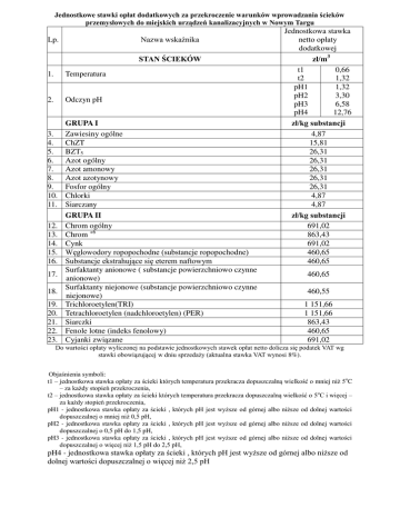 Jednostkowe stawki opłat dodatkowych za przekroczenie warunków wprowadzania cieków przemysłowych do miejskich urządzeń kanalizacyjnych w Nowym Targu Nazwa wskaźnika Lp. STAN CIEKÓW 1. Temperatura 2. Odczyn pH 3. 4. 5. 6. 7. 8. 9. 10. 11. 12. 13. 14. 15. 16. 17. 18. 19. 20. 21. 22. 23. GRUPA I Zawiesiny ogólne ChZT BZT5 Azot ogólny Azot amonowy Azot azotynowy Fosfor ogólny Chlorki Siarczany GRUPA II Chrom ogólny Chrom +6 Cynk Węglowodory ropopochodne (substancje ropopochodne) Substancje ekstrahujące się eterem naftowym Surfaktanty anionowe ( substancje powierzchniowo czynne anionowe) Surfaktanty niejonowe (substancje powierzchniowo czynne niejonowe) Trichloroetylen(TRI) Tetrachloroetylen (nadchloroetylen) (PER) Siarczki Fenole lotne (indeks fenolowy) Cyjanki związane Jednostkowa stawka netto opłaty dodatkowej zł/m3 t1 0,66 t2 1,32 pH1 1,32 pH2 3,30 pH3 6,58 pH4 12,76 zł/kg substancji 4,87 15,81 26,31 26,31 26,31 26,31 26,31 4,87 4,87 zł/kg substancji 691,02 863,43 691,02 460,65 460,65 460,65 460,55 1 151,66 1 151,66 863,43 460,65 691,02 Do wartości opłaty wyliczonej na podstawie jednostkowych stawek opłat netto dolicza się podatek VAT wg stawki obowiązującej w dniu sprzedaży (aktualna stawka VAT wynosi 8%). Objaśnienia symboli: t1 – jednostkowa stawka opłaty za ścieki których temperatura przekracza dopuszczalną wielkość o mniej niż 5oC – za każdy stopień przekroczenia, t2 – jednostkowa stawka opłaty za ścieki których temperatura przekracza dopuszczalną wielkość o 5oC i więcej – za każdy stopień przekroczenia, pH1 - jednostkowa stawka opłaty za ścieki , których pH jest wyższe od górnej albo niższe od dolnej wartości dopuszczalnej o mniej niż 0,5 pH, pH2 - jednostkowa stawka opłaty za ścieki , których pH jest wyższe od górnej albo niższe od dolnej wartości dopuszczalnej o 0,5 pH do 1,5 pH, pH3 - jednostkowa stawka opłaty za ścieki , których pH jest wyższe od górnej albo niższe od dolnej wartości dopuszczalnej o więcej niż 1,5 pH do 2,5 pH, pH4 - jednostkowa stawka opłaty za ścieki , których pH jest wyższe od górnej albo niższe od dolnej wartości dopuszczalnej o więcej niż 2,5 pH