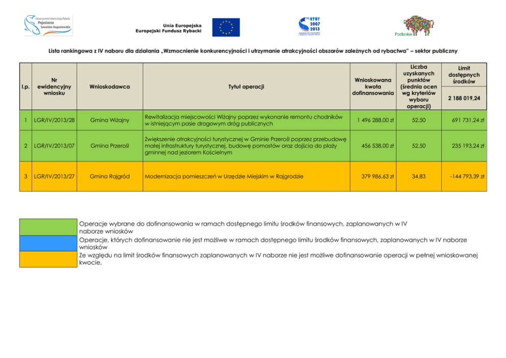 Unia Europejska Europejski Fundusz Rybacki Lista rankingowa z IV naboru dla działania „Wzmocnienie konkurencyjności i utrzymanie atrakcyjności obszarów zależnych od rybactwa” – sektor publiczny Nr ewidencyjny wniosku Wnioskodawca 1 LGR/IV/2013/28 Gmina Wiżajny Rewitalizacja miejscowości Wiżajny poprzez wykonanie remontu chodników w istniejącym pasie drogowym dróg publicznych 2 LGR/IV/2013/07 Gmina Przerośl 3 LGR/IV/2013/27 Gmina Rajgród l.p. Tytuł operacji Wnioskowana kwota dofinansowania Liczba uzyskanych punktów (średnia ocen wg kryteriów wyboru operacji) Limit dostępnych środków 2 188 019,24 1 496 288,00 zł 52,50 691 731,24 zł Zwiększenie atrakcyjności turystycznej w Gminie Przerośl poprzez przebudowę małej infrastruktury turystycznej, budowę pomostów oraz dojścia do plaży gminnej nad jeziorem Kościelnym 456 538,00 zł 52,50 235 193,24 zł Modernizacja pomieszczeń w Urzędzie Miejskim w Rajgrodzie 379 986,63 zł 34,83 -144 793,39 zł Operacje wybrane do dofinansowania w ramach dostępnego limitu środków finansowych, zaplanowanych w IV naborze wniosków Operacje, których dofinansowanie nie jest możliwe w ramach dostępnego limitu środków finansowych, zaplanowanych w IV naborze wniosków Ze względu na limit środków finansowych zaplanowanych w IV naborze nie jest możliwe dofinansowanie operacji w pełnej wnioskowanej kwocie. Unia Europejska Europejski Fundusz Rybacki Lista rankingowa z IV naboru dla działania „Restrukturyzacja lub reorientacja działalności gospodarczej lub dywersyfikacja zatrudnienia osób mających pracę związaną z sektorem rybactwa, w drodze tworzenia dodatkowych miejsc pracy poza tym sektorem” – sektor społeczno-gospodarczy Limit dostępnych środków Nr ewidencyjny wniosku Wnioskodawca 1 LGR/IV/2013/10 Czesław Wołągiewicz Restrukturyzacja działalności Gospodarstwa Rybackiego Czesława Wołągiewicza poprzez zakup specjalistycznego sprzętu do konserwacji i remontów stawów hodowlanych 254 400,00 zł 51,67 216 669,10 zł 2 LGR/IV/2013/35 Agnieszka Mackiewicz Usługi rekreacyjno – turystyczne dla miłośników aktywnego wypoczynku 136 623,90 zł 40,00 80 045,20 zł l.p. Tytuł operacji Wnioskowana kwota dofinansowania Liczba uzyskanych punktów (średnia ocen wg kryteriów wyboru operacji) 471 069,10 zł Operacje wybrane do dofinansowania w ramach dostępnego limitu środków finansowych, zaplanowanych w IV naborze wniosków Operacje, których dofinansowanie nie jest możliwe w ramach dostępnego limitu środków finansowych, zaplanowanych w IV naborze wniosków Ze względu na limit środków finansowych zaplanowanych w IV naborze nie jest możliwe dofinansowanie operacji w pełnej wnioskowanej kwocie. Unia Europejska Europejski Fundusz Rybacki Lista rankingowa z IV naboru dla działania „Ochrona środowiska lub dziedzictwa przyrodniczego na obszarach zależnych od rybactwa w celu utrzymania jego atrakcyjności lub przywrócenia potencjału produkcyjnego sektora rybactwa, w przypadku jego zniszczenia w wyniku klęski żywiołowej” – sektor społeczno-gospodarczy Nr ewidencyjny wniosku Wnioskodawca 1 LGR/IV/2013/14 Ochotnicza Straż Pożarna w Raczkach 2 Stowarzyszenie Miłośników Suwalskiego LGR/IV/2013/21 Parku Krajobrazowego „Kraina Hańczy” l.p. Tytuł operacji Wnioskowana kwota dofinansowania Liczba uzyskanych punktów (średnia ocen wg kryteriów wyboru operacji) Limit środków finansowych na działanie 718 810,27 Zachowanie i zabezpieczenie obszarów objętych szczególnymi formami ochrony, w tym Natura 2000, poprzez zakup nowoczesnego samochodu ratowniczo – gaśniczego dla OSP Raczki 615 060,00 zł 45,00 103 750,27 zł „Ochrona i popularyzacja Suwalskiego Parku Krajobrazowego (obszaru Natura 2000) poprzez edukację przyrodniczą i ukierunkowanie ruchu turystycznego” 741 024,08 zł 45,00 -637 273,81 zł Zwiększenie skuteczności działań na rzecz ochrony środowiska i dziedzictwa przyrodniczego na terenie gminy Bargłów Kościelny poprzez zakup specjalistycznego samochodu ratowniczo- gaśniczego z wyposażeniem dla ratownictwa wodno – ekologiczno - chemicznego. 550 190,00 zł 45,00 -1 187 463,81 zł Budowa ziemnego stawu wodnego jako mała retencja wodna, rowów melioracyjnych wraz z infrastrukturą towarzysząca w celu ochrony wód na terenach przyległych do obszaru Natura 2000 207 911,77 zł 42,19 -1 395 375,58 zł 64 690,56 zł 41,88 -1 460 066,14 zł 3 LGR/IV/2013/05 Ochotnicza Straż Pożarna w Dreństwie 4 LGR/IV/2013/20 Jan Dariusz Rudziewicz 5 LGR/IV/2013/26 Piotr Piłasiewicz 6 LGR/IV/2013/19 Robert Grzeszczyk Budowa ziemnego stawu wodnego jako mała retencja wodna, rowów melioracyjnych wraz z infrastrukturą towarzyszącą w celu ochrony wód na terenach przyległych do obszaru Natura 2000 115 999,10 zł 40,31 -1 576 065,24 zł 7 LGR/IV/2013/34 Ochotnicza Straż Pożarna w Nowej Wsi Zwiększenie potencjału technicznego OSP w Nowej Wsi poprzez zakup nowoczesnego lekkiego samochodu strażackiego wraz z dodatkowym wyposażeniem ratowniczym w celu zachowania i zabezpieczenia terenów objętych szczególną formą ochrony, w tym obszarów Natura 2000 196 486,91 zł 40,00 -1 772 552,15 zł 8 LGR/IV/2013/01 Adam Skoczko Wyposażenie Gospodarstwa Rybackiego Augustów w sprzęt do monitoringu środowiskowego 157 649,12 zł 40,00 -1 930 201,27 zł 9 LGR/IV/2013/03 Robert Tylenda Budowa ziemnego stawu wodnego jako mała retencja wodna w celu ochrony wód na terenach przyległych do obszaru chronionego krajobrazu Natura 2000 201 630,65 zł 35,00 -2 131 831,92 zł „Rekonstrukcja bartnictwa na terenie Puszczy Augustowskiej” Unia Europejska Europejski Fundusz Rybacki 10 LGR/IV/2013/32 Ochotnicza Straż Pożarna w Turówce Nowej 11 LGR/IV/2013/04 Ilona Stawicka 12 LGR/IV/2013/13 Adam Mikstacki 13 LGR/IV/2013/06 Andrzej Adamowicz 14 LGR/IV/2013/23 Sylwia Zdancewicz 15 LGR/IV/2013/31 Grzegorz Kutyło 16 LGR/IV/2013/15 Robert Cezary Mysiukiewicz 17 LGR/IV/2013/25 Zenon Szt