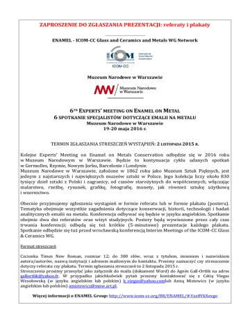 ZAPROSZENIE DO ZGŁASZANIA PREZENTACJI: referaty i plakaty ENAMEL - ICOM-CC Glass and Ceramics and Metals WG Network Muzeum Narodowe w Warszawie 6TH EXPERTS’ MEETING ON ENAMEL ON METAL 6 SPOTKANIE SPECJALISTÓW DOTYCZĄCE EMALII NA METALU Muzeum Narodowe w Warszawie 19-20 maja 2016 r. TERMIN ZGŁASZANIA STRESZCZEŃ WYSTĄPIEŃ: 2 LISTOPADA 2015 R. Kolejne Experts' Meeting on Enamel on Metals Conservation odbędzie się w 2016 roku w Muzeum Narodowym w Warszawie. Będzie to kontynuacja cyklu udanych spotkań w Germolles, Rzymie, Nowym Jorku, Barcelonie i Londynie. Muzeum Narodowe w Warszawie, założone w 1862 roku jako Muzeum Sztuk Pięknych, jest jednym z najstarszych i największych muzeów sztuki w Polsce. Jego kolekcja liczy około 830 tysięcy dzieł sztuki z Polski i zagranicy, od czasów starożytnych do współczesnych, włączając malarstwo, rzeźbę, rysunek, grafikę, fotografię, monety, jak również sztukę użytkową i wzornictwo. Obecnie przyjmujemy zgłoszenia wystąpień w formie referatu lub w formie plakatu (posteru). Tematyka obejmuje wszystkie zagadnienia dotyczące konserwacji, historii, technologii i badań analitycznych emalii na metalu. Konferencja odbywać się będzie w języku angielskim. Spotkanie obejmie dwa dni referatów oraz wizyt studyjnych. Postery będą wywieszone przez cały czas trwania konferencji; odbędą się też krótkie (5-minutowe) prezentacje każdego plakatu. Spotkanie odbędzie się tuż przed wrocławską konferencją Interim Meetings of the ICOM-CC Glass & Ceramics WG. Format streszczeń Czcionka Times New Roman, rozmiar 12; do 300 słów, wraz z tytułem, imieniem i nazwiskiem autora/autorów, nazwą instytucji i adresem mailowym do kontaktu. Prosimy zaznaczyć czy streszczenie dotyczy referatu czy plakatu. Termin zgłaszania streszczeń to 2 listopada 2015 r. Streszczenia prosimy przesyłać jako załącznik do maila (dokument Word) do Agnès Gall-Ortlik na adres [email protected]. W przypadku jakichkolwiek pytań prosimy kontaktować się z Cátią Viegas Wesołowską (w języku angielskim lub polskim) [email protected] Anną Mistewicz (w języku angielskim lub polskim) [email protected]. Więcej informacji o ENAMEL Group: http://www.icom-cc.org/88/ENAMEL/#.Vaz8VkXexgo