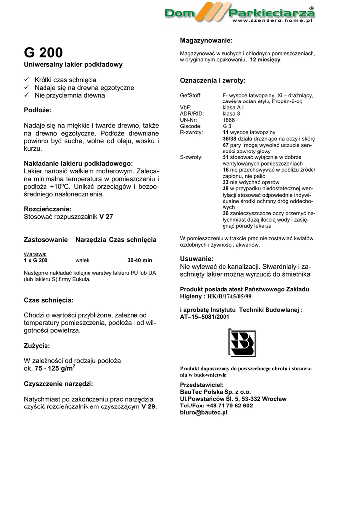 Magazynowanie: G 200 Magazynować w suchych i chłodnych pomieszczeniach, w oryginalnym opakowaniu, 12 miesięcy. Uniwersalny lakier podkładowy Krótki czas schnięcia Nadaje się na drewna egzotyczne Nie przyciemnia drewna Oznaczenia i zwroty: PodłoŜe: VbF; ADR/RID: UN-Nr: Giscode: R-zwroty: Nadaje się na miękkie i twarde drewno, takŜe na drewno egzotyczne. PodłoŜe drewniane powinno być suche, wolne od oleju, wosku i kurzu. GefStoff: S-zwroty: Nakładanie lakieru podkładowego: Lakier nanosić wałkiem moherowym. Zalecana minimalna temperatura w pomieszczeniu i podłoŜa +10ºC. Unikać przeciągów i bezpośredniego nasłonecznienia. Rozcieńczanie: Stosować rozpuszczalnik V 27 F- wysoce łatwopalny, Xi – draŜniący, zawiera octan etylu, Propan-2-ol; klasa A I klasa 3 1866 G3 11 wysoce łatwopalny 36/38 działa draŜniąco na oczy i skórę 67 pary mogą wywołać uczucie senności zawroty głowy 51 stosować wyłącznie w dobrze wentylowanych pomieszczeniach 16 nie przechowywać w pobliŜu źródeł zapłonu, nie palić 23 nie wdychać oparów 38 w przypadku niedostatecznej wentylacji stosować odpowiednie indywidualne środki ochrony dróg oddechowych 26 zanieczyszczone oczy przemyć natychmiast duŜą ilością wody i zasięgnąć porady lekarza Zastosowanie Narzędzia Czas schnięcia W pomieszczeniu w trakcie prac nie zostawiać kwiatów ozdobnych i Ŝywności, akwariów. Warstwa: 1 x G 200 wałek Usuwanie: Nie wylewać do kanalizacji. Stwardniały i zaschnięty lakier moŜna wyrzucić do śmietnika 30-40 min. Następnie nakładać kolejne warstwy lakieru PU lub UA (lub lakieru S) firmy Eukula. Czas schnięcia: Chodzi o wartości przybliŜone, zaleŜne od temperatury pomieszczenia, podłoŜa i od wilgotności powietrza. Produkt posiada atest Państwowego Zakładu Higieny : HK/B/1745/05/99 i aprobatę Instytutu Techniki Budowlanej : AT–15–5081/2001 ZuŜycie: W zaleŜności od rodzaju podłoŜa ok. 75 - 125 g/m2 Czyszczenie narzędzi: Natychmiast po zakończeniu prac narzędzia czyścić rozcieńczalnikiem czyszczącym V 29. Produkt dopuszczony do powszechnego obrotu i stosowania w budownictwie Przedstawiciel: BauTec Polska Sp. z o.o. Ul.Powstańców Śl. 5, 53-332 Wrocław Tel./Fax: +48 71 79 62 602 [email protected]