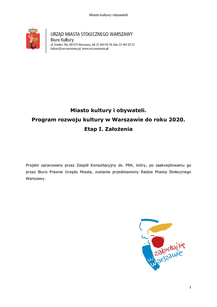 Miasto kultury i obywateli Miasto kultury i obywateli. Program rozwoju kultury w Warszawie do roku 2020. Etap I. Założenia Projekt opracowany przez Zespół Konsultacyjny ds. PRK, który, po zaakceptowaniu go przez Biuro Prawne Urzędu Miasta, zostanie przedstawiony Radzie Miasta Stołecznego Warszawy. 1 Miasto kultury i obywateli [zamiast motta] Warszawa, o jakiej marzymy Warszawa, o jakiej marzymy, jest miastem, którego mieszkańcy – wychodząc z domu lub w nim pozostając – lubią spędzać czas z kulturą, uczestnicząc w niej lub ją tworząc. Jest miastem, w którego różnorodnej ofercie każdy znajduje coś dla siebie; w którym stworzone są warunki do nieskrępowanej twórczości i w którym docenia się kulturę w różnych jej przejawach. Warszawa, o jakiej marzymy, jest miastem nowoczesnym – także technologicznie, coraz lepiej projektowanym, estetycznym, przyjaznym i promującym ekologiczny styl życia. Z przyjemnością spaceruje się po jej ulicach i jeździ po niej rowerem. Choć jest metropolią, jej globalne aspiracje są zakorzenione w lokalności, w budowaniu sąsiedzkich, osiedlowych, dzielnicowych wspólnot. Mieszkańcy Warszawy mają poczucie wpływu na rozwój swojego miasta, a zarządzający miastem są otwarci na ich opinie i potrzeby, mądrze wspierają obywatelską spontaniczność. Do Warszawy, o jakiej marzymy, chce się przyjeżdżać i chce się w niej zostać, gdyż jest interesującym miejscem do życia. Umie pokazać swoją unikatowość, historię i swoje kulturalne osiągnięcia. Warszawa ciepło i przyjaźnie wita gości i nowych mieszkańców. Promuje różnorodność, jest ciekawa innych i otwarta na odmienność. Jest miastem odwiedzanym przez kulturowych turystów i, jako ważne miejsce rozwoju sektora kreatywnego, wędrownych pracowników z całego świata. Wypełnia nową treścią ideę europejskiego miasta kultury. Wymarzona Warszawa jest miastem, które, nawiązując do swojej tradycji inteligenckiej i intelektualnej, z sukcesem odświeżyło czy też zredefiniowało swego rodzaju modę na codzienne obcowanie z kulturą. 2 Miasto kultury i obywateli Spis treści I Wstęp…………………………………………………………………………………………………………..……….4 II Cele……………………………………………………………………………………………………………………..9 III Obszary……………………………………………………………………………………………………..……...9 III.1 Ludzie…………………………………………………………………………………………………..…….…10 III.2 Kreacja (twórczość, wydarzenia, sektor kreatywny)………………………………...13 III.3 Miejsca i przestrzeń…………………………………………………………………………..…..…….18 III.4 Wizerunek……………………………………………………………………………………………..………24 III.5 Tożsamość……………………………………………………………………………………….…………….27 III.6 Zarządzanie…………………………………………………………………………………………..………30 IV Wdrażanie Programu Rozwoju Kultury……………………………………………………..…….35 IV.1 Struktura zarządzania i wdrażania……..………………………………………………….……35 IV.2 Model wdrażania……..……………………………………………………………………………..…….37 IV.3 Harmonogram……………………………………..………………………………………….…...….…..40 IV.4 Finansowanie…………..………………………………………………………………………..….………42 IV.5 Monitoring i ewaluacja…………………………………………………………………………….…….43 Istniejące dokumenty i analizy……………………………………………………………….……………44 Słowniczek pojęć……………………………………………………………………………………………………46 3 Miasto kultury i obywateli I. Wstęp Warszawski Program Rozwoju Kultury do roku 2020 (PRK) wyznacza kierunki polityki kulturalnej Miasta, której głównym zadaniem jest podniesienie rangi i roli kultury w rozwoju Warszawy. PRK wpisuje się, od strony legislacyjnej, w szerszy kontekst dokumentów strategicznych wyznaczających kierunki rozwoju stolicy (jednym z istotniejszych punktów odniesienia jest Społeczna Strategia Warszawy1). Z drugiej strony, tłem prac nad PRK są zachodzące procesy społeczne: zwiększające się zaangażowanie obywateli w budowanie lokalnych społeczności; ich emancypacja (czyli coraz większa potrzeba wpływania na otoczenie, uczestniczenia w podejmowaniu decyzji, bycia partnerem dla władz); a także wzrastająca ranga kultury w kraju, czego dowodem jest choćby ruch Obywateli Kultury czy duża liczba miast, które stanęły do konkursu o tytuł Europejskiej Stolicy Kultury (ESK). Prace nad PRK, tworzonym na zamówienie Urzędu Miasta st. Warszawy od 2008 roku, odzwierciedlają te procesy. W przygotowywanie dokumentu, poza pracownikami Urzędu, zostały włączone liczne środowiska związane z kulturą: eksperckie, pozarządowe, akademickie, przedstawicieli instytucji publicznych i sektora prywatnego. Praca nad PRK stała się także elementem starań Warszawy o tytuł ESK. Skomplikowało to i wydłużyło jego powstawanie, dając jednak szansę na uwzględnienie bardzo wielu punktów widzenia. Ten nowatorski i otwarty proces budowania w dialogu społecznym dokumentu o charakterze strategicznym wpłynął na jego formę. Zdecydowano się odejść od sformalizowanego języka i modelowej konstruk