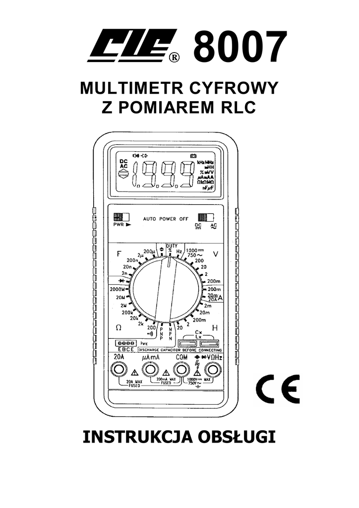 8007 MULTIMETR CYFROWY Z POMIAREM RLC INSTRUKCJA OBSŁUGI SPIS TREŚCI WPROWADZENIE.................................................................................................. 3 ZAWARTOŚĆ ZESTAWU...................................................................................... 3 BEZPIECZEŃSTWO OBSŁUGI............................................................................. 4 OPIS PŁYTY CZOŁOWEJ MIERNIKA................................................................... 5 POMIARY............................................................................................................... 7 Pomiar napięcia...................................................................................................... 7 Pomiar prądu.......................................................................................................... 8 Pomiar rezystancji.................................................................................................. 9 Test ciągłości..........................................................................................................10 Test diod.................................................................................................................10 Pomiar pojemności.................................................................................................10 Pomiar hFE tranzystorów......................................................................................... 11 Pomiar indukcyjności..............................................................................................11 Pomiar częstotliwości Hz i wypełnienia DUTY%.................................................... 11 Test stanów logicznych TTL...................................................................................11 SPECYFIKACJA....................................................................................................12 Dane ogólne........................................................................................................... 12 Dane techniczne.....................................................................................................12 SERWIS................................................................................................................. 14 Wymiana baterii zasilającej.................................................................................... 14 Wymiana bezpieczników........................................................................................ 15 OCHRONA ŚRODOWISKA.................................................................................. 16 -2- WPROWADZENIE Poniższa instrukcja zawiera informacje i ostrzeżenia, których należy przestrzegać, aby posługiwać się miernikiem w sposób bezpieczny tak dla operatora jak i dla samego urządzenia. OSTRZEŻENIE PRZED UŻYCIEM PRZYRZĄDU NALEŻY ZAPOZNAĆ SIĘ Z PUNKTEM DOTYCZĄCYM „BEZPIECZEŃSTWA OBSŁUGI” Miernik ten jest urządzeniem przenośnym przeznaczonym do użytku laboratoryjnego, w serwisach oraz dla celów hobbystycznych. Urządzenie zapewnia precyzyjny cyfrowy pomiar, a wzmocniona obudowa chroni go przed udarami mechanicznymi i wysoką temperaturą. Całość umieszczona jest dodatkowo w miękkim holsterze chroniącym miernik przed udarami mechanicznymi. Model 8007 posiada elektroniczne zabezpieczenia wszystkich funkcji i zakresów pomiarowych. Dzięki tym wszystkim cechom model CIE 8007 jest bardzo wytrzymałym, precyzyjnym i profesjonalnym narzędziem pomiarowym. ZAWARTOŚĆ ZESTAWU Po rozpakowaniu nowego multimetru w zestawie powinny znajdować się następujące elementy: 1. Multimetr 2. Przewody pomiarowe (para) 3. Bateria 9V (w mierniku) 4. Instrukcja obsługi 5. Zapasowy bezpiecznik 0.5A/600V (6.35 x 25.4 mm, ceramiczny, szybki) Kompletność zestawu należy sprawdzić w momencie zakupu w obecności sprzedawcy. -3- BEZPIECZEŃSTWO OBSŁUGI Poniższa instrukcja obsługi zawiera informacje i ostrzeżenia, których należy przestrzegać, aby bezpiecznie posługiwać się miernikiem jednocześnie obsługując go w bezpiecznych warunkach: 1. Należy zachować dużą ostrożność przy pomiarze napięć przekraczających 40VDC lub 20VACrms. Napięcia te stanowią potencjalne zagrożenie dla człowieka. 2. Przed użyciem miernika należy zawsze sprawdzić przewody pomiarowe, wtyki bananowe i sondy pomiarowe pod kątem ewentualnych zniszczeń izolacji lub odsłoniętych części metalowych. Jeżeli zostaną wykryte uszkodzenia należy je bezwzględnie usunąć przed przystąpieniem do pomiarów. 3. Podczas pomiarów operator nie może mieć bezpośredniego kontaktu z elementami o potencjale ziemi (np. odsłonięte metalowe rury instalacji c.o., przewody uziemienia, itp.). Należy zapewnić sobie dobrą izolację dzięki odpowiednim ubraniom roboczym, obuwiu, matom izolującym, itd. 4. Nie wolno dotykać odsłoniętych części przewodzących jeżeli do mierzonego obwodu załączone jest zasilanie. 5. Bezpiecznik ceramiczny należy wymieniać na taki sam lub jego dokładny odpowiednik. 6. Miernika nie wolno używać w atmosferze grożącej wybuchem (np. w obecności gazów łatwopalnych, oparów, pyłów, itp.) 7. Nigdy nie wolno przekraczać maksymalnych wartości na wybranym zakresie pomiarowym, zgodnie z opisem na płycie czołowej miernika. 8. Potencjał na gnieździe COM w stosunku do „ziemi” nie może przekraczać 500VDC. 9. Aby uniknąć ryzyka pożaru lub porażenia prądem, należy chronić miernik przed bezpośrednimi promieniami słonecznymi, ekstremalnymi temperaturami, deszczem i wilgocią. Miernik przeznaczony jest do użytku wewnątrz pomieszczeń. 10. Przy sprawdzaniu obecności napięcia należy upewnić się, że funkcja ta działa prawidłowo (za pomocą pomiaru znanej wartości napięcia) zanim przyjmie się, że zerowy odczyt oznacza brak napięcia. -4- Miernik wykonany jest w II klasie izolacji i spełnia wymogi kat. II 1000V zgodnie z normą IEC 1010. Symbole opisu miernika: 