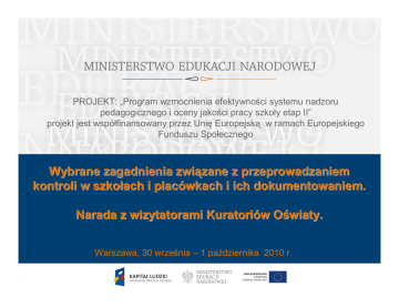 PROJEKT: „Program wzmocnienia efektywności systemu nadzoru pedagogicznego i oceny jakości pracy szkoły etap II” projekt jest współfinansowany przez Unię Europejską w ramach Europejskiego Funduszu Społecznego Wybrane zagadnienia związane z przeprowadzaniem kontroli w szkołach i placówkach i ich dokumentowaniem. Narada z wizytatorami Kuratoriów Oświaty. Warszawa, 30 września – 1 października 2010 r. Zagadnienia związane z przeprowadzaniem kontroli § 11 – 16 oraz § 18 ust. 5 pkt 2 rozporządzenia Ministra Edukacji Narodowej z dnia 7 października 2009 r. w sprawie nadzoru (Dz.U. Nr 168, poz. 1324) Zarówno kontrole planowe, jak i kontrole doraźne muszą być przeprowadzane zgodnie z procedurami opisanymi w rozporządzeniu. O czym warto pamiętać przy przeprowadzaniu kontroli doraźnych 1) Kontrola doraźna jest zarządzana, gdy zaistnieje potrzeba podjęcia działań nieujętych w planie nadzoru pedagogicznego (np. wniosek, stwierdzenie potrzeby w wyniku dotychczasowego nadzoru…) O czym warto pamiętać przy przeprowadzaniu kontroli doraźnych c.d. Potrzeba przeprowadzenia kontroli doraźnej moŜe takŜe wynikać z zarzutów dotyczących funkcjonowania szkoły lub placówki zgłoszonych w skardze złoŜonej do Kuratorium Oświaty na podstawie przepisów K.p.a. W celu wyjaśnienia zasadności zarzutów dotyczących zagadnień wchodzących w zakres nadzoru pedagogicznego, niezbędne jest wówczas przeprowadzenie kontroli doraźnej. W takim przypadku, w celu rozpatrzenia skargi (zgodnie z trybem K.p.a.) stosujemy równieŜ procedurę przeprowadzania kontroli doraźnej (od powiadomienia dyrektora szkoły/placówki, do sporządzenia protokołu). sporządzenie protokołu kontrola doraźna decyzja o konieczności przeprowadzenia kontroli doraźnej przyjęcie skargi/wniosku podpisanie I tydzień decyzja dotycząca sposobu rozpatrzenia: •przekazanie do właściwego organu – art. 231 K.p.a. •przekazanie do organu niŜszego stopnia – art. 232 § 1 i 2 K.p.a. odmowa podpisu uzasadnienie odmowy kolejne 3 tygodnie zastrzeŜenia do ustaleń w protokole rozpatrzenie zastrzeŜeń i wydanie stanowiska wobec zastrzeŜeń – 14 dni od otrzymania zastrzeŜeń podpisanie następne tygodnie (do wyznaczonego w piśmie terminu) załatwianie skargi lub wniosku •zawiadomienie o sposobie załatwienia skargi/wniosku •zawiadomienie strony o niezałatwieniu w terminie i wskazanie nowego terminu zawiadomienie o sposobie załatwienia skargi/wniosku O czym warto pamiętać przy przeprowadzaniu kontroli doraźnych 2) Kontrolę doraźną, podobnie jak planową, organizuje się z uwzględnieniem § 12 -14 rozporządzenia: a) przeprowadza się ją na podstawie imiennego upowaŜnienia zawierającego wszystkie wymagane elementy (datę wydania i numer, podstawę prawną kontroli, imię i nazwisko osoby upowaŜnionej, nazwę i siedzibę szkoły lub placówki, tematykę kontroli, terminy rozpoczęcia i zakończenia kontroli, pieczęć i podpis organu sprawującego nadzór pedagogiczny) Tematyka kontroli doraźnej musi wynikać z potrzeby przeprowadzenia działań nieujętych w planie nadzoru pedagogicznego (wniosku, zakresu tematycznego skargi itp. ) – wizytator nie jedzie do szkoły lub placówki po to by skontrolować całokształt, tylko, aby zbadać konkretne zagadnienia; musi stanowić zakres nadzoru pedagogicznego (na 3650 kontroli doraźnych w roku 2009/2010, aŜ 2036 przeprowadzono w obszarach innych, niŜ wymienione w art. 33 ust. 2 ustawy o systemie oświaty); O czym warto pamiętać przy przeprowadzaniu kontroli b) Kontrolujący: • • • • rzetelnie i obiektywnie ustala stan faktyczny zbiera niezbędne dowody stanowiące podstawę ustaleń kontroli zapewnia dyrektorowi szkoły czynny udział w kontroli dokumentuje czynności kontrolne c) Zebrane w toku kontroli dokumenty stanowią akta kontroli d) Kontrolujący w ciągu 7 dni od dnia zakończenia kontroli sporządza protokół kontroli. Rzetelność i obiektywizm kontrolującego Rzetelność – wypełnianie obowiązków z naleŜytą starannością, sumiennie i terminowo z uwzględnieniem przestrzegania wewnętrznych reguł funkcjonowania Kuratorium Oświaty. • Dotyczy czynności związanych z organizacją kontroli (zarówno doraźnej jak i planowej) – powiadomienie dyrektora szkoły lub placówki o kontroli, zaplanowanie czynności kontrolnych, w przypadku kontroli doraźnej: określenie zakresu kontroli – sprecyzowanie szczegółowych zagadnień podlegających kontroli (wynikających z tematu kontroli), moŜe przygotowanie arkusza kontroli doraźnej, określenie metodyki kontroli (sposobu pozyskiwania informacji). Kontrola doraźna nie jest ujęta w planie nadzoru pedagogicznego Kuratora Oświaty, ale to nie znaczy, Ŝe jej przeprowadzenie nie wymaga od wizytatora przygotowania (szczegółowego zaplanowania przebiegu). Rzetelność i obiektywizm kontrolującego • Rzetelność jest teŜ poŜądana przy przeprowadzaniu kontroli i wyraŜa się m.in. w: dociekliwości i dokładności w poszukiwaniu, gromadzeniu i weryfikowaniu dowodów, staranności dokumentowania i porządkowania, dokumentacji, terminowości realizacji zadań. Rzetelność i obiektywizm kontrolującego Obiektywizm – przedstawianie i ocenianie czegoś w sposób zgodny ze stanem faktycznym, niezaleŜnie od własnych opinii, uczuć i interesów. Od kontrolującego wymaga się, aby stosował się do zasady obiektywizmu • od pierwszych pomysłów na przeprowadzenie kontroli (określanie tematyki, zakresu kontroli, osób, od których będą pozyskiwane informacje itp.), • poprzez realizację czynności kontrolnych (konsekwentne wykonywanie wszystkich zaplanowanych obszarów, mimo intuicyjnych podpowiedzi co do wyników kontroli), • do sfinalizowania kontroli w formie przedstawienia jej wyników w protokole kontroli (opis ustalonego stanu faktycznego ma być opisem zastanego w dniu kontroli fragmentu rzeczywistości szkolnej (czy placówki) a nie 