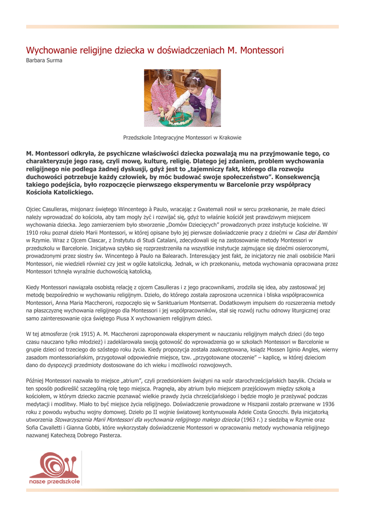Wychowanie religijne dziecka w doświadczeniach M. Montessori Barbara Surma Przedszkole Integracyjne Montessori w Krakowie M. Montessori odkryła, że psychiczne właściwości dziecka pozwalają mu na przyjmowanie tego, co charakteryzuje jego rasę, czyli mowę, kulturę, religię. Dlatego jej zdaniem, problem wychowania religijnego nie podlega żadnej dyskusji, gdyż jest to „tajemniczy fakt, którego dla rozwoju duchowości potrzebuje każdy człowiek, by móc budować swoje społeczeństwo”. Konsekwencją takiego podejścia, było rozpoczęcie pierwszego eksperymentu w Barcelonie przy współpracy Kościoła Katolickiego. Ojciec Casulleras, misjonarz świętego Wincentego à Paulo, wracając z Gwatemali nosił w sercu przekonanie, że małe dzieci należy wprowadzać do kościoła, aby tam mogły żyć i rozwijać się, gdyż to właśnie kościół jest prawdziwym miejscem wychowania dziecka. Jego zamierzeniem było stworzenie „Domów Dziecięcych” prowadzonych przez instytucje kościelne. W 1910 roku poznał dzieło Marii Montessori, w której opisane było jej pierwsze doświadczenie pracy z dziećmi w Casa dei Bambini w Rzymie. Wraz z Ojcem Clascar, z Instytutu di Studi Catalani, zdecydowali się na zastosowanie metody Montessori w przedszkolu w Barcelonie. Inicjatywa szybko się rozprzestrzeniła na wszystkie instytucje zajmujące się dziećmi osieroconymi, prowadzonymi przez siostry św. Wincentego à Paulo na Balearach. Interesujący jest fakt, że inicjatorzy nie znali osobiście Marii Montessori, nie wiedzieli również czy jest w ogóle katoliczką. Jednak, w ich przekonaniu, metoda wychowania opracowana przez Montessori tchnęła wyraźnie duchowością katolicką. Kiedy Montessori nawiązała osobistą relację z ojcem Casulleras i z jego pracownikami, zrodziła się idea, aby zastosować jej metodę bezpośrednio w wychowaniu religijnym. Dzieło, do którego została zaproszona uczennica i bliska współpracownica Montessori, Anna Maria Maccheroni, rozpoczęło się w Sanktuarium Montserrat. Dodatkowym impulsem do rozszerzenia metody na płaszczyznę wychowania religijnego dla Montessori i jej współpracowników, stał się rozwój ruchu odnowy liturgicznej oraz samo zainteresowanie ojca świętego Piusa X wychowaniem religijnym dzieci. W tej atmosferze (rok 1915) A. M. Maccheroni zaproponowała eksperyment w nauczaniu religijnym małych dzieci (do tego czasu nauczano tylko młodzież) i zadeklarowała swoją gotowość do wprowadzenia go w szkołach Montessori w Barcelonie w grupie dzieci od trzeciego do szóstego roku życia. Kiedy propozycja została zaakceptowana, ksiądz Mossen Iginio Angles, wierny zasadom montessoriańskim, przygotował odpowiednie miejsce, tzw. „przygotowane otoczenie” – kaplicę, w której dzieciom dano do dyspozycji przedmioty dostosowane do ich wieku i możliwości rozwojowych. Później Montessori nazwała to miejsce „atrium”, czyli przedsionkiem świątyni na wzór starochrześcijańskich bazylik. Chciała w ten sposób podkreślić szczególną rolę tego miejsca. Pragnęła, aby atrium było miejscem przejściowym między szkołą a kościołem, w którym dziecko zacznie poznawać wielkie prawdy życia chrześcijańskiego i będzie mogło je przeżywać podczas medytacji i modlitwy. Miało to być miejsce życia religijnego. Doświadczenie prowadzone w Hiszpanii zostało przerwane w 1936 roku z powodu wybuchu wojny domowej. Dzieło po II wojnie światowej kontynuowała Adele Costa Gnocchi. Była inicjatorką utworzenia Stowarzyszenia Marii Montessori dla wychowania religijnego małego dziecka (1963 r.) z siedzibą w Rzymie oraz Sofia Cavalletti i Gianna Gobbi, które wykorzystały doświadczenie Montessori w opracowaniu metody wychowania religijnego nazwanej Katechezą Dobrego Pasterza.