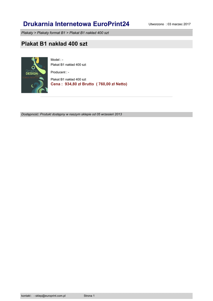 Drukarnia Internetowa EuroPrint24 Plakaty > Plakaty format B1 > Plakat B1 nakład 400 szt Plakat B1 nakład 400 szt Model : Plakat B1 nakład 400 szt Producent : Plakat B1 nakład 400 szt Cena : 934,80 zł Brutto ( 760,00 zł Netto) Dostępność: Produkt dostępny w naszym sklepie od 05 wrzesień 2013 kontakt : - [email protected] Strona 1 Utworzono : 03 marzec 2017