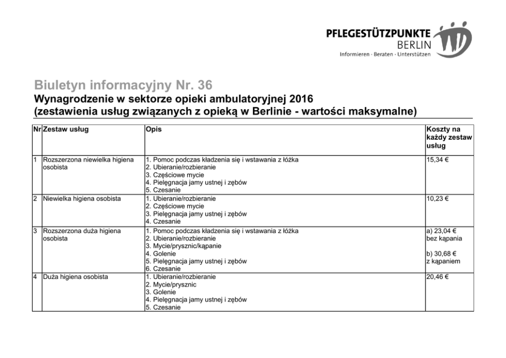 Biuletyn informacyjny Nr. 36 Wynagrodzenie w sektorze opieki ambulatoryjnej 2016 (zestawienia usług związanych z opieką w Berlinie - wartości maksymalne) Nr Zestaw usług Opis Koszty na każdy zestaw usług 1 Rozszerzona niewielka higiena osobista 1. Pomoc podczas kładzenia się i wstawania z łóżka 2. Ubieranie/rozbieranie 3. Częściowe mycie 4. Pielęgnacja jamy ustnej i zębów 5. Czesanie 1. Ubieranie/rozbieranie 2. Częściowe mycie 3. Pielęgnacja jamy ustnej i zębów 4. Czesanie 1. Pomoc podczas kładzenia się i wstawania z łóżka 2. Ubieranie/rozbieranie 3. Mycie/prysznic/kąpanie 4. Golenie 5. Pielęgnacja jamy ustnej i zębów 6. Czesanie 1. Ubieranie/rozbieranie 2. Mycie/prysznic 3. Golenie 4. Pielęgnacja jamy ustnej i zębów 5. Czesanie 15,34 € 2 Niewielka higiena osobista 3 Rozszerzona duża higiena osobista 4 Duża higiena osobista 10,23 € a) 23,04 € bez kąpania b) 30,68 € z kąpaniem 20,46 € 5 Układanie/układanie w łóżku 6 Pomoc przy przyjmowaniu pokarmu 7 Wypróżnianie jelit i pęcherza a 7 Wypróżnianie jelit i pęcherza b 8 Pomoc podczas wychodzenia i powrotów do mieszkania 9 Towarzyszenie poza domem 1. Układanie, ścielenie/przygotowywanie łóżka 2. Poruszanie się w łóżku 1. Pomoc podczas podchodzenia i odchodzenia z miejsca jedzenia 2. Pomoc/nadzór podczas jedzenia i picia 3. Higiena związana z przyjmowaniem pokarmu 5,11 € Pomoc/wsparcie podczas wypróżniania jelit i/lub pęcherza, usuwanie ekskrementów 1. Ubieranie/rozbieranie 2. Pomoc/wsparcie podczas wypróżniania jelit i/lub pęcherza, np. Opieka w zakresie nietrzymania, prowadzenie do toalety, usuwanie ekskrementów 3. Higiena intymna 1. Ubieranie i rozbieranie podczas wychodzenia lub powrotów do mieszkania 2. Wchodzenie po schodach Towarzyszenie podczas czynności, które wymagają osobistego stawienia się, wizyta w domu nie jest możliwa (nie dotyczy spacerów, imprez kulturalnych. 4,07 € 12,81 € 10,23 € 3,57 € 30,68 € 10 Wprowadzanie się do mieszkania 1. Pobieranie środków opałowych z zapasów w domu 2. Usuwanie pozostałości ze spalania 3. Ogrzewanie 5,96 € 11a Sprzątanie mieszkania 4,47 € Segregacja/wyrzucanie odpadów, zmywanie/sprzątanie Segregacja/wyrzucanie odpadów, czyszczenie łazienki, toalety, kuchni, salonu i sypialni, odkurzanie, sprzątanie na mokro, zmywanie/wycieranie kurzów 12 Zmiana oraz pranie bielizny i Zmiana bielizny, również pościeli, pielęgnacja bielizny i odzieży (np. prasowanie, naprawianie) oraz odzieży układanie prania 13 Zakupy Tworzenie planu zakupów i posiłków, kupowanie artykułów spożywczych oraz innych produktów do użytku osobistego, a także układanie zakupionych artykułów 14 Przygotowywanie ciepłych 1. Gotowanie posiłków w domu osoby 2. Podgrzewanie obiadów mrożonych wymagającej opieki 3. Zmywanie naczyń stosowanych podczas posiłków (nie dotyczy dostarczanych 4. Czyszczenie miejsca pracy ciepłych posiłków) 11b Czyszczenie mieszkania 13,41 € 23,83 € 11,92 € 13,41 € Biuletyn informacyjny nr 36 Stan 01/17 Bezpłatna informacja telefoniczna: 0800 5950059 Strona 2 z 5 15 Przygotowywanie pozostałych posiłków w domu osoby wymagającej opieki (m.in również dostarczanych ciepłych posiłków) 16a Pierwsza wizyta 16b Kolejna wizyta 17 Ryczałt za pracę (18)1 Opieka na podstawie § 37 ust. 3 kodeksu społecznego XI 1 1. Przygotowywanie dostarczanego ciepłego jedzenia lub innych posiłków 2. Zmywanie naczyń stosowanych podczas posiłków 3. Czyszczenie miejsca pracy 4,47 € Wywiad lekarski, informacje i porady, planowanie opieki oraz oferta umowy w sprawie opieki Zestaw usług 16 b rozliczany jest w następujących sytuacjach: 1. Znaczna zmiana stanu opieki 2. Niezbędne przeanalizowanie konieczności opieki, co z reguły wymusza zmianę umowy w sprawie opieki. a) poniedziałek – piątek, godz. 6 – 22. b) poniedziałek – piątek, godz. 22 – 6, w weekendy oraz w dni ustawowo wolne od pracy. W przypadku jednoczesnej opieki nad dwoma lub kilkoma osobami wymagającymi opieki w jednym domu lub we wspólnocie mieszkaniowej, rozlicza się niezależnie od podmiotu finansującego osoby wymagającej opieki jeden ryczałt za pracę na dzień wykonywania pracy. W przypadku pracy w domach mieszkalnych, wspólnotach mieszkaniowych oraz w rezydencjach dla seniorów, domach seniorach lub podobnych placówkach nie można rozliczyć ryczałtu za pracę, jeśli placówka opieki społecznej w tym samym miejscu korzysta z pomieszczeń. Określenie „to samo miejsce” oznacza, że dom osoby wymagającej opieki (miejsce świadczenia usługi) ma ten sam adres i znajduje się w tym samym budynku. W przypadku opieki i leczenia we wspólnotach mieszkaniowych osób wymagających opieki chorych na demencję (zakres usług 19) nie można rozliczyć ryczałtu za pracę. Wizyta związana z poradą w ramach ubezpieczenia pielęgnacyjnego u pacjentów, którzy otrzymują opiekę prywatnie od krewnych stopień ograniczenia samodzielności I i II co pół roku – maks. 21 euro stopień ograniczenia samodzielności III co kwartał – 31 euro 34,76 € 14,90 € 3,23 € 6,45 € Koszty pokrywa kasa opiekuńcza. Uwaga szczególna: Usługa istnieje, jednak obecnie nie ma zestawu usług. Biuletyn informacyjny nr 36 Stan 01/17 Bezpłatna informacja telefoniczna: 0800 5950059 Strona 3 z 5 20 Świadczenia opieki na podstawie § 124 kodeksu społecznego XI Informacja: Świadczenia opieki na podstawie § 124 kodeksu społecznego XI służą do wspierania 4,97 € działań w otoczeniu domowym, służących komunikacji i zachowaniu kontaktów społecznych oraz wsparciu podczas kształtowania codziennego życia w domu, w szczególności pomoc w opracowaniu i zachowaniu struktury dnia, wykonywaniu czynności właściwych do potrzeb oraz utrzymaniu rytmu dnia i nocy właściwego do potrzeb. Czynności wymienione w zestawach usług stanowią „wybór“ możliwej zawartości całego zestawu. Nie wyklucza to