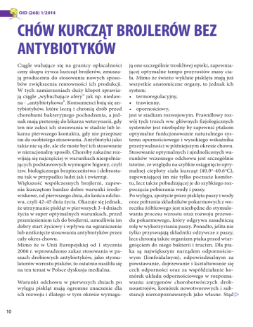 OID (268) 1/2014 CHÓW KURCZĄT BROJLERÓW BEZ ANTYBIOTYKÓW Ciągle wahające się na granicy opłacalności ceny skupu żywca kurcząt brojlerów, zmuszają producenta do stosowania nowych sposobów zwiększenia rentowności ich produkcji. W tych zamierzeniach duży kłopot sprawiają ciągle „wybuchające afery” jak np. niedawna - „antybiotykowa”. Konsumenci boją się antybiotyków, które leczą i chronią drób przed chorobami bakteryjnego pochodzenia, a jednak mają pretensję do lekarza weterynarii, gdy ten nie zaleci ich stosowania w stadzie lub lekarza pierwszego kontaktu, gdy nie przepisze im do osobistego stosowania. Antybiotyki jako takie nie są złe, ale złe może być ich stosowanie w nieracjonalny sposób. Choroby zakaźne rozwijają się najczęściej w warunkach niespełniających podstawowych wymogów higieny, czyli tzw. biologicznego bezpieczeństwa i dobrostanu tak w przypadku ludzi jak i zwierząt. Większość współczesnych brojlerni, zapewnia kurczętom bardzo dobre warunki środowiskowe, od pierwszego dnia, do końca odchowu, czyli 42-45 dnia życia. Okazuje się jednak, że utrzymanie piskląt w pierwszych 3-4 dniach życia w super optymalnych warunkach, przed przeniesieniem ich do brojlerni, umożliwia im dobry start życiowy i wpływa na ograniczenie lub uniknięcie stosowania antybiotyków przez cały okres chowu. Mimo że w Unii Europejskiej od 1 stycznia 2006 r. wprowadzono zakaz stosowania w paszach drobiowych antybiotyków, jako stymulatorów wzrostu ptaków, to ostatnio nasiliła się na ten temat w Polsce dyskusja medialna. Warunki odchowu w pierwszych dniach po wylęgu piskląt mają ogromne znaczenie dla ich rozwoju i dlatego w tym okresie wymaga10 ją one szczególnie troskliwej opieki, zapewniającej optymalne tempo przyrostów masy ciała. Mimo że świeżo wyklute pisklęta mają już wszystkie anatomiczne organy, to jednak ich system: • termoregulacyjny, • trawienny, • opornościowy, jest w stadium rozwojowym. Prawidłowy rozwój tych trzech ww. głównych fizjologicznych systemów jest niezbędny by zapewnić ptakom optymalne funkcjonowanie naturalnego systemu opornościowego i wysokiego wskaźnika przeżywalności w późniejszym okresie chowu. Stosowanie optymalnych i ujednoliconych warunków wczesnego odchowu jest szczególnie istotne, ze względu na szybkie osiągnięcie optymalnej ciepłoty ciała kurcząt (40.0o-40.6oC), zapewniającej im nie tylko poczucie komfortu, lecz także pobudzającej je do szybkiego rozpoczęcia pobierania wody i paszy. Po wylęgu, spożycie przez pisklęta paszy i wody oraz pobrania składników pokarmowych z woreczka żółtkowego jest niezbędne do stymulowania procesu wzrostu oraz rozwoju przewodu pokarmowego, który odgrywa zasadniczą rolę w wykorzystaniu paszy. Ponadto, jelita nie tylko przyswajają składniki odżywcze z paszy, lecz chronią także organizm ptaka przed wtargnięciem do niego bakterii i trucizn. Dla ptaka są największym narządem odpornościowym (limfoidalnym), odpowiedzialnym za powstawanie, dojrzewanie i kształtowanie się cech odporności oraz za współdziałanie komórek układu odpornościowego w rozpoznawaniu antygenów chorobotwórczych drobnoustrojów, komórek nowotworowych i substancji nierozpoznawanych jako własne. Stąd AKTUALNOŚCI 11 OID (268) 1/2014 ogromne znaczenie układu trawiennego w prawidłowym działaniu systemu odpornościowego, utrzymującego stan zdrowotny kurcząt na wysokim i niezmiennym poziomie. Stosowanie antybiotyków Brojlernia jest tak zaprojektowana, by w ciągu sześciotygodniowego chowu kurcząt brojlerów, panowały w niej zawsze optymalne warunki środowiskowe, których stworzenie jest jednak trudne w pierwszych dniach po jej zasiedleniu. Dla kilkudniowych piskląt typu brojler, temperatura podłogi i powietrza w brojlerni powinna być taka sama i stale kontrolowana, by ptaki osiągnęły szybko wymaganą ciepłotę ciała. W praktyce okazuje się jednak, że podczas zasiedlania kurnika jednodniowymi pisklętami, temperatura podłogi jest zbyt niska, co powoduje, że pisklęta także mają zbyt niską ciepłotę ciała i wówczas rozwój u nich trzech ww. głównych systemów fizjologicznych, jest opóźniony, na skutek czego pisklęta stają się wrażliwe na działanie czynników zakaźnych. Wg posiadanych przez Maatjens (2013) informacji, w holenderskiej, wielkotowarowej produkcji kurcząt brojlerów, by zapobiec zakażeniom woreczka żółtkowego i zakłóceniom rozwoju przewodu pokarmowego - niestety wbrew obowiązującym zakazom - stosuje się często profilaktycznie antybiotyki w pierwszym tygodniu życia ptaków. Potwierdza to opinię o ważności zapewnienia kurczętom na początku ich życia, optymalnych warunków odchowu, żeby chronić je przed chorobami. Jednym ze sposobów stworzenia 1-4 dniowym pisklętom znakomitych warunków środowiskowych może być wygrodzenie kotarą 1/3 powierzchni brojlerni. Pozostałości antybiotyków Antybiotyki (z greki „anti” - przeciw, „bios” - życie), są naturalnymi, wtórnymi, organicznymi produktami metabolizmu drobnoustrojów, które działając wybiórczo w niskich stężeniach, wpływają na struktury komórkowe lub 12 procesy metaboliczne innych drobnoustrojów, głównie bakterii, hamując ich wzrost i podziały. Dlatego stosuje się je leczniczo - w przypadku wszelkich zakażeń bakteryjnych, a także profilaktycznie - przeciw takim zakażeniom. Mimo tych zalet, takie ich stosowanie może prowadzić do wytworzenia się w organizmie na nie oporności, w wyniku której bakterie stają się mniej albo zupełnie nie wrażliwe na określone antybiotyki. Oporność pojawia się, gdy antybiotyki są stosowane nienależycie, np. w zbyt małych lub w zbyt dużych - najczęściej w celach zapobiegawczych - dawkach lub przy stosowaniu ich w celach leczniczych i to szczególnie w przypadku chorób wywołanych wirusami, wobec których są nieskuteczne. Obecnie poznano już odpo