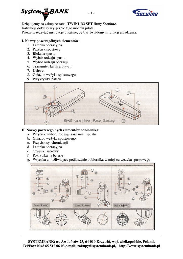-1Dziękujemy za zakup zestawu TWIN1 R3 SET firmy Seculine. Instrukcja dotyczy wyłącznie tego modelu pilota. Proszę przeczytać instrukcję uważnie, by być świadomym funkcji urządzenia. I. Nazwy poszczególnych elementów: 1. Lampka operacyjna 2. Przycisk spustowy 3. Blokada spustu 4. Wybór rodzaju spustu 5. Wybór rodzaju operacji 6. Transmiter fal laserowych 7. Uchwyt 8. Gniazdo wężyka spustowego 9. Przykrywka baterii II. Nazwy poszczególnych elementów odbiornika: a. Przycisk wyboru rodzaju zasilania i spustu b. Gniazdo wężyka spustowego c. Przycisk synchronizacji d. Lampka operacyjna e. Czujnik laserowy f. Pokrywka na baterie g. Wtyczka umożliwiające podłączenie odbiornika w miejscu wężyka spustowego SYSTEMBANK: os. Awdańców 23, 64-010 Krzywiń, woj. wielkopolskie, Poland, Tel/Fax: 0048 65 512 06 03 e-mali: [email protected], http://www.systembank.pl -2III. nstalacja baterii: 1. Otworzyć pokrywkę baterii, jeżeli jest ona zamknięta 2. Skupić uwagę na stronach +/- baterii, a następnie odpowiednio ją zainstalować 3. Zamknąć pokrywkę baterii IV. Wybór rodzaju operacji: 1. Pilot R3-SET posiada trzy typy operacji – uniwersalny pilot laserowy, system odbioru prywatnego oraz tryb latarki. 2. Tryb operacji może być konfigurowany przez przycisk wyboru operacji. 3. Jeśli docelowy aparat posiada zintegrowany odbiornik podczerwieni i odbiornik ten jest używany do odbioru sygnału IR, powinno się użyć uniwersalnego spustu. Przycisk wybory operacji powinien być ustawiony na LIT. 4. Jeśli używany jest dodatkowy (zewnętrzny) odbiornik podczerwieni firmy Seculine odbiornik, należy ustawić opcję odbioru prywatnego. Przycisk wybory operacji powinien być ustawiony na ¤. 5. Jeśli przycisk wyboru operacji ustawiony jest na (żarówkę) to R3-SET pełni funkcję latarki. SYSTEMBANK: os. Awdańców 23, 64-010 Krzywiń, woj. wielkopolskie, Poland, Tel/Fax: 0048 65 512 06 03 e-mali: [email protected], http://www.systembank.pl -3V. Włączanie i wyłączanie zasilania odbiornika: 1. Wybór rodzaju zasilania i rodzaju spustu ustawić w prawidłowej pozycji. Do wyboru tryb odbiornika wyłączonego – OFF, tryb pilota laserowego, tryb wężyka spustowego – ON, tryb długiego naświetlania - BULB 2. Jeżeli odbiornik nie jest podłączony do aparatu, a jego zasilanie jest włączone to po 5 minutach nastąpi automatyczne odłączenie zasilania odbiornika. Włączenie zasilania odbiornika nastąpi po ponownym podłączeniu go do aparatu. VI. Wybór rodzaju spustu w odbiorniku: 1. Odbiornik ma dwa typy spustu, normalny pilot radiowy i tryb wężyka spustowego. 2. Ustaw odbiornik na ON, aby uzyskać tryb spustu normalnego. 3. Ustaw odbiornik na BULB, aby uzyskać tryb długiego czasu naświetlania. Jedno przyciśnięcie klawisza spustu spowoduje otwarcie spustu docelowego aparatu, nastąpi rozpoczęcie naświetlania kompozycji. Ponownie wciśnięcie klawisza spustu spowoduje jego zamknięcie. VII. Synchronizacja pomiędzy nadajnikiem, a odbiornikiem: 1. Przed użyciem zestawu TWIN1 R3 należy ustawić synchronizację pomiędzy pilotem, a odbiornikiem. 2. Wystarczy raz ustawić synchronizację. SYSTEMBANK: os. Awdańców 23, 64-010 Krzywiń, woj. wielkopolskie, Poland, Tel/Fax: 0048 65 512 06 03 e-mali: [email protected], http://www.systembank.pl -43. Należy odłączyć kabel, jeżeli jest on podłączony w celu działania ustawionej synchronizacji. 4. Ustaw przycisk wybory operacji nadajnika na ¤, a odbiornik przełącz w tryb ON 5. Naciśnij przycisk synchronizacji odbiornika przez 2 sekundy (igłą), a lampka odbiornika powinna migać. 6. Wyrównaj odległość pomiędzy sensorem nadajnika, a sensorem odbiornika, a następnie naciśnij przycisk spustu. 7. Jeżeli odbiornik odbierze sygnał nadajnika lampka będzie migać szybko, następnie się wyłączy. 8. Naciśnij ponownie przycisk spustu. Konfiguruj wtedy, gdy lampka nadajnika miga normalnie. VIII. Jak używać pilota laserowego aparatami z wbudowanym odbiornikiem podczerwieni: 1. Prosimy ustawić przycisk operacji na LIT. 2. Prosimy rozłączyć kabel wężyka spustowego, jeżeli jest podłączony. 3. Ustawić docelowy aparat w tryb bezprzewodowej kontroli. 4. Prosimy nacisnąć klawisz akcji do końca, aby aparat dobrał ostrość i zrobił zdjęcie. *Niektóre aparaty mogą zrobić zdjęcie bez uprzedniej konieczności dobrania ostrości. W tym celu prosimy zajrzeć do instrukcji obsługi aparatu. IX. Jak używać trybu opóźnionego spustu: 1. Prosimy ustawić przycisk operacji na ··• 2. Prosimy nacisnąć przycisk akcji do końca. Aparat powinien wykonać zdjęcie po 2 sekundach od chwili wciśnięcia klawisza. 3. Dla niektórych modeli firmy Nikon i Pentax, aparaty te powinny być ustawione w trybie opóźnionego spustu. (Opis trybu w instrukcji aparatu) SYSTEMBANK: os. Awdańców 23, 64-010 Krzywiń, woj. wielkopolskie, Poland, Tel/Fax: 0048 65 512 06 03 e-mali: [email protected], http://www.systembank.pl -5- X. Jak używać pilota jako wężyk spustowy: 1. Połączyć nadajnik z aparatem za pomocą kabla. 2. Prosimy nacisnąć przycisk akcji delikatnie, w celu dobrania ostrości przez aparat. 3. Prosimy nacisnąć przycisk do końca, w celu zrobienia zdjęcia. 4. Podczas używania trybu spustu kablowego bateria nie jest używana. XI. Jak używać pilota laserowego z dodatkowym odbiornikiem: 1. Prosimy podłączyć odbiornik do aparatu w miejsce wężyka spustowego. 2. Prosimy ustawić tryb na odbiorniku – ON 3. Prosimy włączyć pilot w trybie kanału indywidualnego. 4. W celu uzyskania optymalnego zasięgu prosimy ostawić odbiornik w odpowiedniej pozycji, natomiast nadajnik prosimy skierować w stronę aparatu. 5. Pilot pracuje jako bezprzewodowy wężyk spustowy zawierając wszystkie jego funkcję, czyli: a) Tryb wyzwalania natychmiastowego – całkowite wciśnięcie klawisza spowoduje wyostrzenie i wyzwolenie migawki b) Tryb przycisku dwuetapowego – dociśnięcie klawisza do połowy